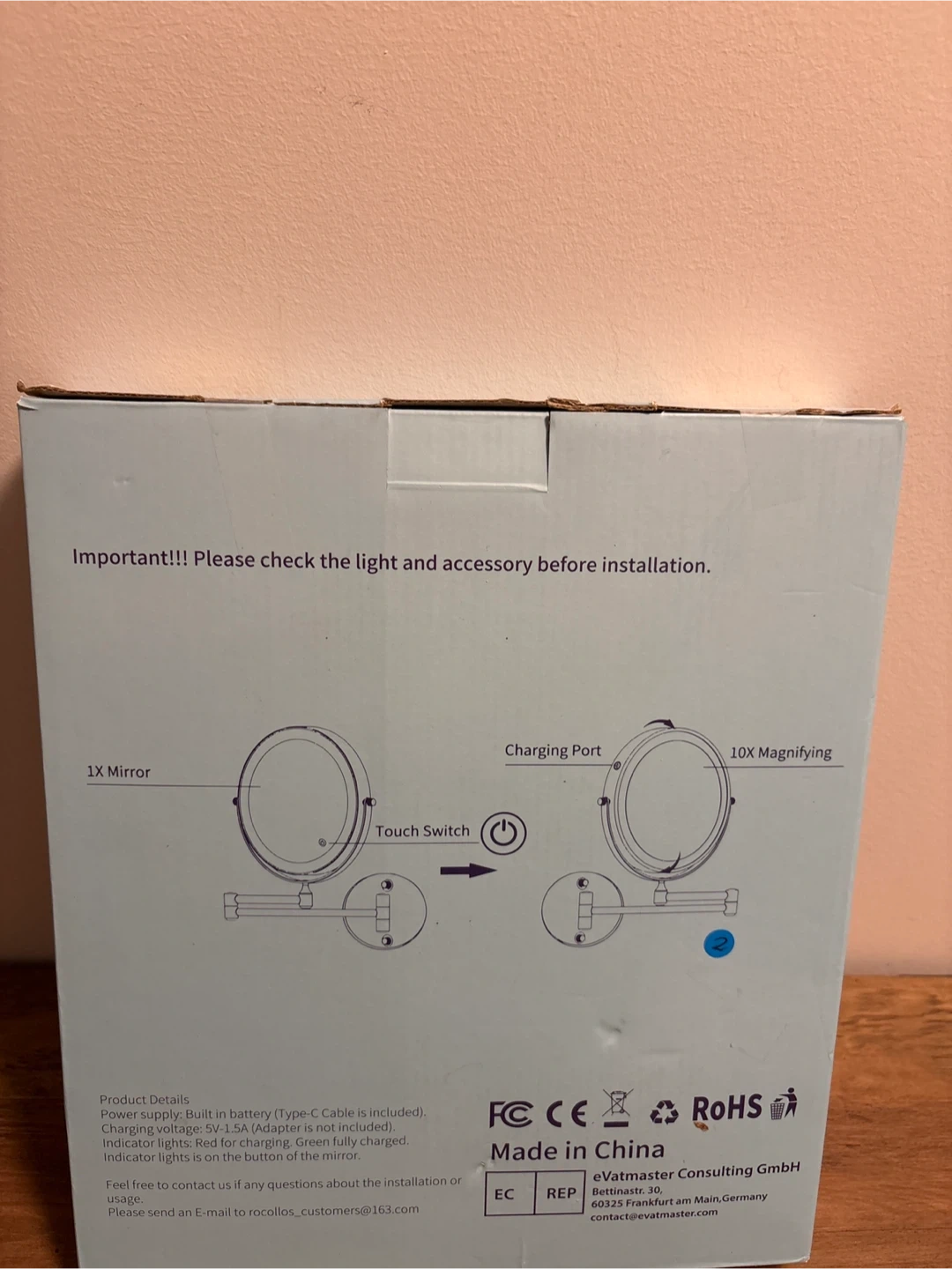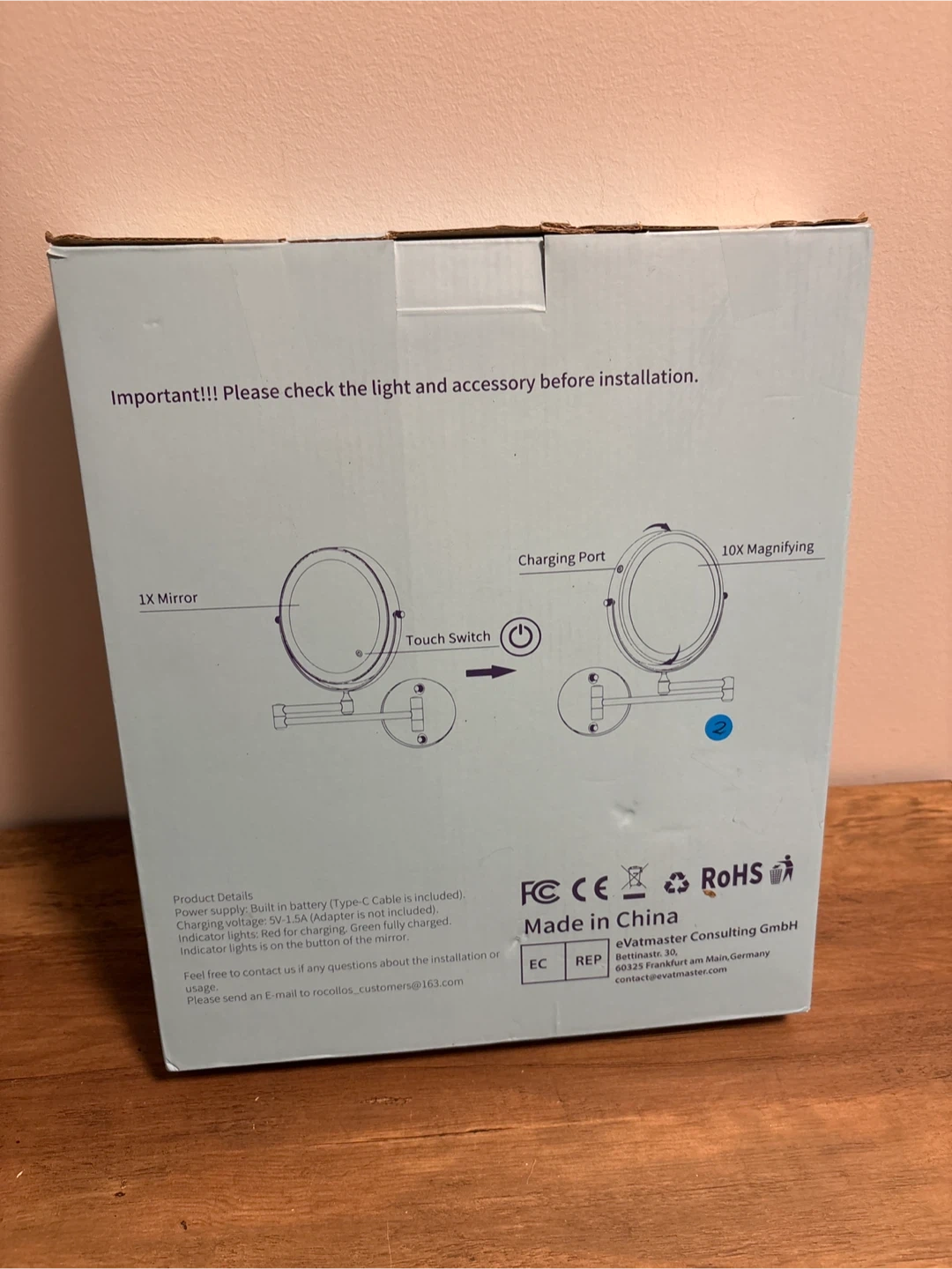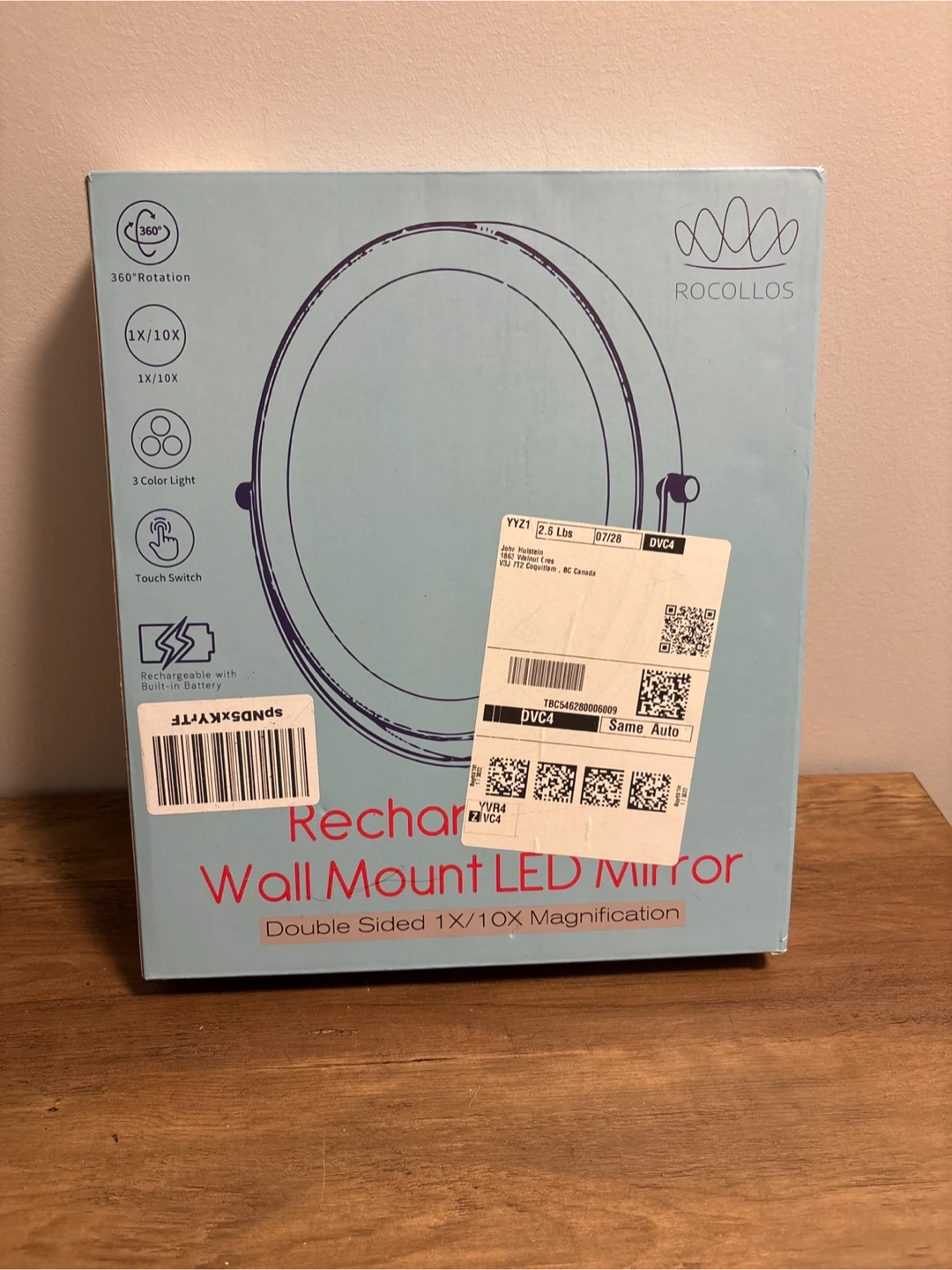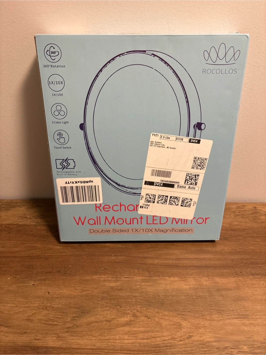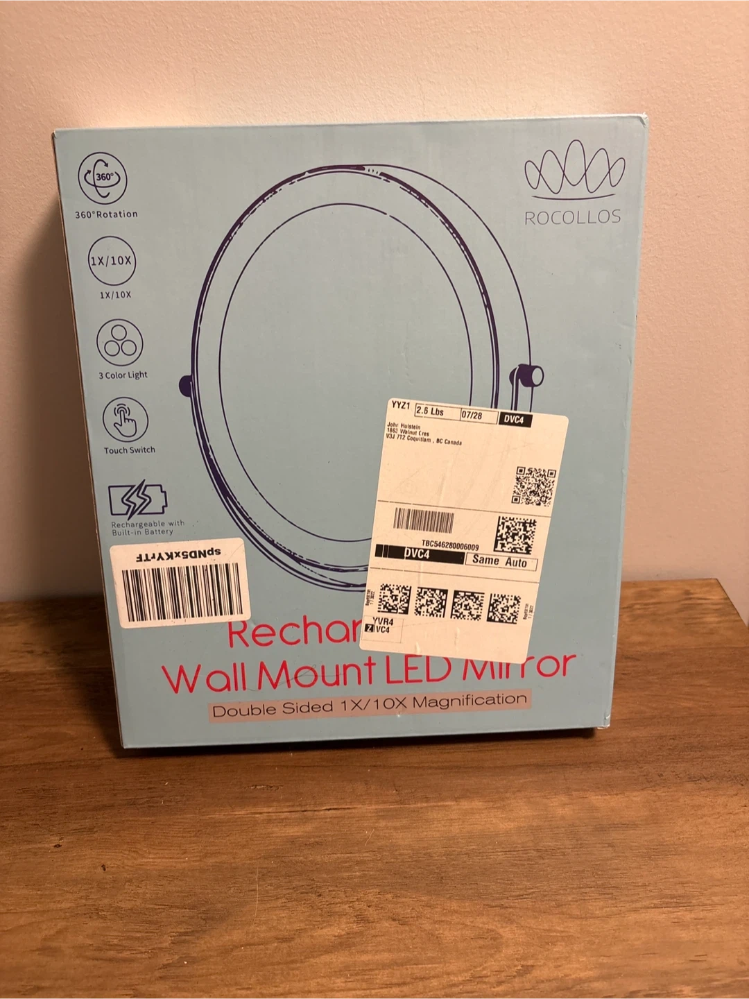 Selling a brand new Rocollos rechargeable wall mount LED mirror, still in its original box! It features: - 360° rotation - Double sided 1X/10X magnification - 3 color light settings - Touch switch - Rechargeable with built-in battery Perfect for your vanity or bathroom