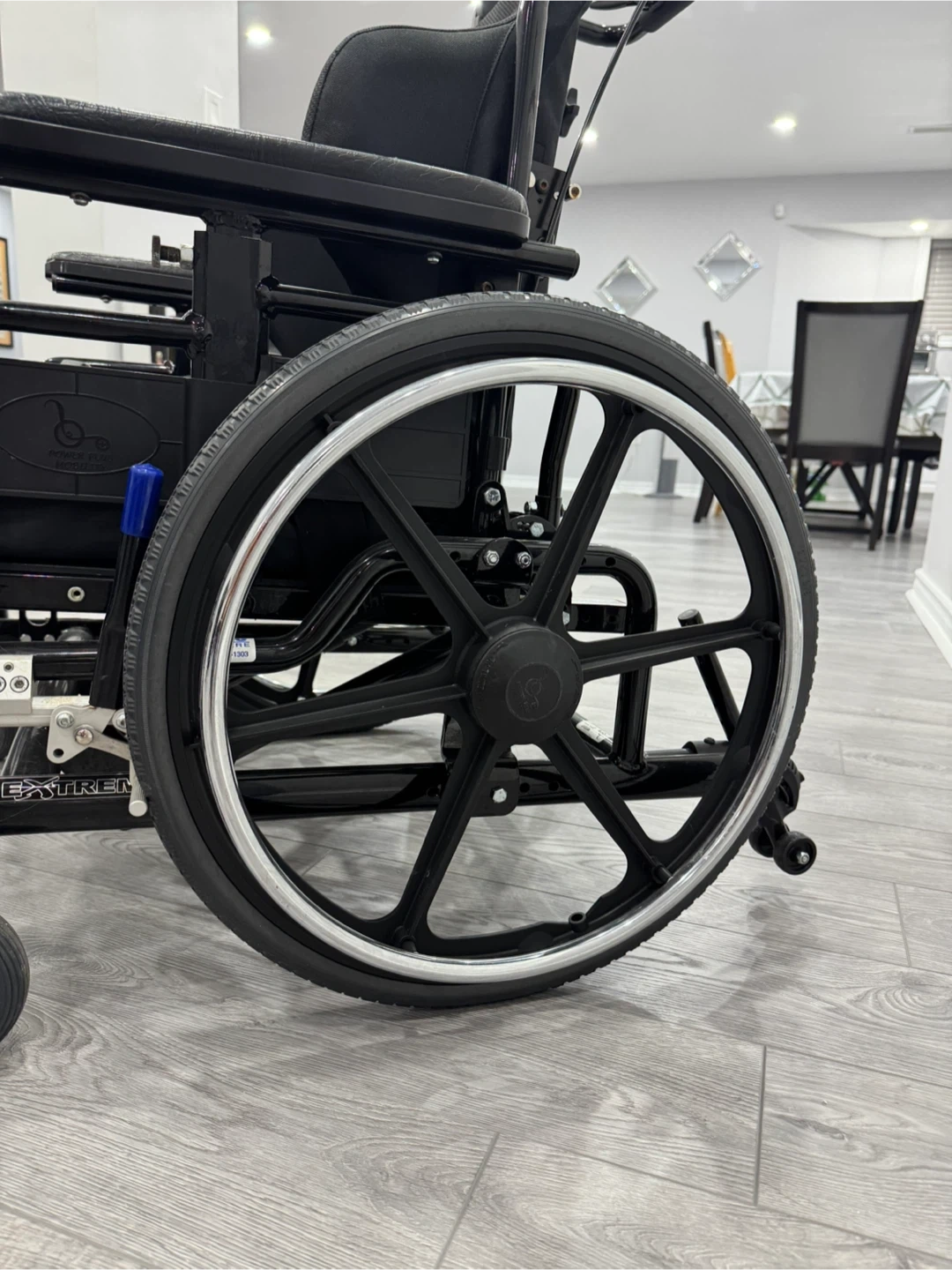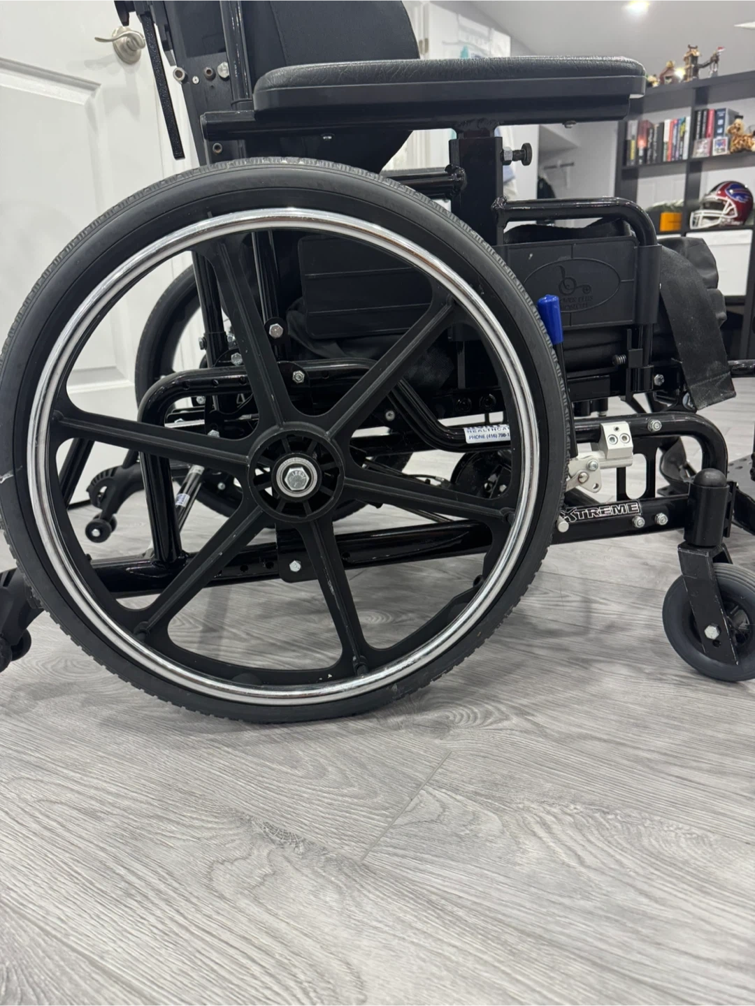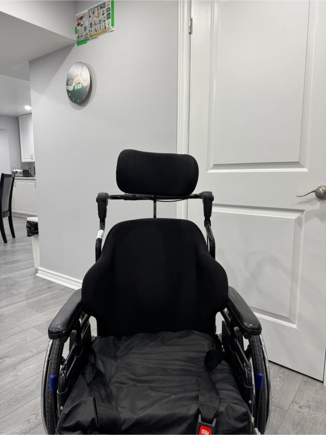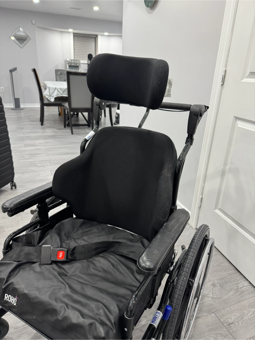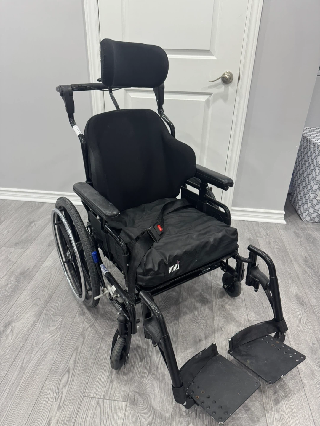 Selling a black tilting wheelchair in great condition. It features a comfortable seat and back support. Perfect for anyone needing mobility assistance. Head restraint, tilt back function.