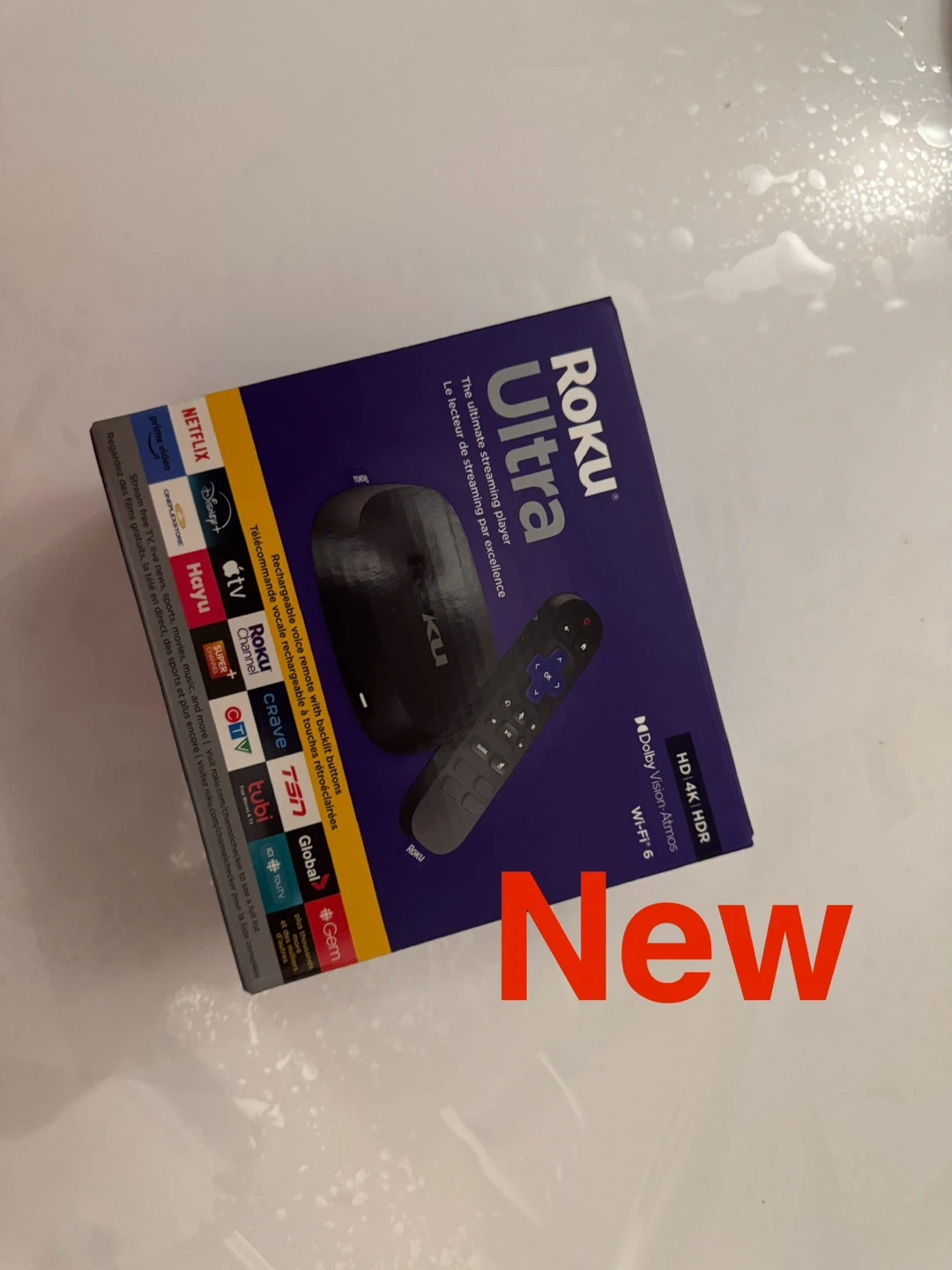 Selling a brand new Roku Ultra streaming player, still in its original box! It is sold $129.99 plus tax in Amazon and used in Amazon it is $113. Enjoy the ultimate streaming experience with HD 4K HDR, Dolby Vision-Atmos, and Wi-Fi 6. It also comes with a rechargeable voice remote with backlit buttons. Get access to Netflix, Disney+, Prime Video, and many more!
