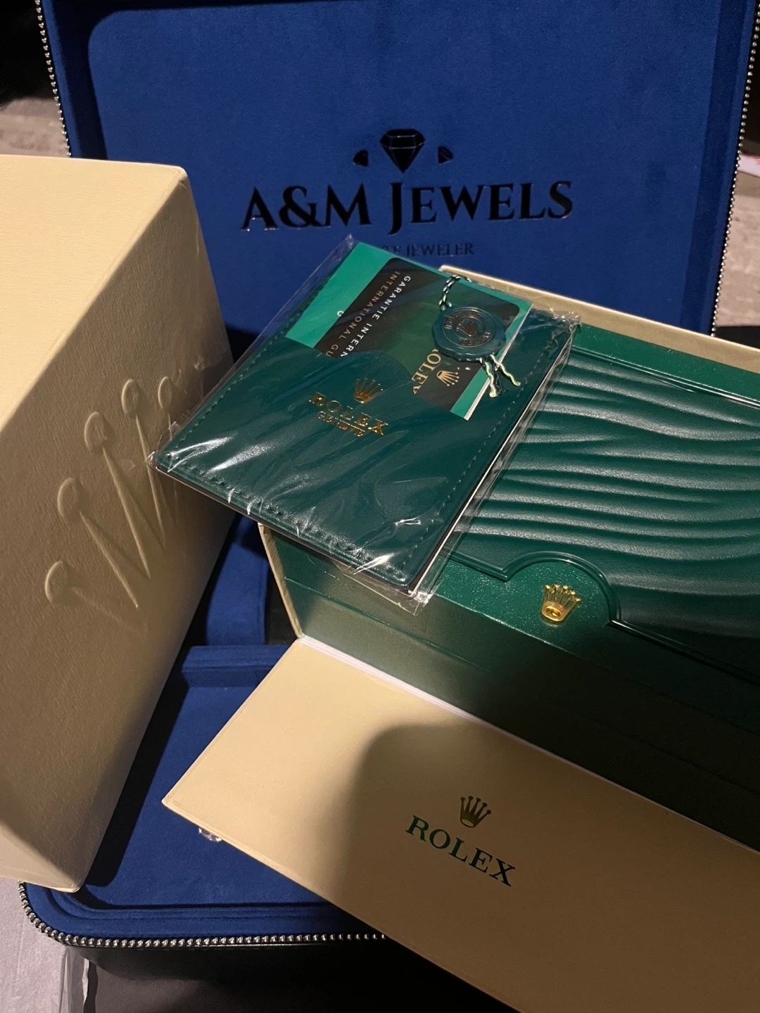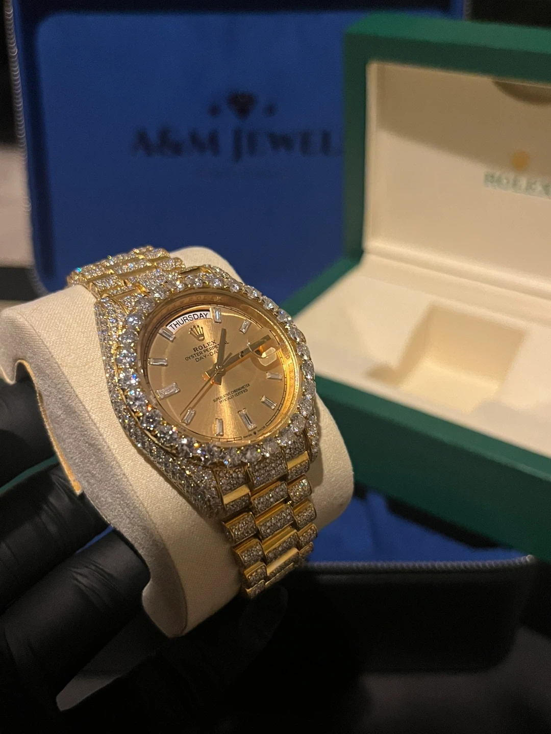 Custom aftermarket VVS1 high quality moissanite bezel, case, and bracelet • Day & Date function (displays full weekday + date) • Automatic movement • 36mm classic size • Comes with box Might be negotiable depending on offer!!