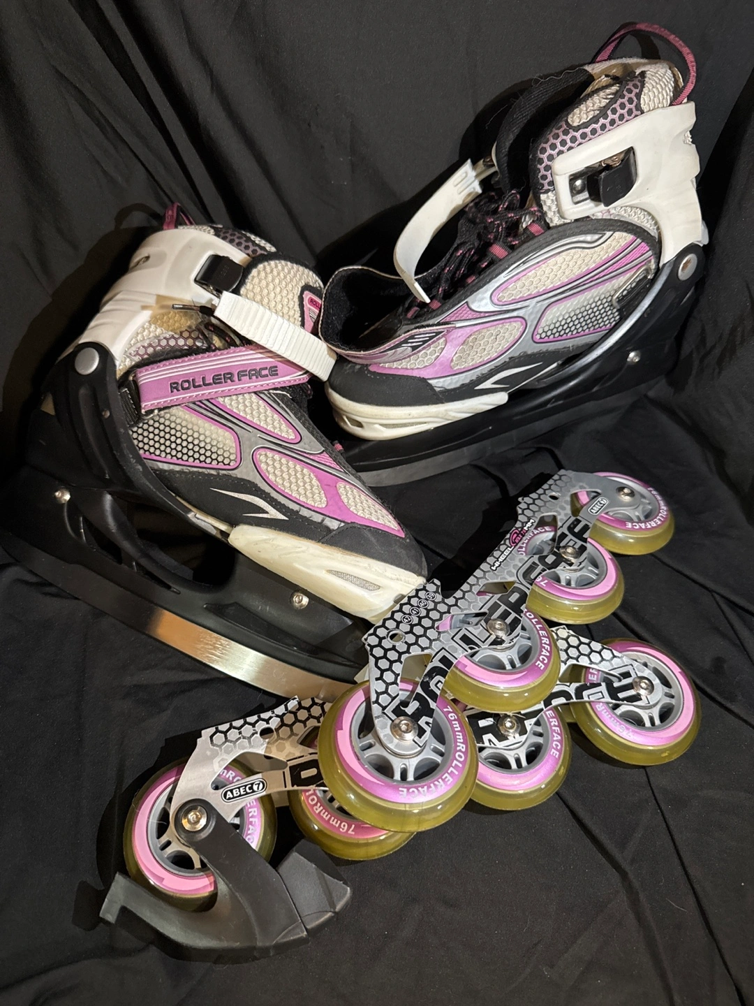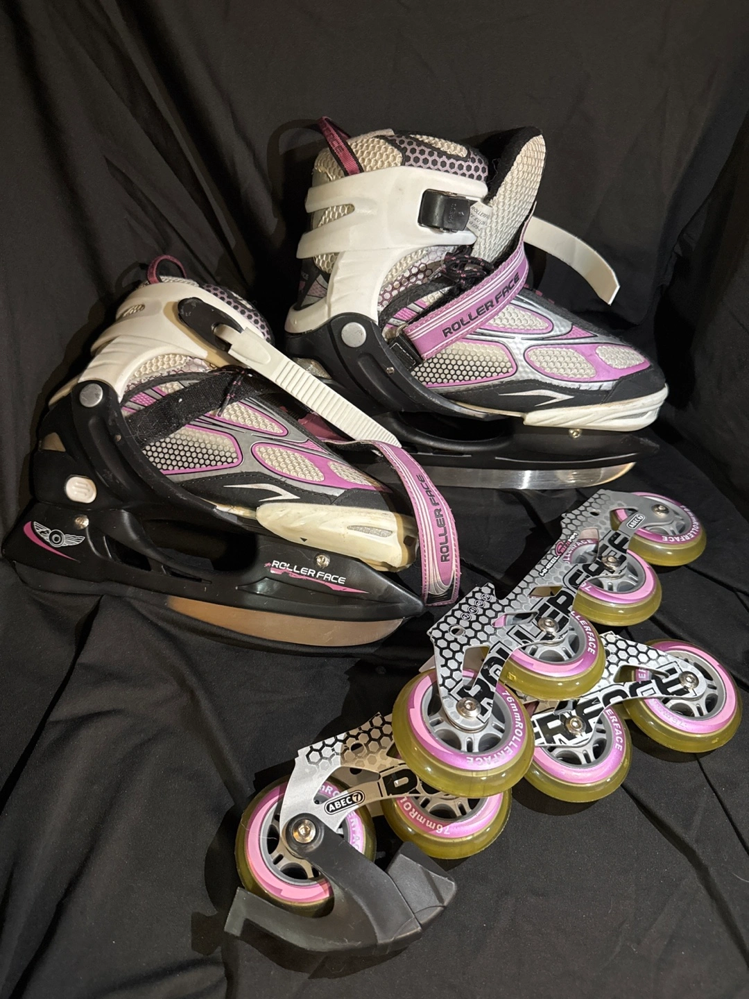 Convertible Roller Face skates that can be used as either ice skates or inline skates! The skates are in good condition and come with both the ice blade and the inline wheel attachments. Great for year-round fun!