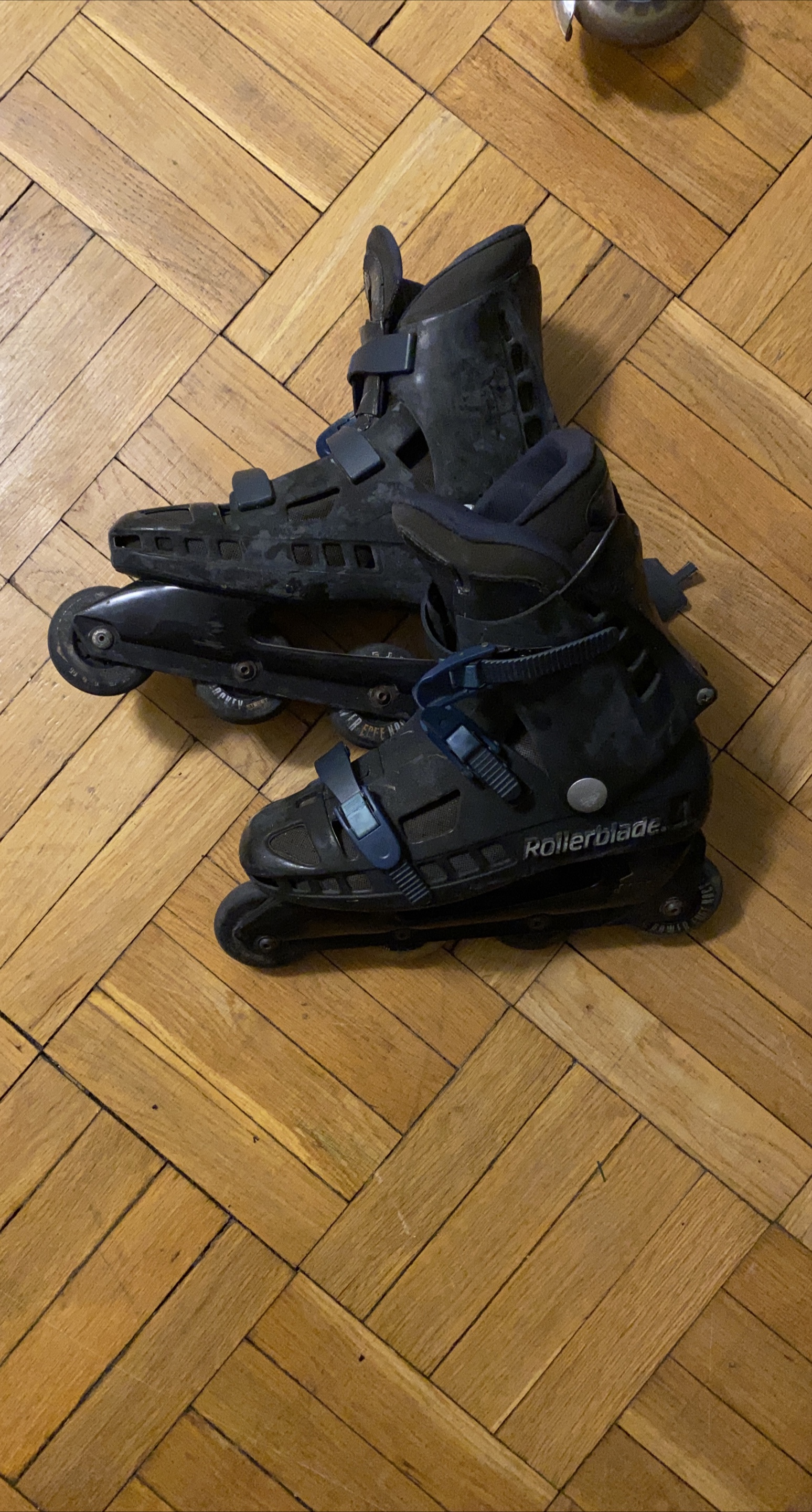 Selling a pair of Rollerblade inline skates. They're black with blue accents and in good condition for getting around town! One of the straps on the foot is broken