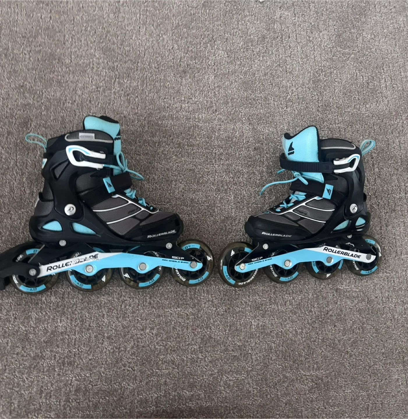 Selling a pair of Rollerblade inline skates. They are black, grey and light blue. Size 6.5 US