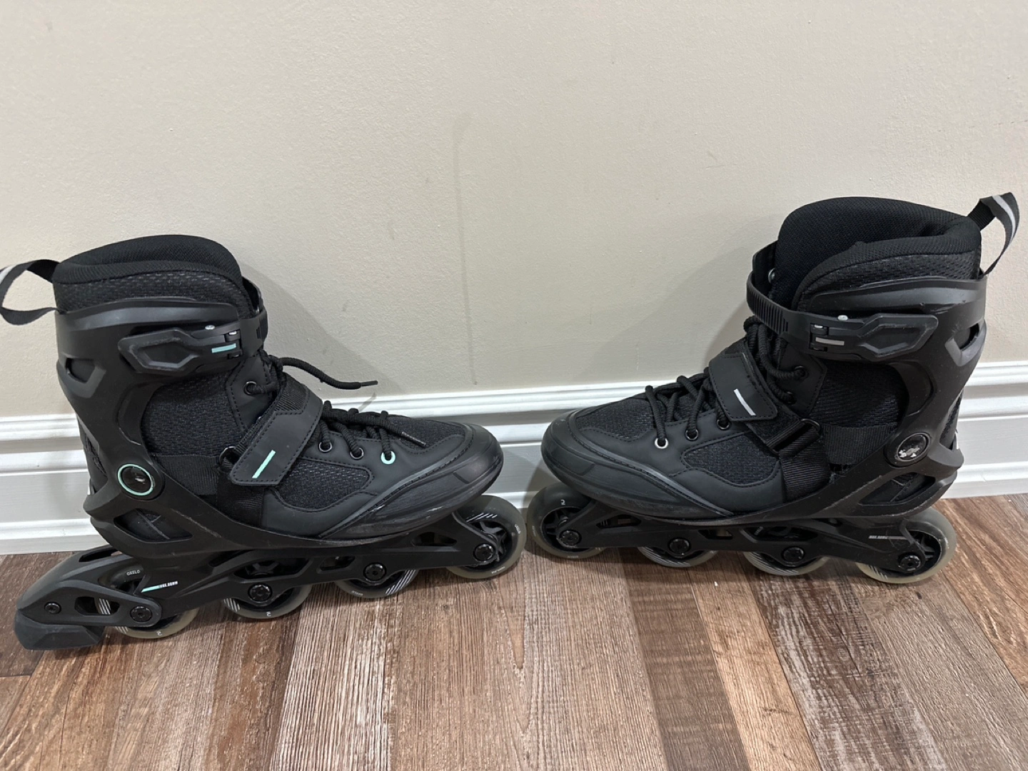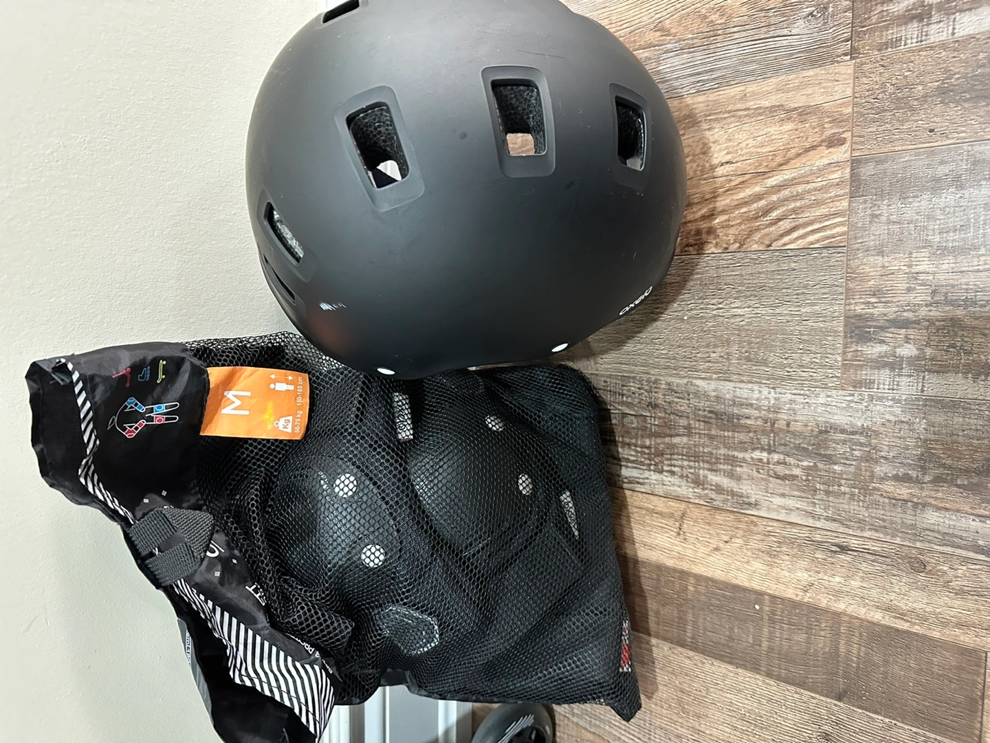 Inline skates, Black rollerblades skates with matching helmet and protective gear. Glove and knee guard size Medium Skater size —US 9.5