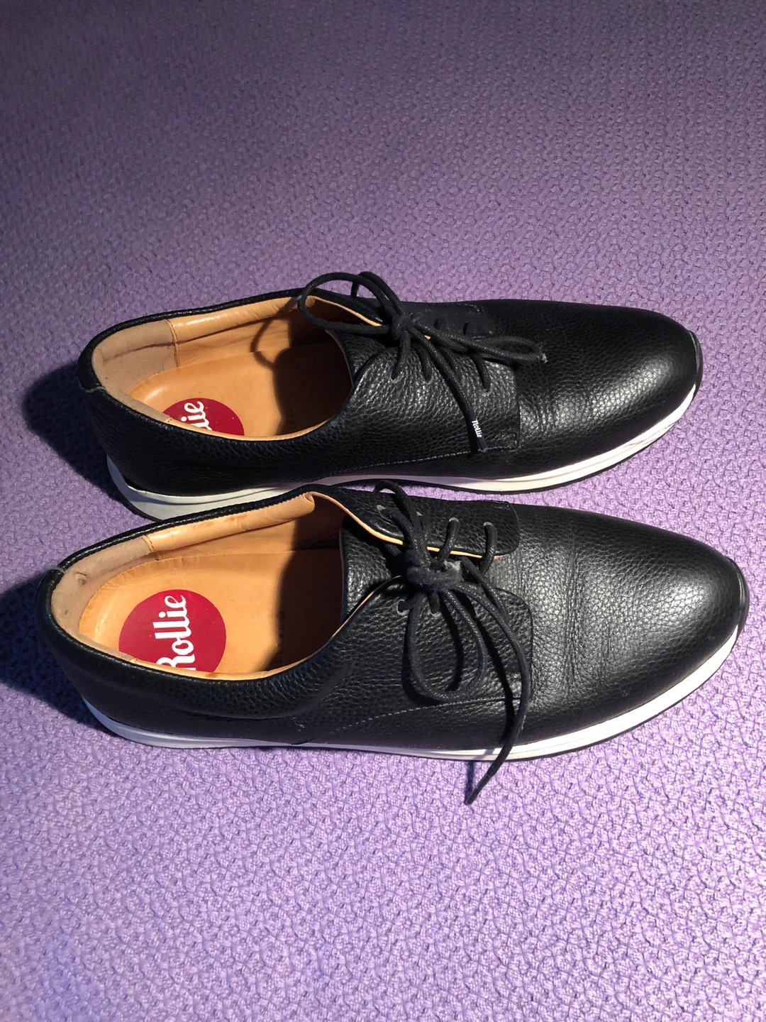 Black tumbled leather lace up oxfords with white sidewalls and black laces. Perfect fall shoe to go with your fave trousers. Casual vibe but not sloppy.