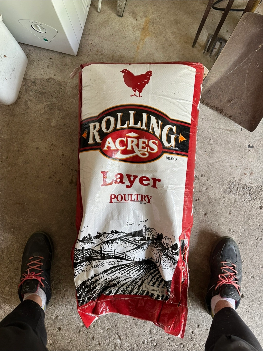 A large bag. The bag is mostly white with red accents. Includes illustrations of a chicken and a farm landscape. Imagine how happy your chickens will be with their favorite food.