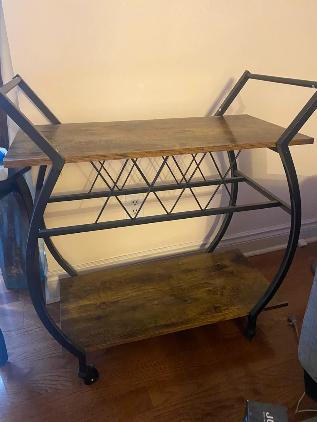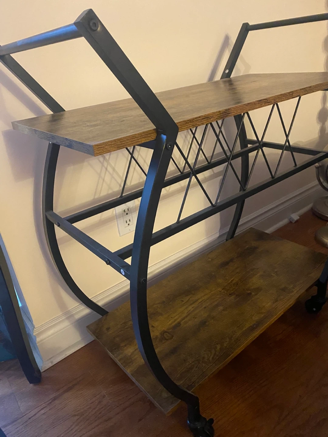 This rolling bar cart is perfect for adding a touch of style and functionality to your home! It features two sturdy wood shelves and a sleek metal frame. Great for entertaining or simply adding extra storage space.