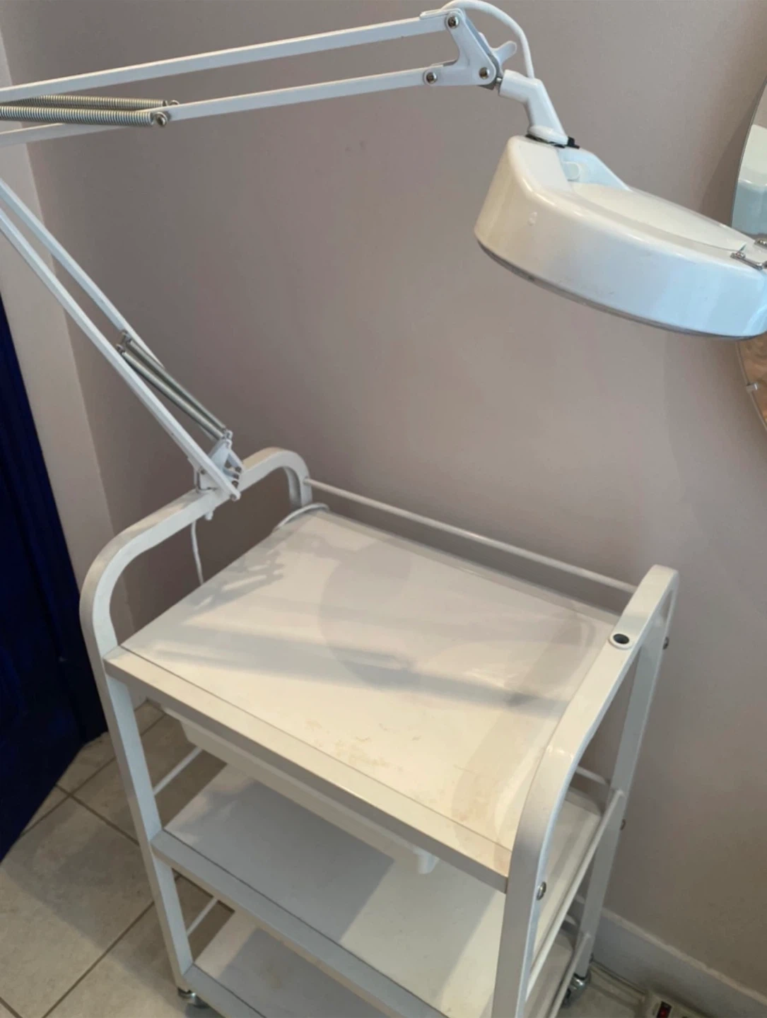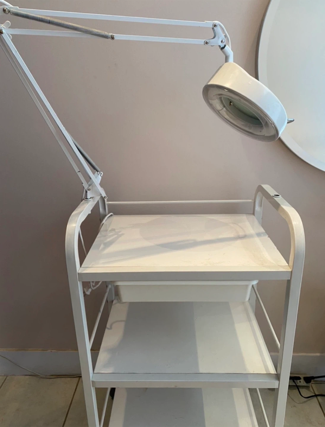 Selling a rolling cart with a magnifying lamp. It features a white metal frame and three shelves, perfect for storage. The magnifying lamp is adjustable, making it ideal for detailed work or hobbies. The cart is in good condition and ready for a new home!