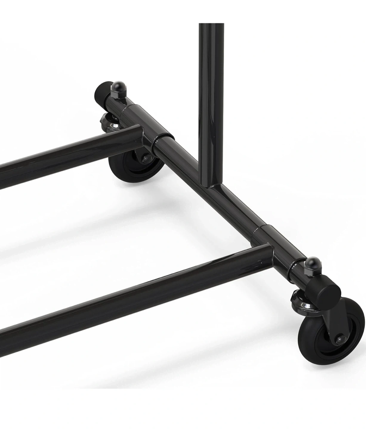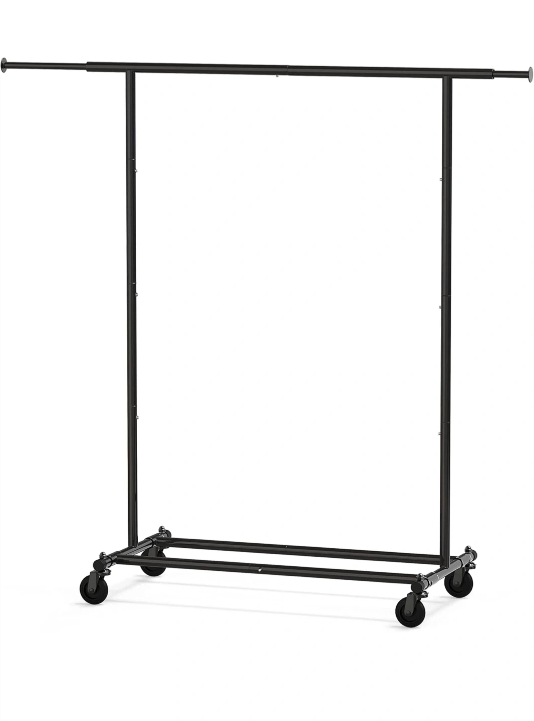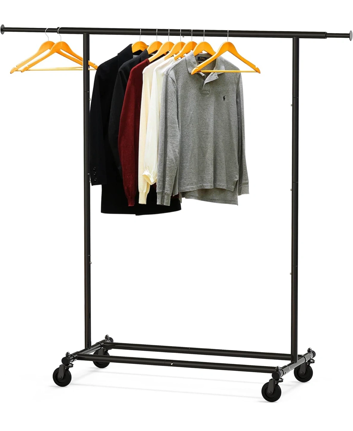 Looking to free up some closet space? This rolling garment rack is perfect! It's black and features an extensible top horizontal rod that adjusts from 40.15" to 65.35". The overall height is 62" and the depth is 18". Great for organizing clothes or creating a pop-up shop display