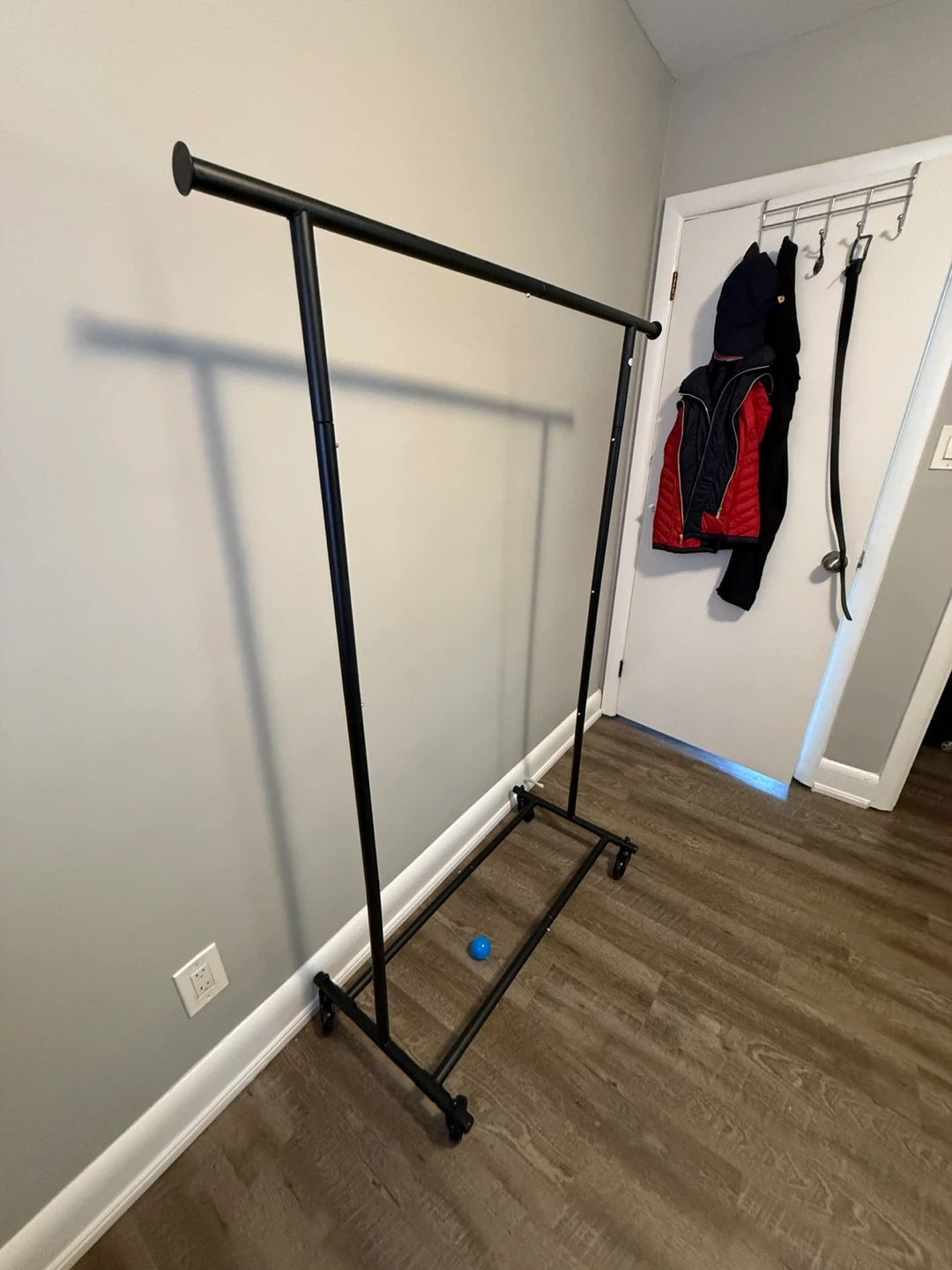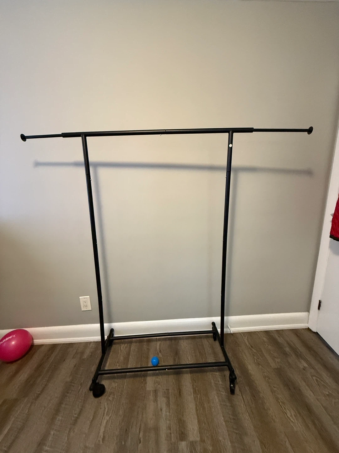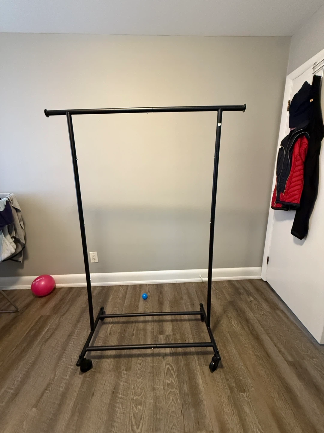 Looking to free up some closet space? This rolling garment rack is perfect! It's black and features an extensible top horizontal rod that adjusts from 40.15" to 65.35". The overall height is 62" and the depth is 18". Great for organizing clothes or creating a pop-up shop display