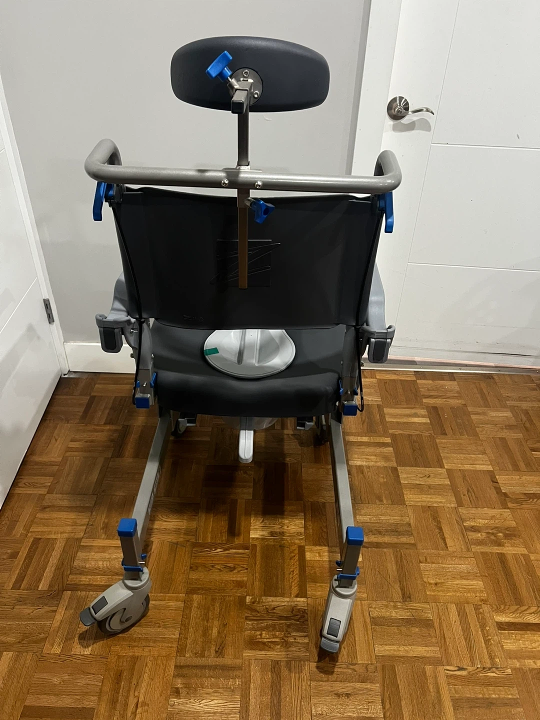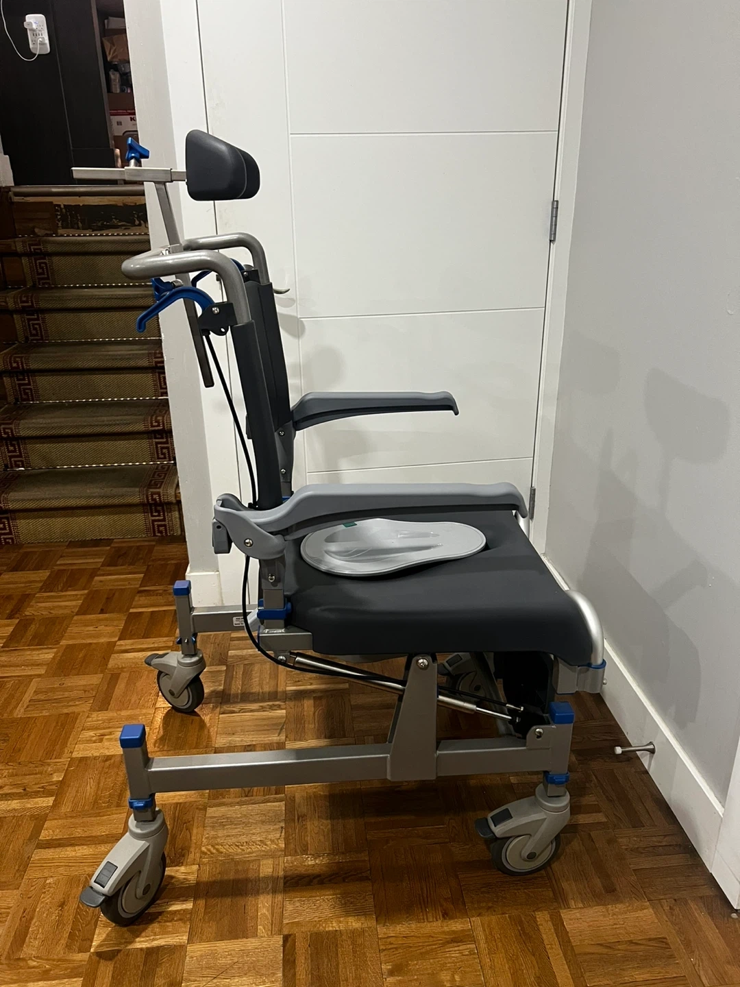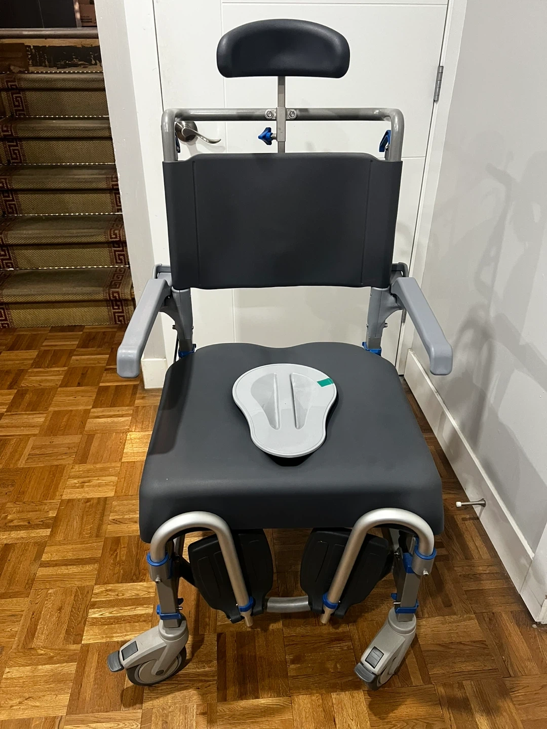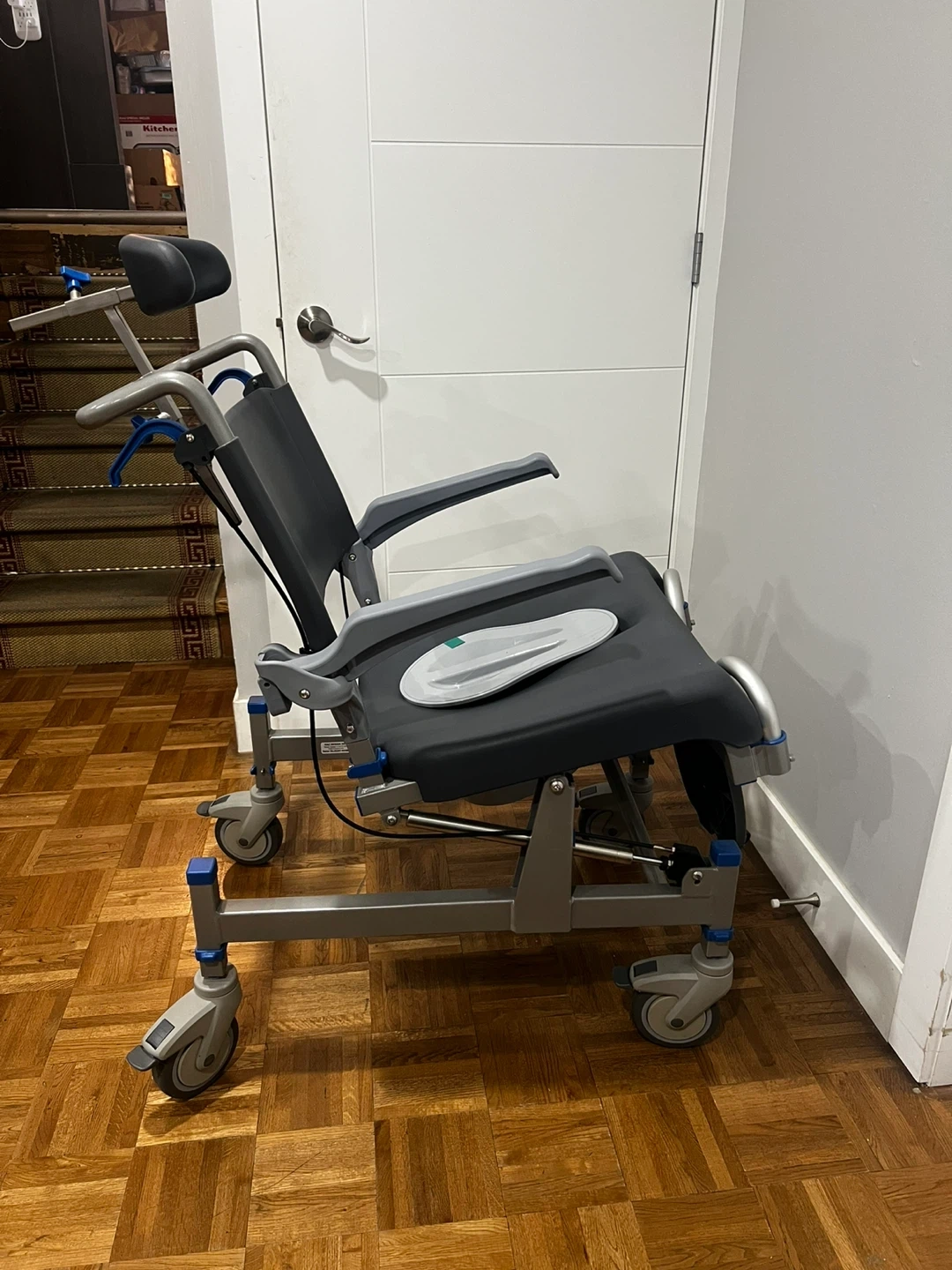 Selling a rolling shower commode chair. It's in brand new condition and ready to use. Great for anyone needing assistance in the bathroom. Has a tilt feature