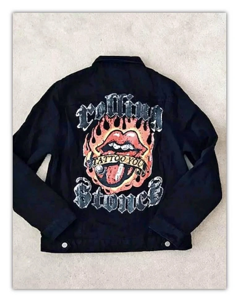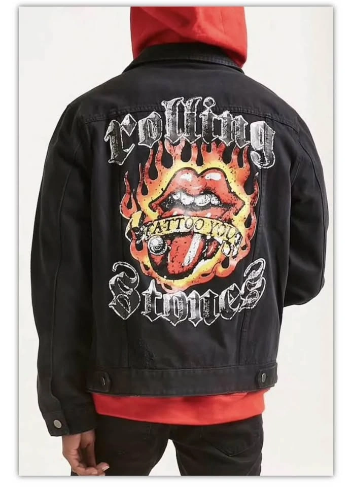 The Rolling Stones Brand New with tags Black Denim Trucker Jacket With Painted Tattoo You Lips Fire Graphics On Back Size : Men’s Small Measurements: Pit to Pit- 20 inches Shoulder to Cuff- 24 inches Shoulder to shoulder- 17 inches Length- 25 inches