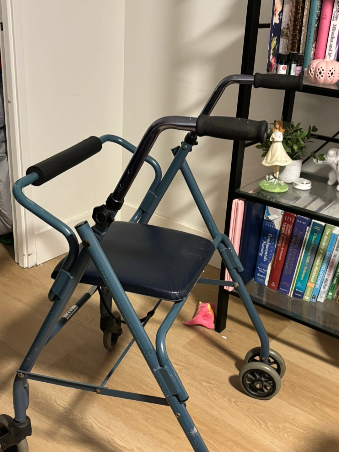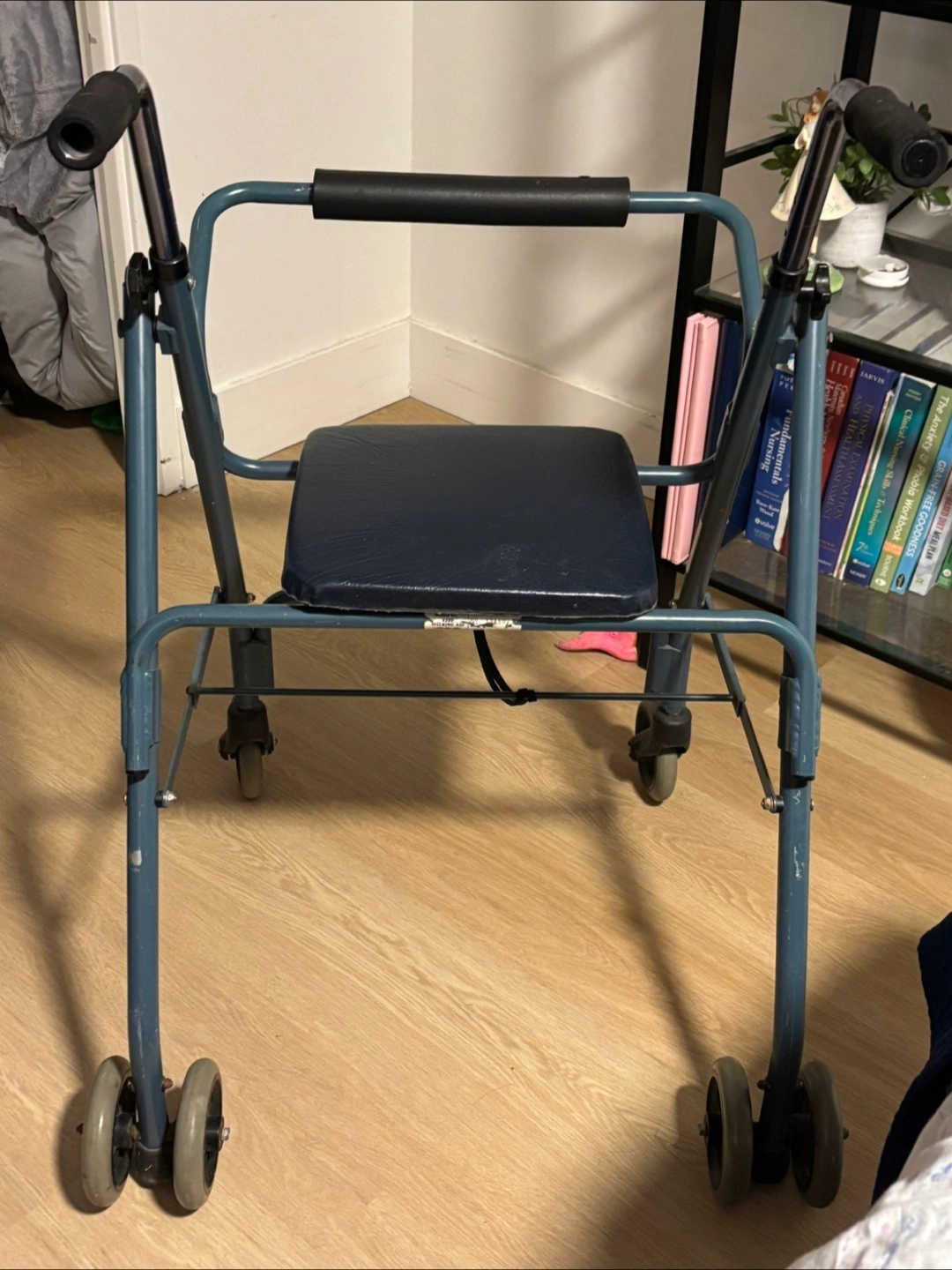 Selling a rolling walker with a seat. It's in good condition and ready to help someone get around with a little extra support. The seat is a great feature for taking a break when needed. It has wheels for easy mobility and handles for a comfortable grip. Perfect for anyone who needs a bit of assistance while walking!