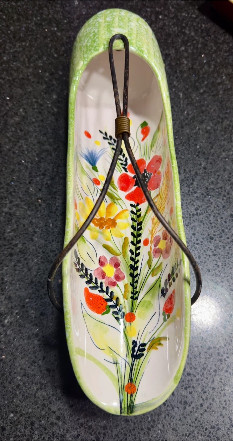 Ceramic breadstick holder from the Bonetti Parma company, 1950s, richly hand-decorated with flowers and with metal support.