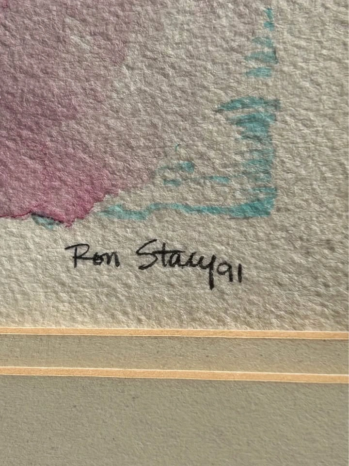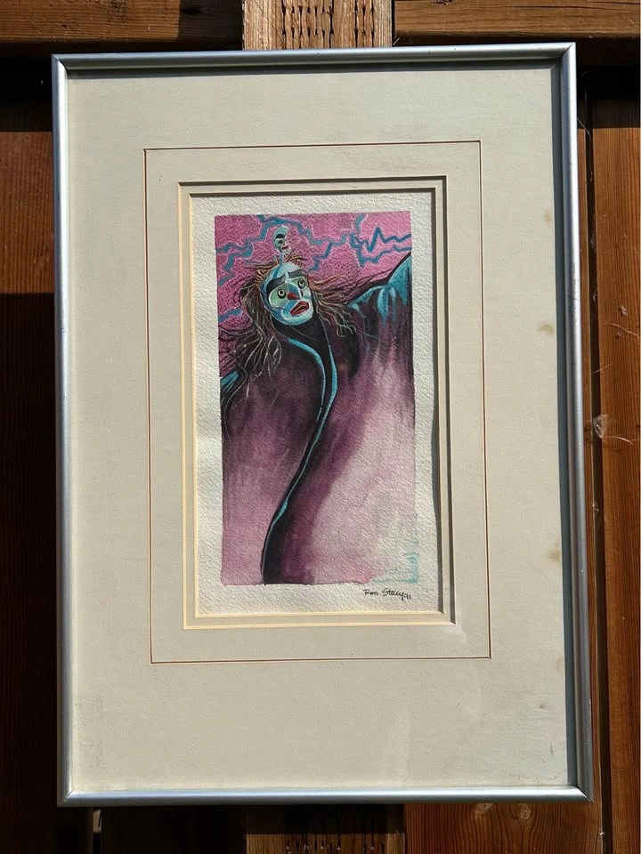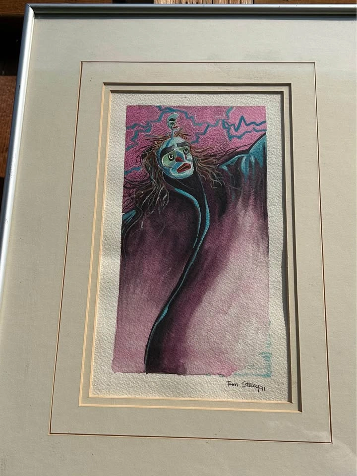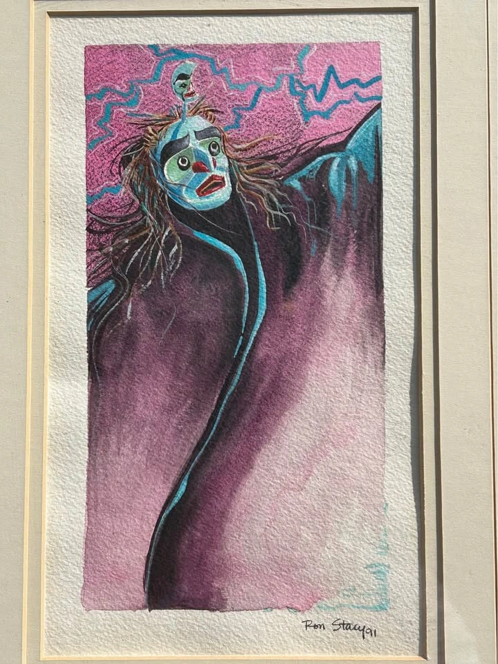 Original 1991 watercolour by Canadian artist Ron Stacy (b. 1943). Signed lower right. Depicts a striking spirit mask figure with a flowing purple background and electric blue accents. Matted and framed under glass. A vibrant and collectible piece of Canadian art. Frame: 16,5”/11,5” Pick up: Seton area, Calgary. See also my other lots. Open to your questions and suggestions. If necessary, I provide additional photos. These are not new things, so please look carefully at the photos and videos. Sizes are submitted on request and also using a tape measure in the photo.