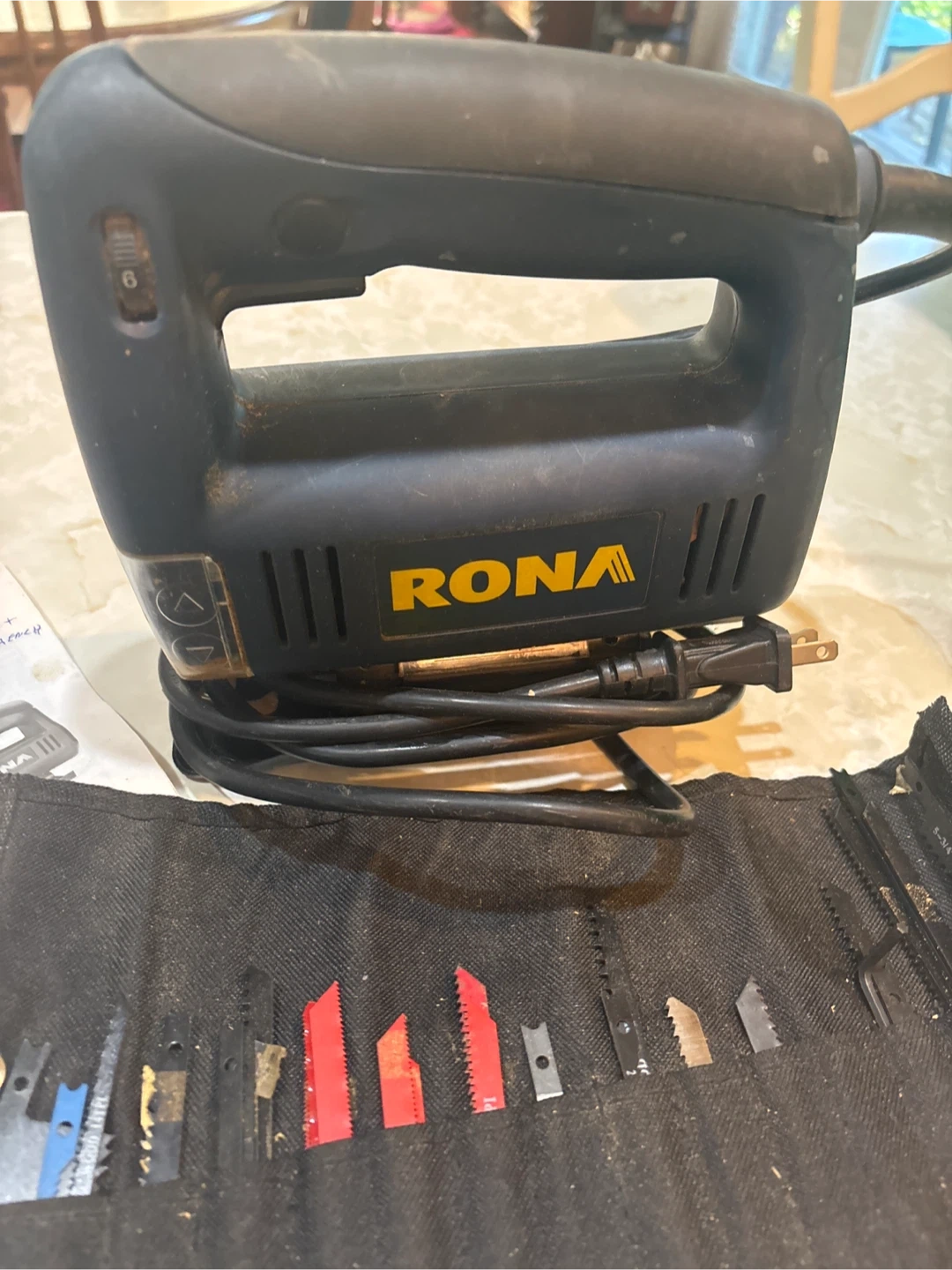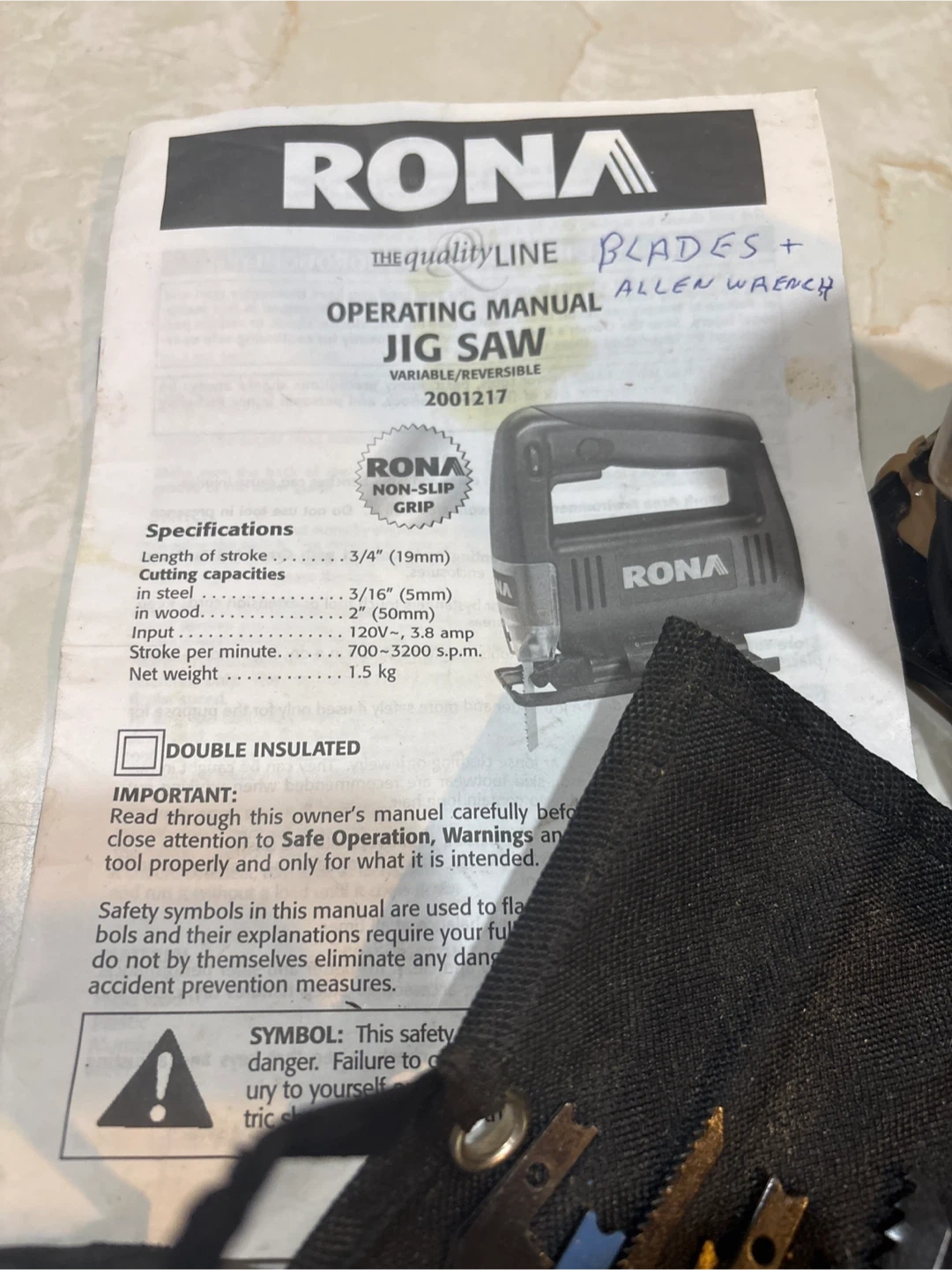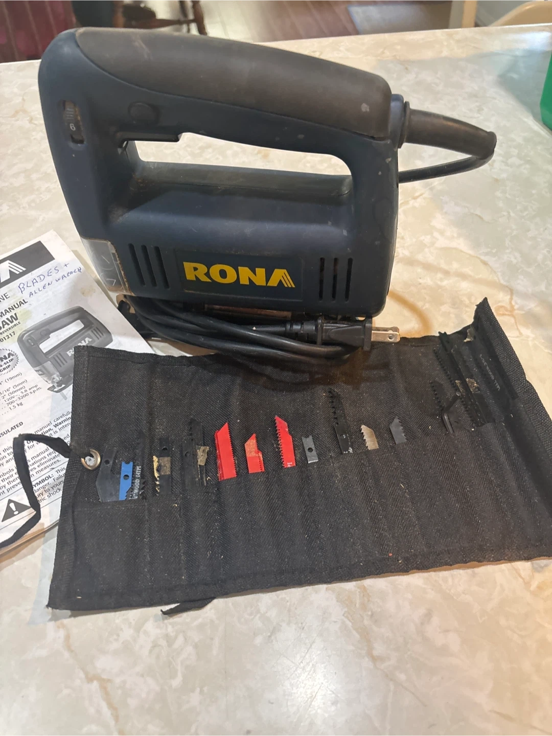 Selling a Rona jig saw, variable and reversible. It comes with an operating manual and a set of blades.