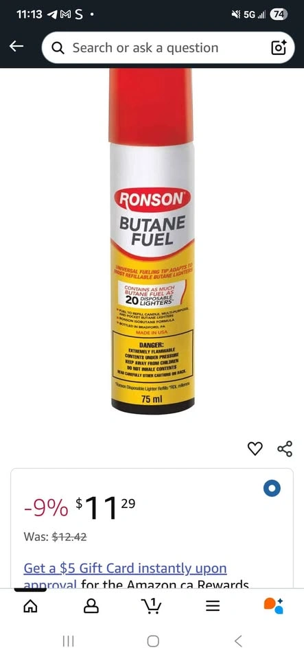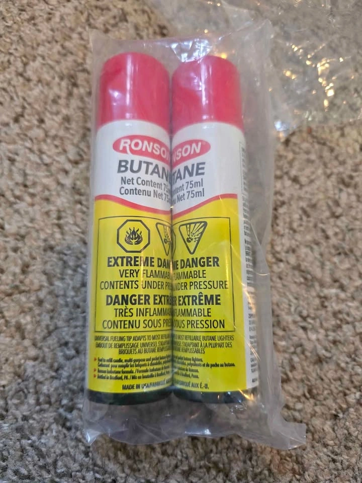 Two sealed cans of Ronson Butane Fuel (75ml each) โ ready to go! Each can contains enough gas to refill up to 20 disposable lighters Universal fueling tip fits most refillable butane lighters Ideal for candles, torches, BBQ lighters & more! $8 for the pair or $15 for two pairs Retail Price: $11.29 each ($22.58 fir a pair) Pickup in Mission, BC โ near Centennial Park