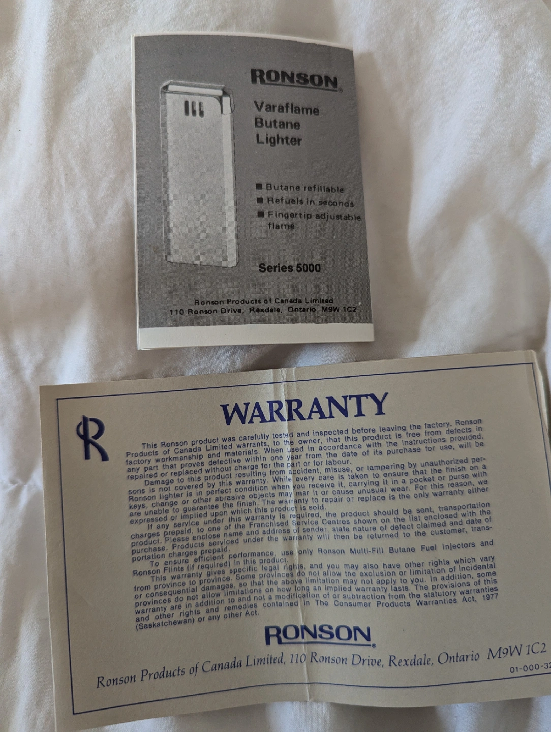 Selling a Ronson Varaflame Butane Lighter, Series 5000. It is butane refillable and refills in seconds. It also features a fingertip adjustable flame. Comes with the original box and warranty information vintage never used still in package
