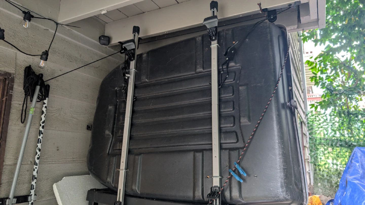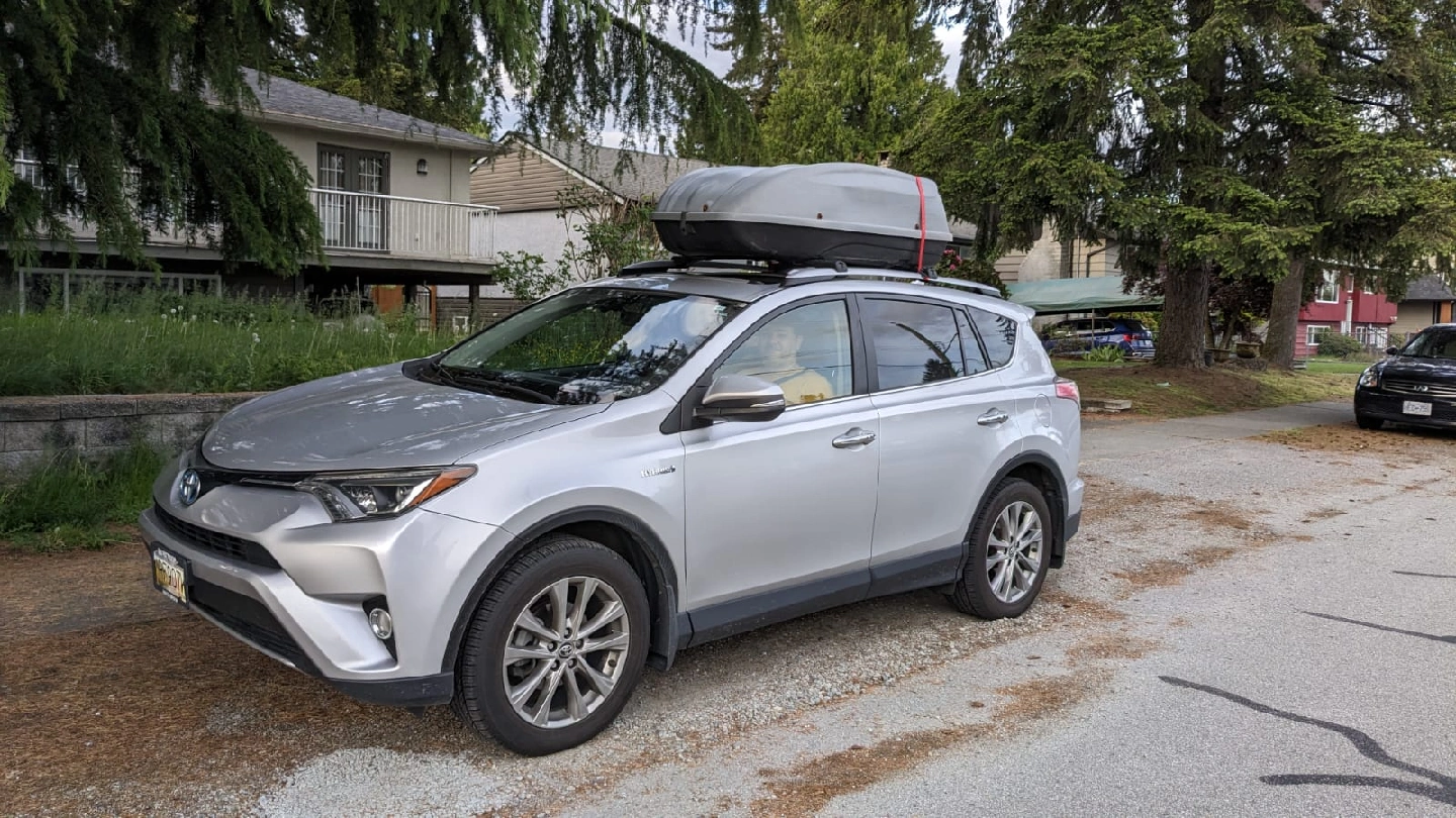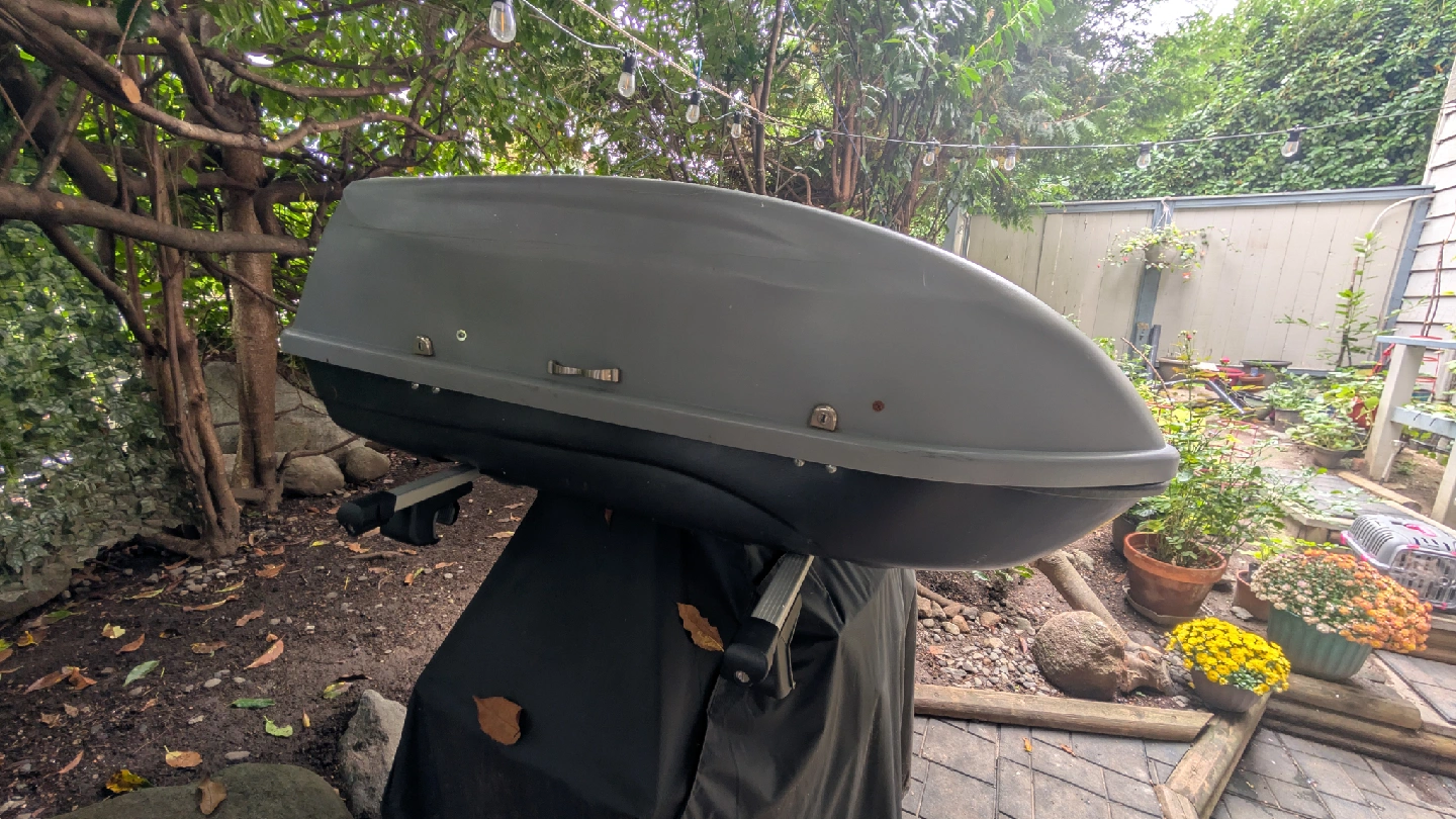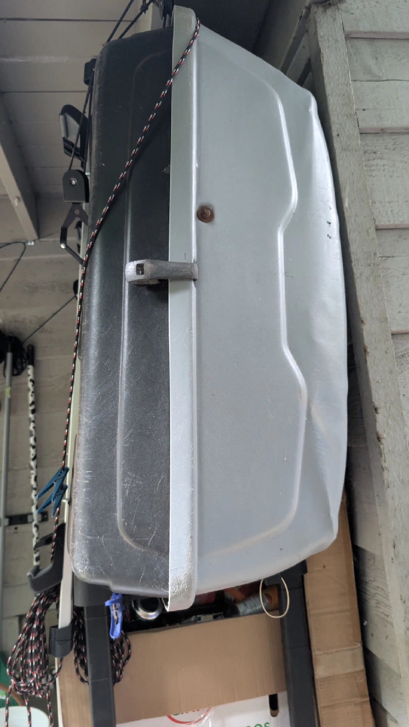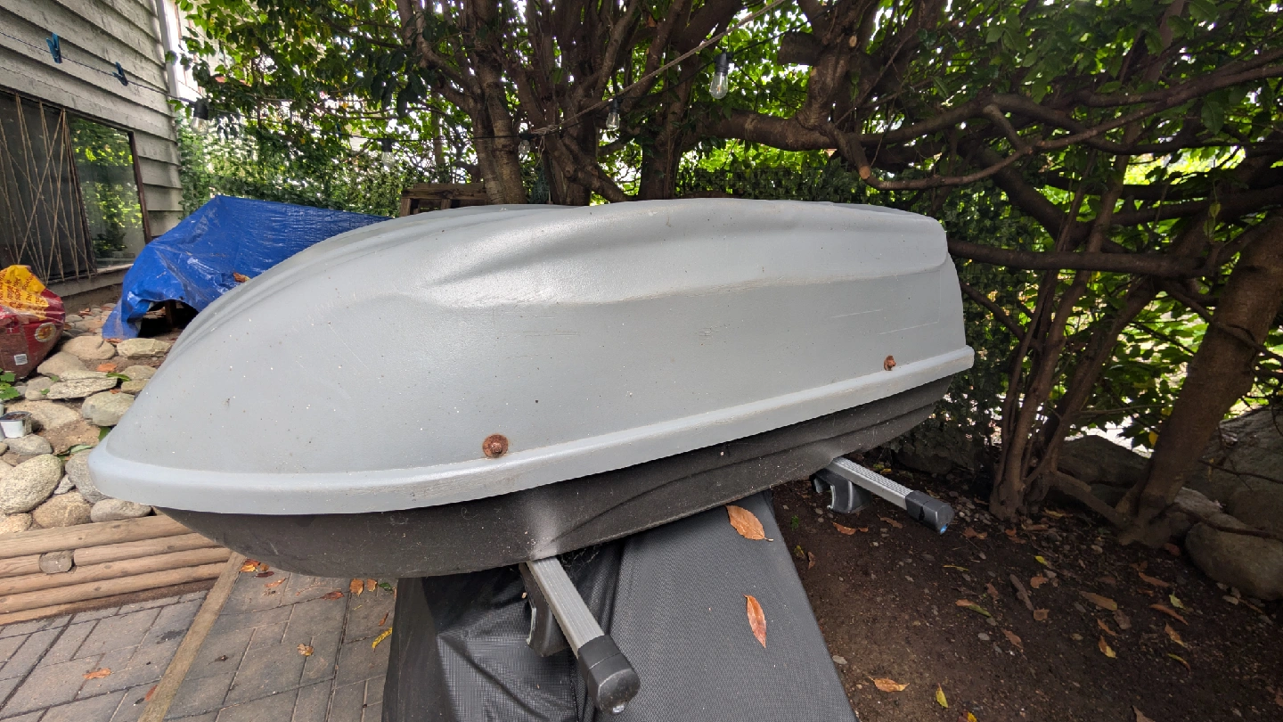 Selling a roof cargo carrier. It's grey on top and black on the bottom. Perfect for extra storage on road trips or camping adventures! It does have some signs and scratches of use. Old and Used. Keys for the box were lost by the previous owner but for me not a problem. Bought new Adjustable Crossbars, with keys and locks. in great condition. all this used with RAV4 2016. But adjustable for different models and vendors.