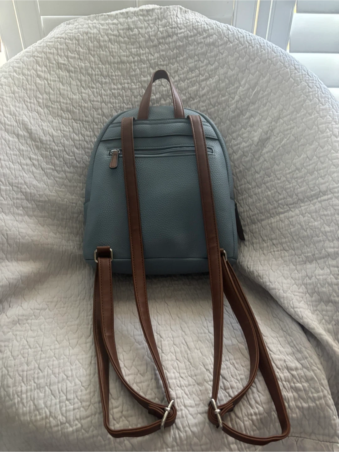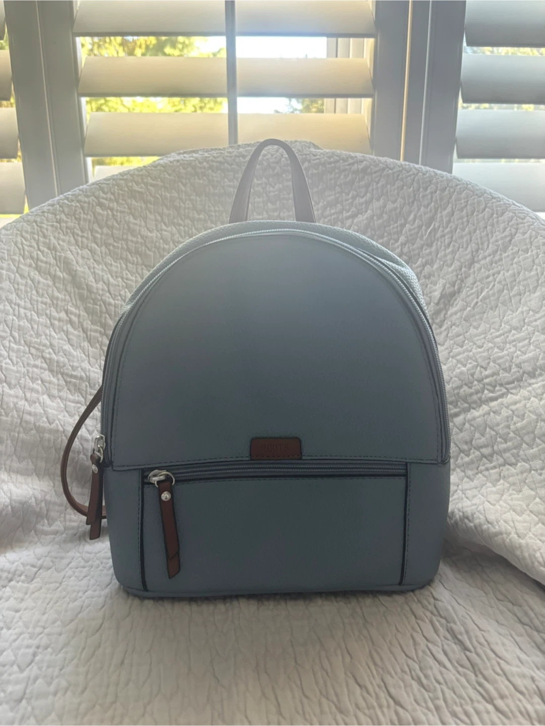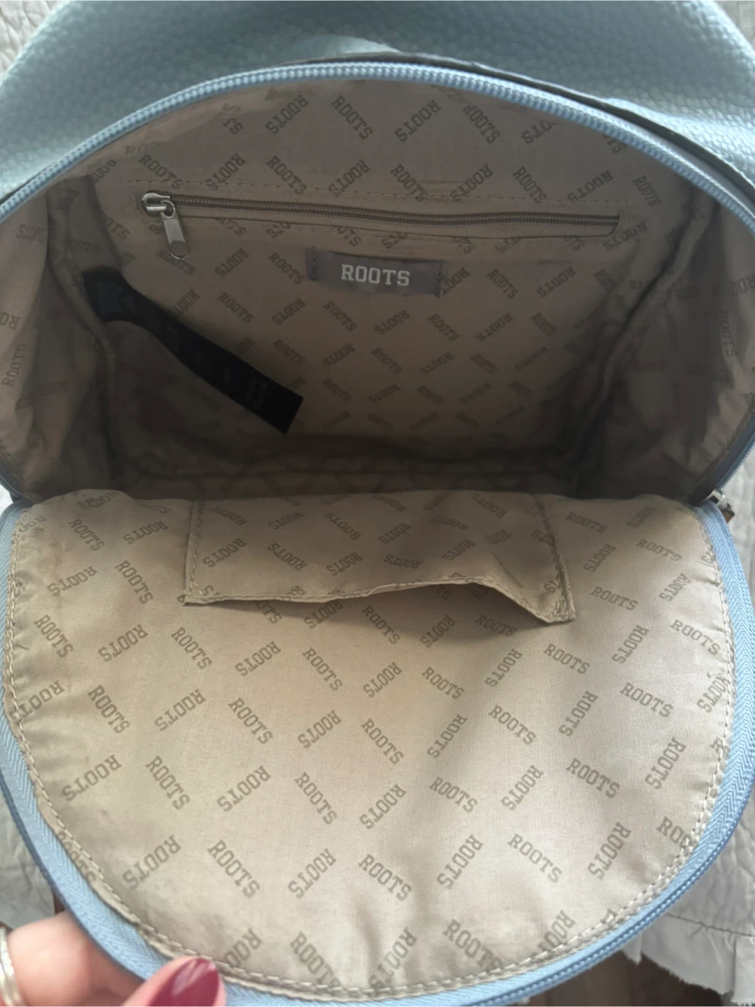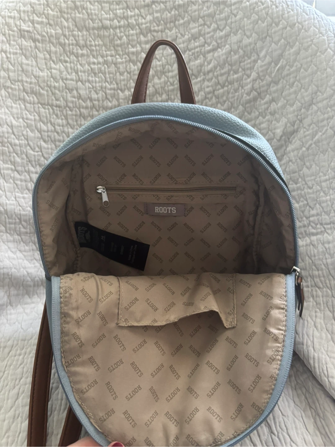 Brand new never used Light blue Roots small backpack in great condition! Features brown straps and interior lining with the Roots logo. Perfect for everyday use or travel