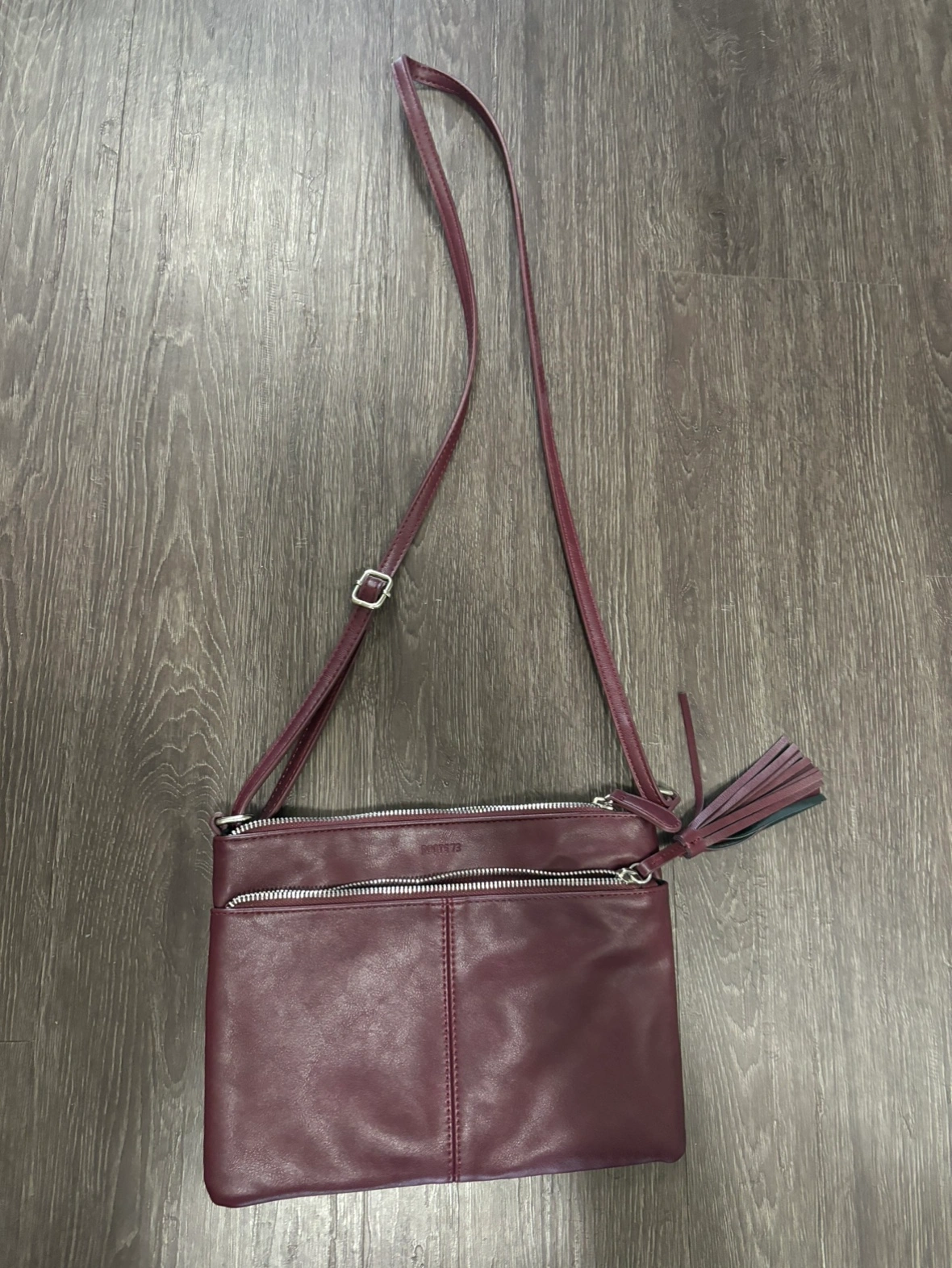 Stylish burgundy crossbody bag with two zippered compartments and a tassel detail. Features a long adjustable strap.
