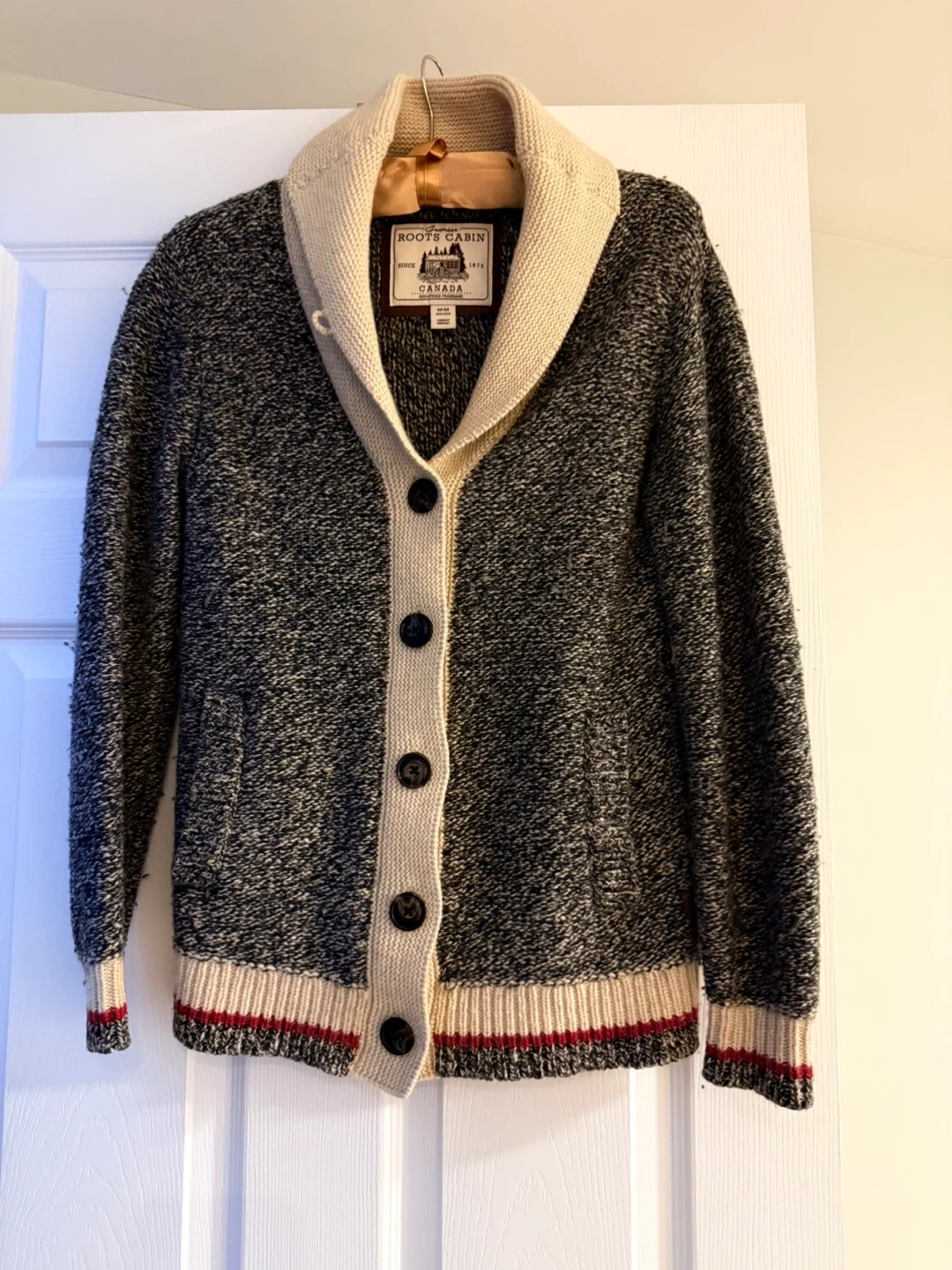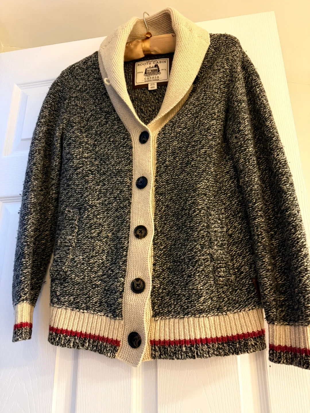 Selling a Roots Cabin cardigan in size medium. It's in great condition and features a shawl collar and button-up front. Perfect for layering during the cooler months!