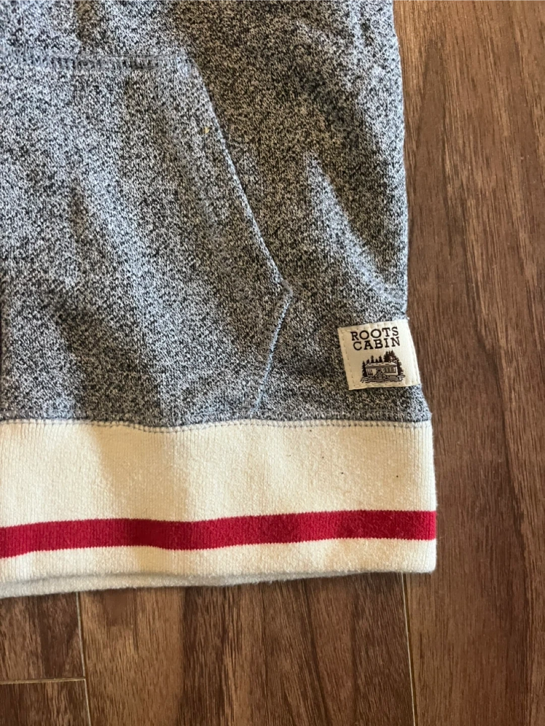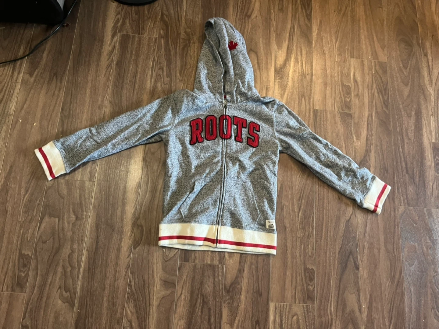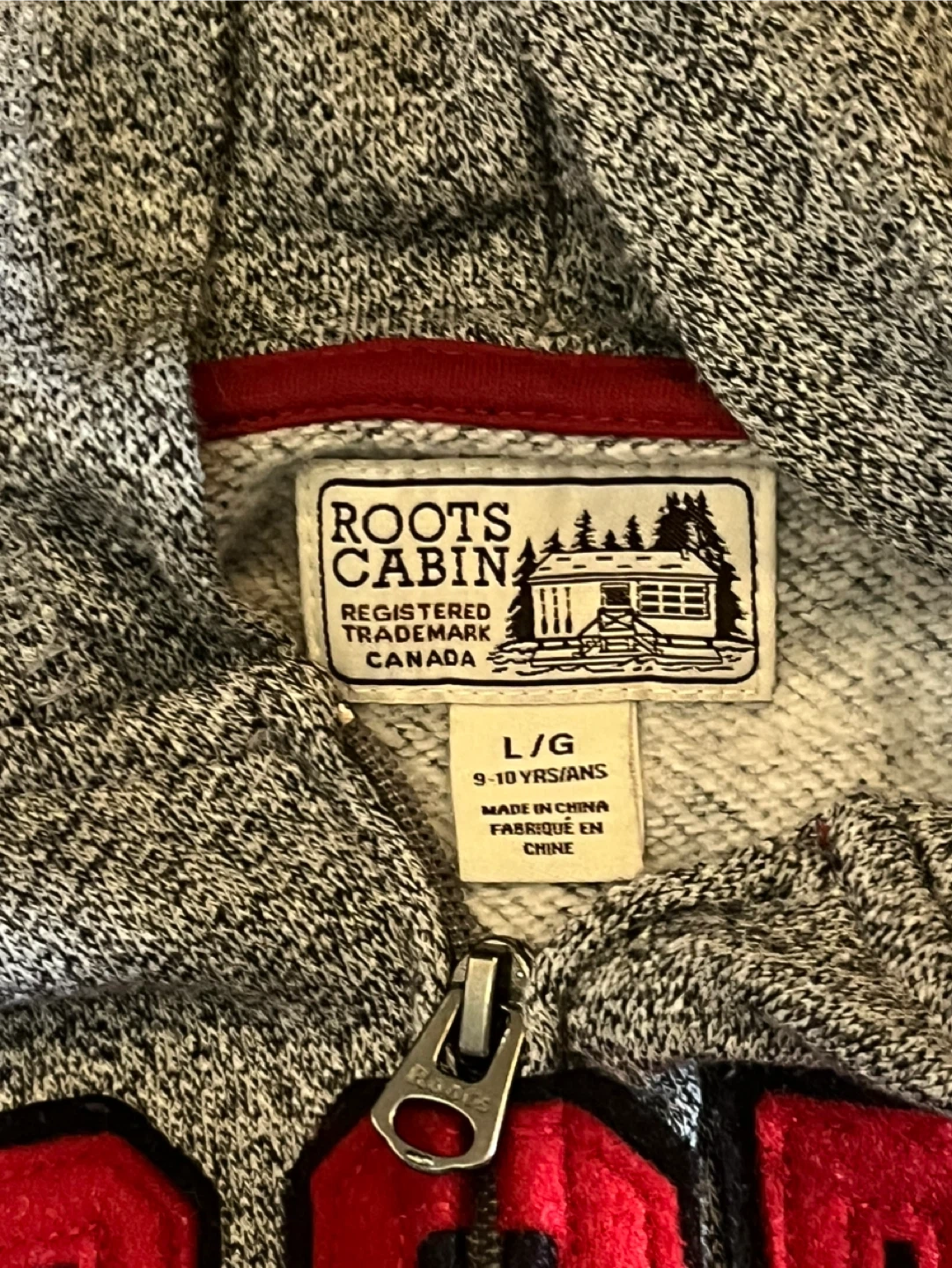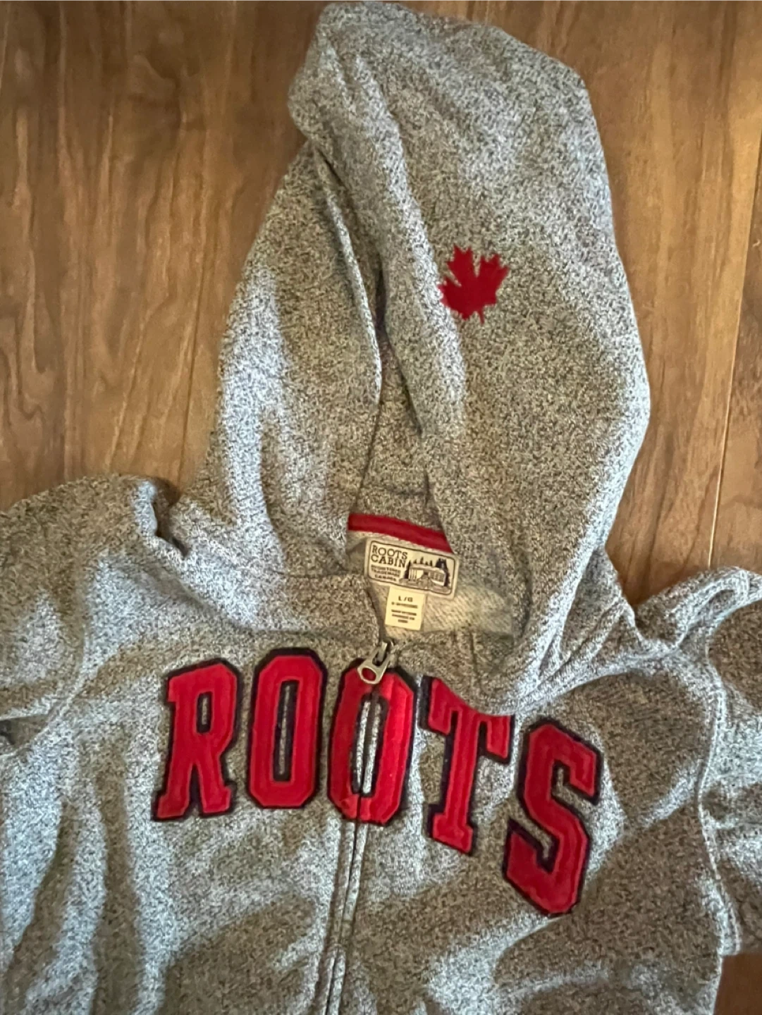 Cozy Roots Cabin hoodie, perfect for kids aged 9-10 years! It's a size L and features the classic Roots logo. Great for layering or wearing on its own