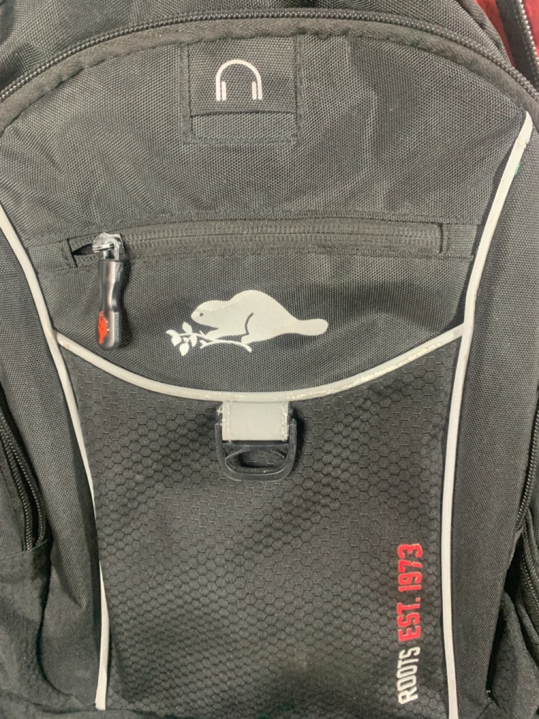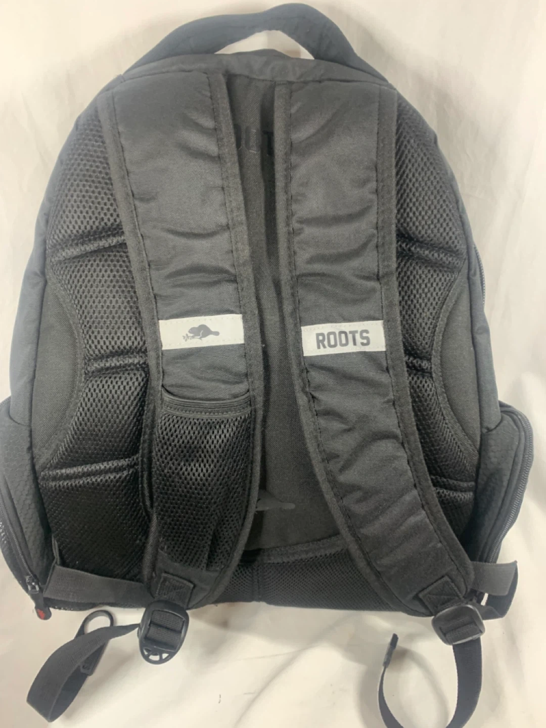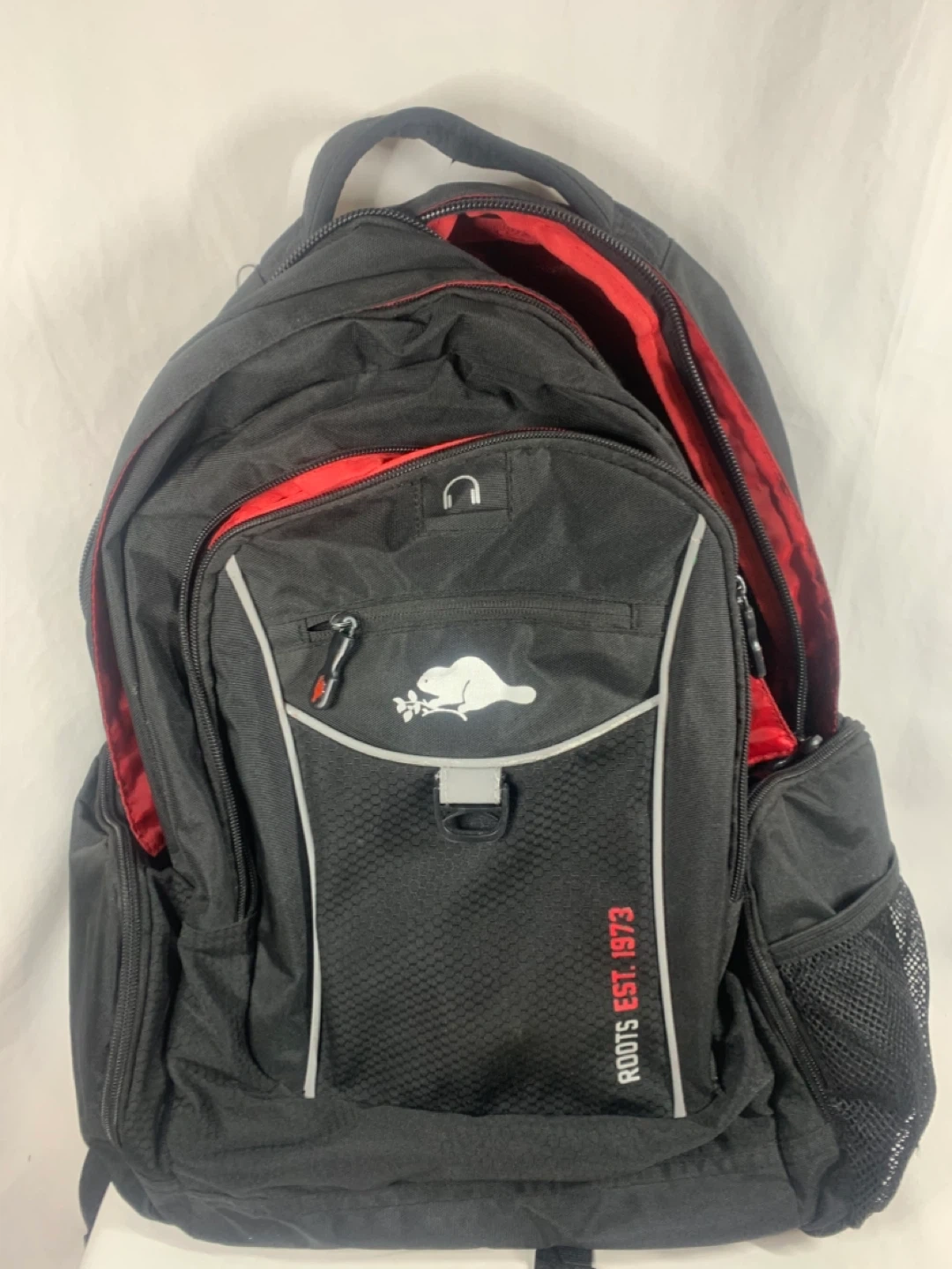 Roots Est. 1973 backpack in black. Great for school or travel! It features multiple compartments and a comfortable design.