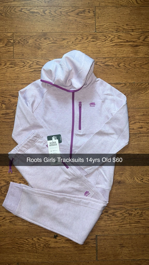 Roots girls tracksuit in size 14. The set includes a hoodie and matching pants. Perfect for keeping your kiddo cozy and stylish!