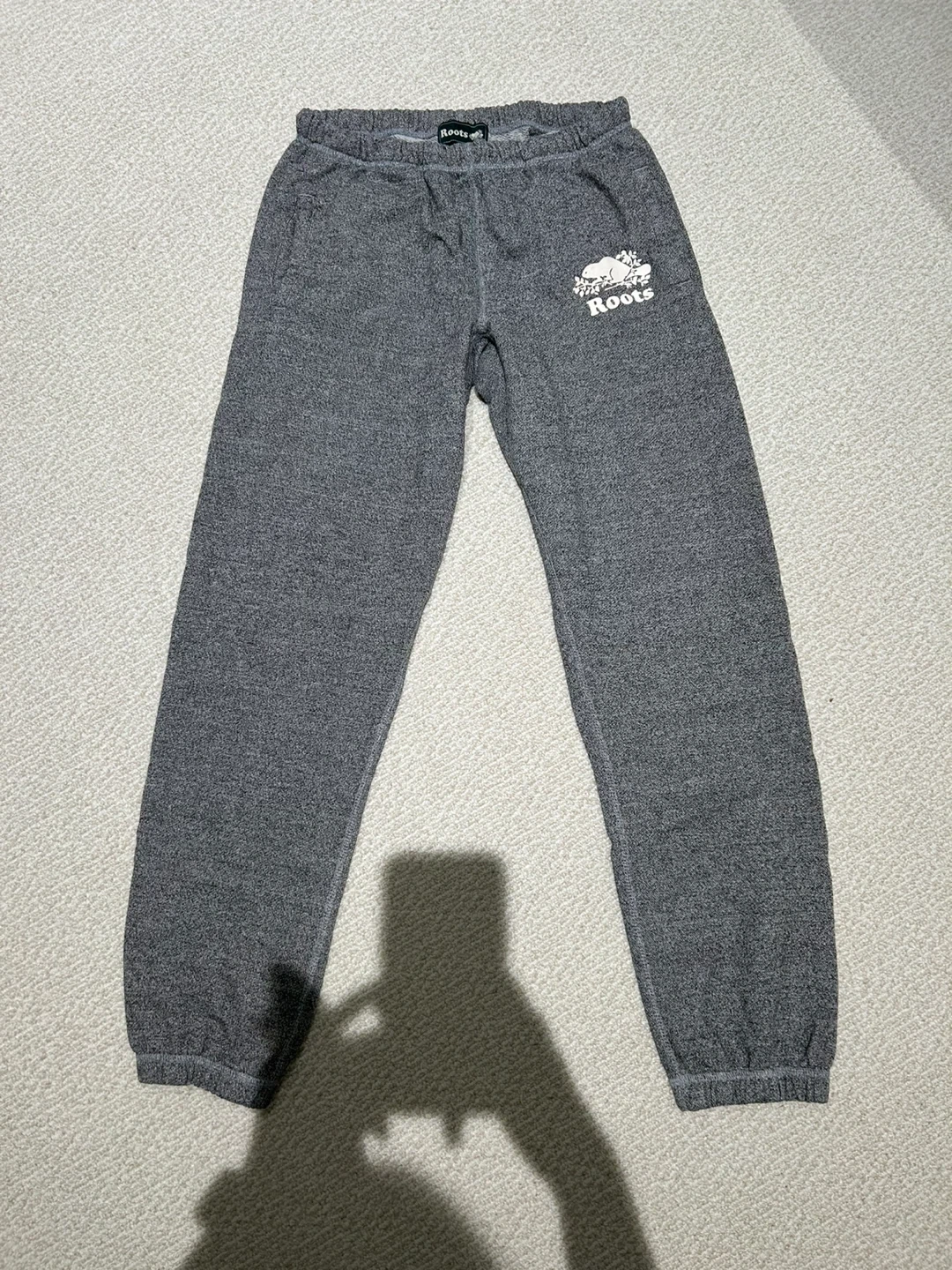 Selling a pair of Roots sweatpants in salt and pepper. They’re comfy and in great shape, perfect for lounging around or running errands!