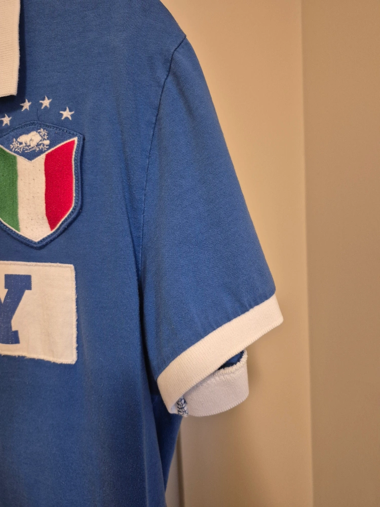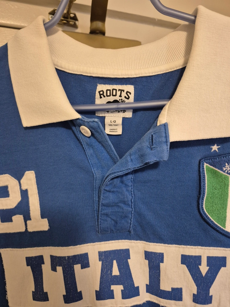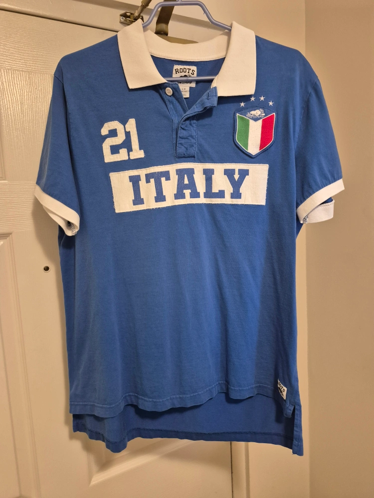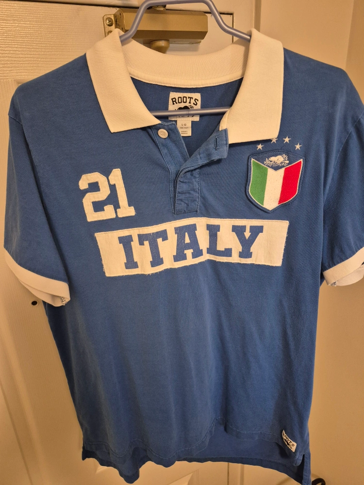 Selling a Roots Team Italy polo shirt with an Italian theme purchased during the 2014 World Cup! It's a size large and features the number 21 (Andrea Pirlo) wore 21 in 2014 for the Team Italia! The word "ITALY" is on the front. The shirt is blue with a white collar and trim. It also has an Italian flag patch on the chest, with the Roots iconic Beaver! Perfect for showing off your Italian soccer pride for the Fifa World Cup next summer! ⚽️ 🇮🇹 🏆 This shirt is 11 years old, now, as compared to when I bought it back in 2014 in Masonville Mall at their Roots store! Curbside pickup M-Sat 5pm-9pm Or Delivery within London for an extra $5!!