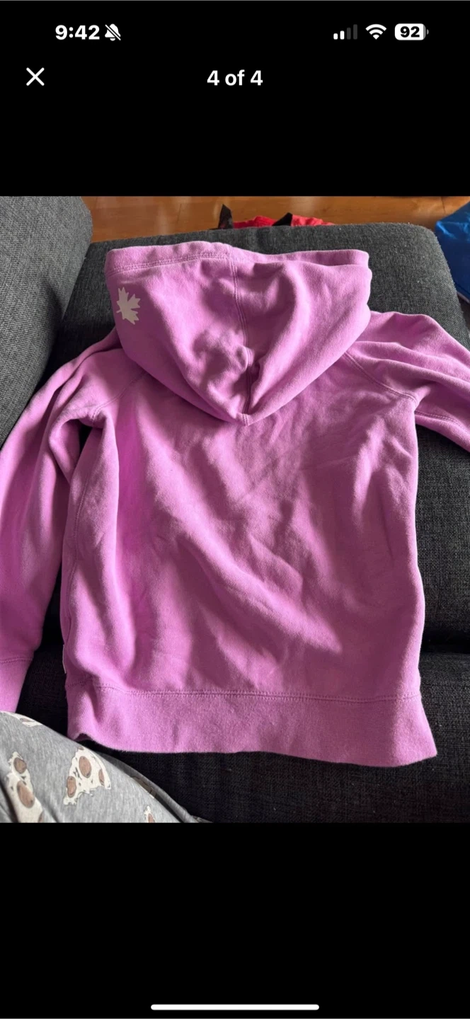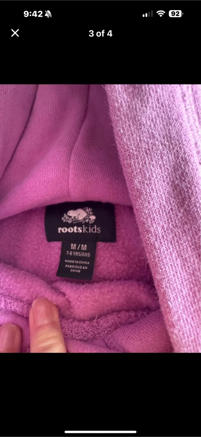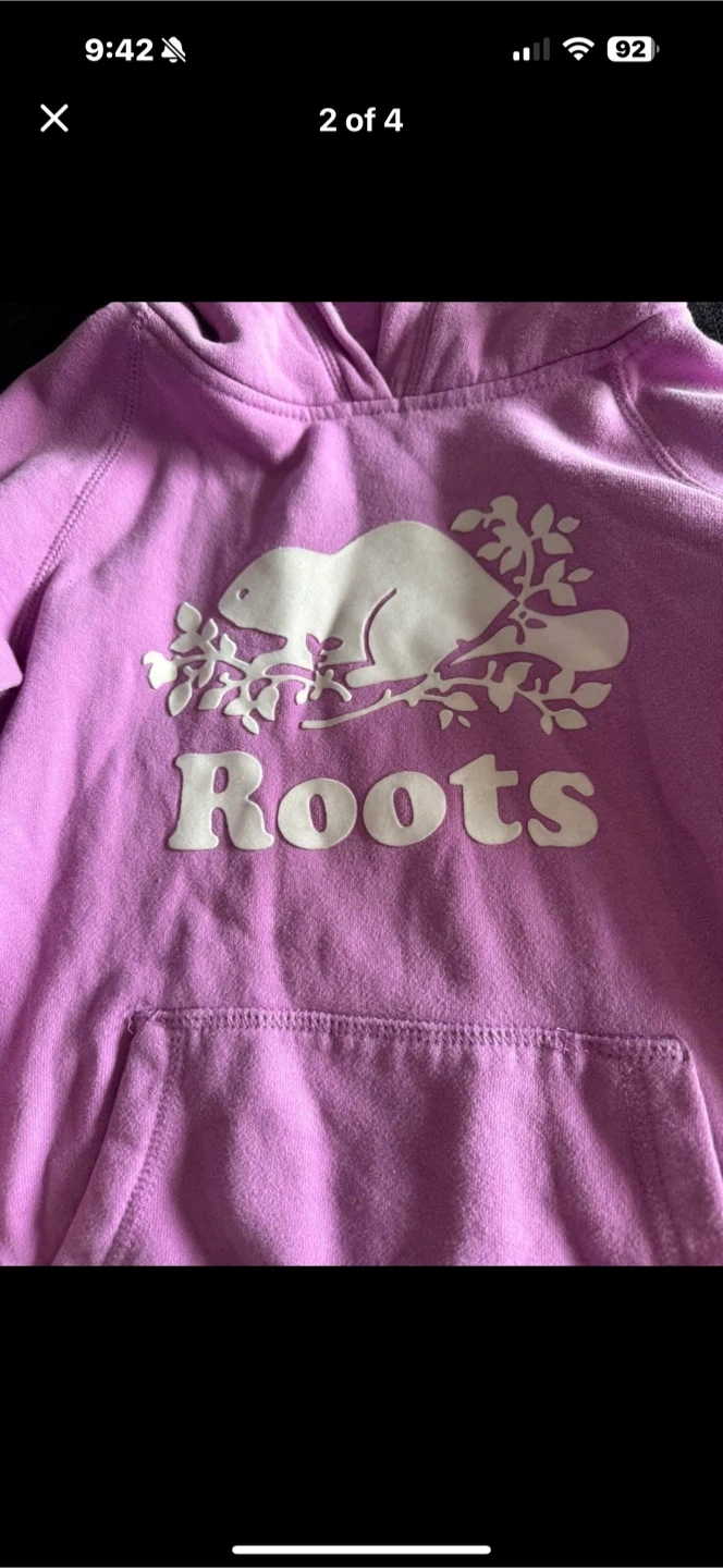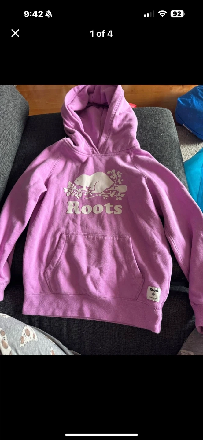 Selling a Roots Kids hoodie in size M (7-8 years). It's a lovely lavender colour with the classic Roots beaver logo on the front. Perfect for keeping your little one cozy! Barely worn by my daughter before she outgrew