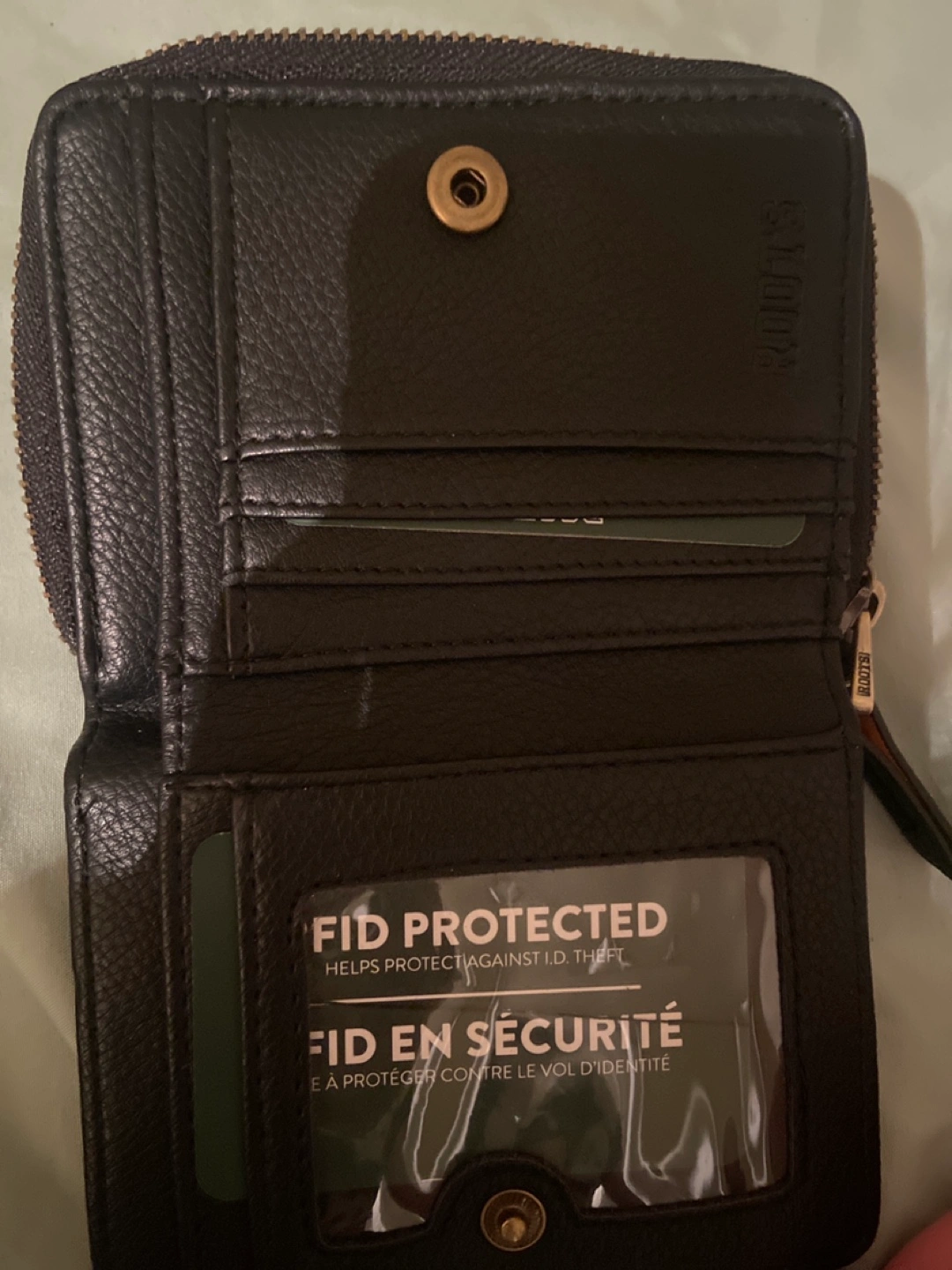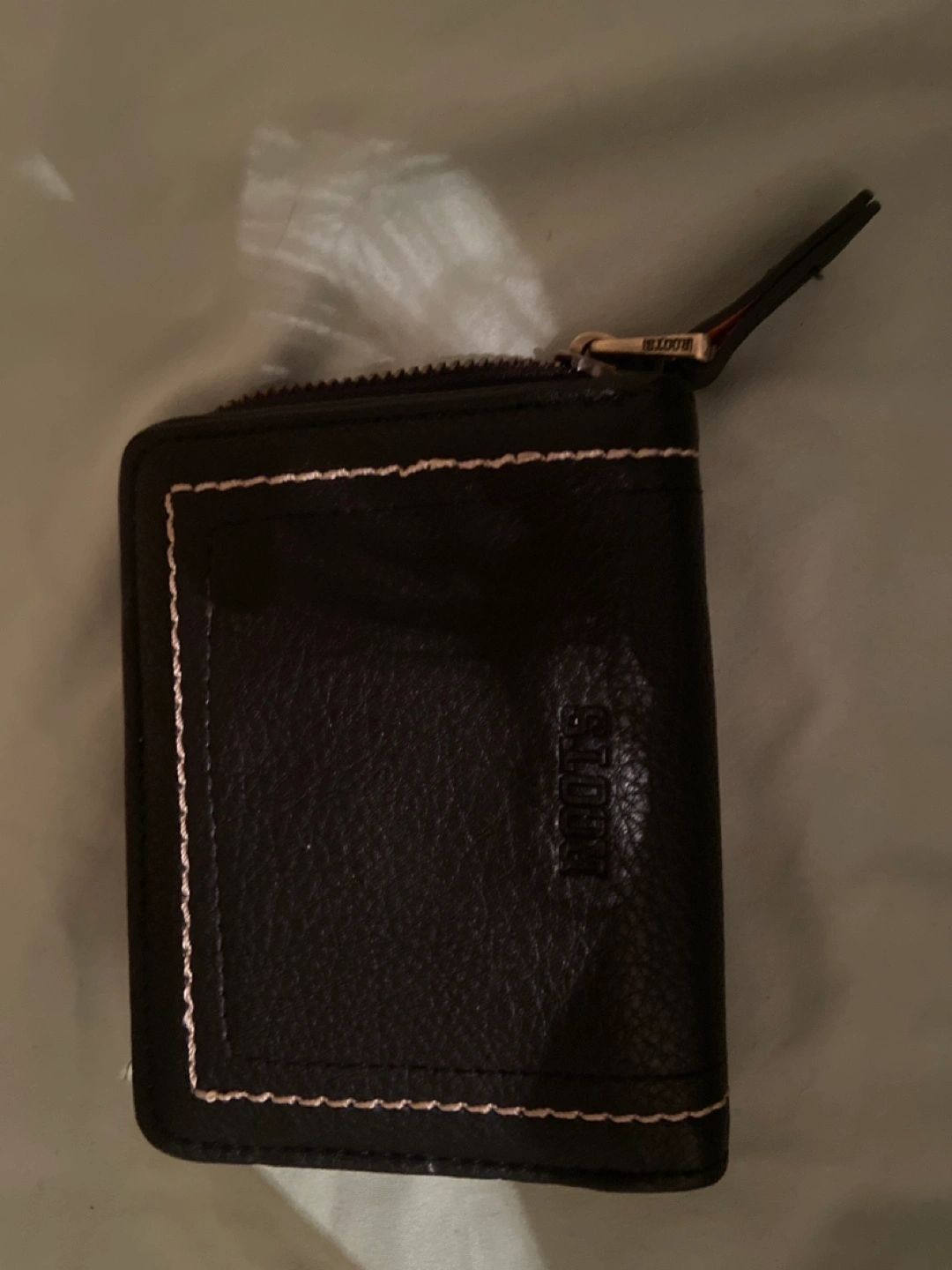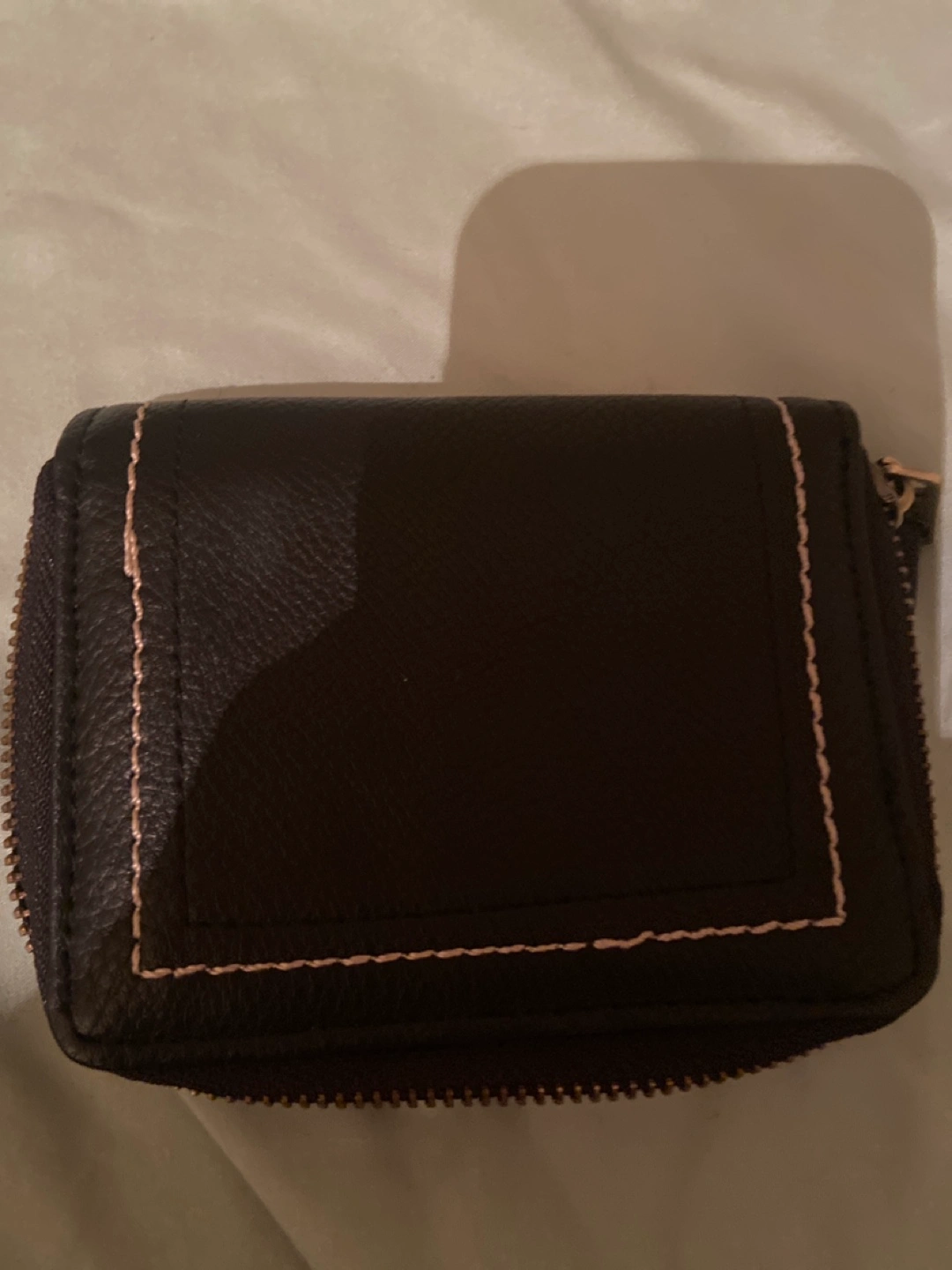 Black leather wallet. Features a zip closure and RFID protection. Small and compact, ideal for everyday use. Stitching detail around the edges. It’s just like new never used the photo doesn’t look the best but it’s all black it doesn’t have any stains