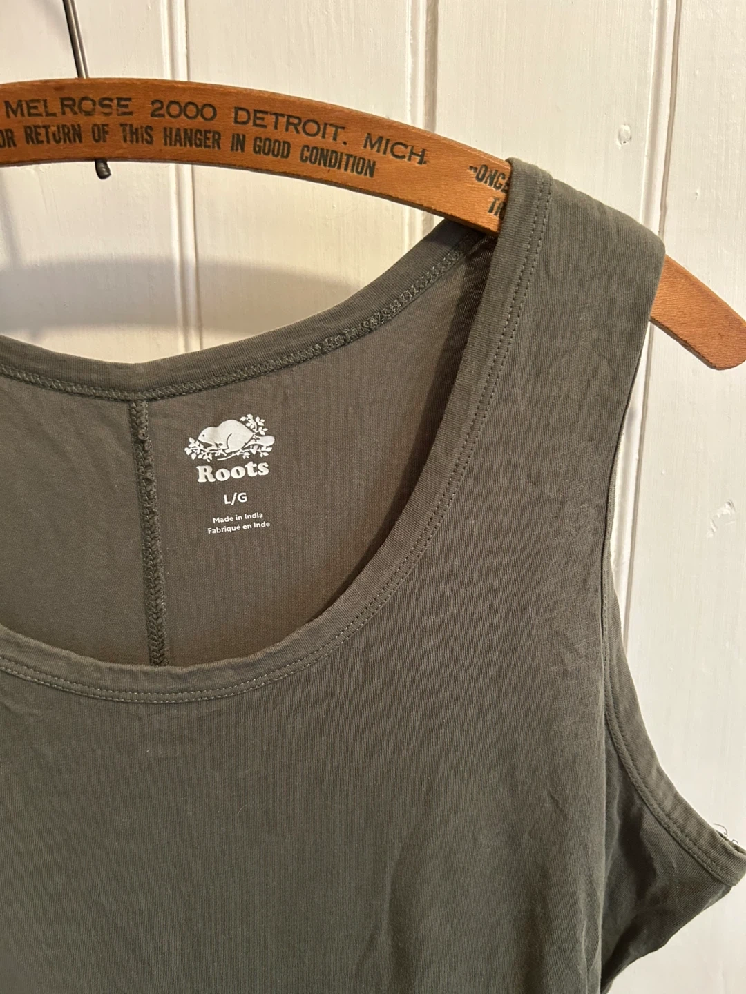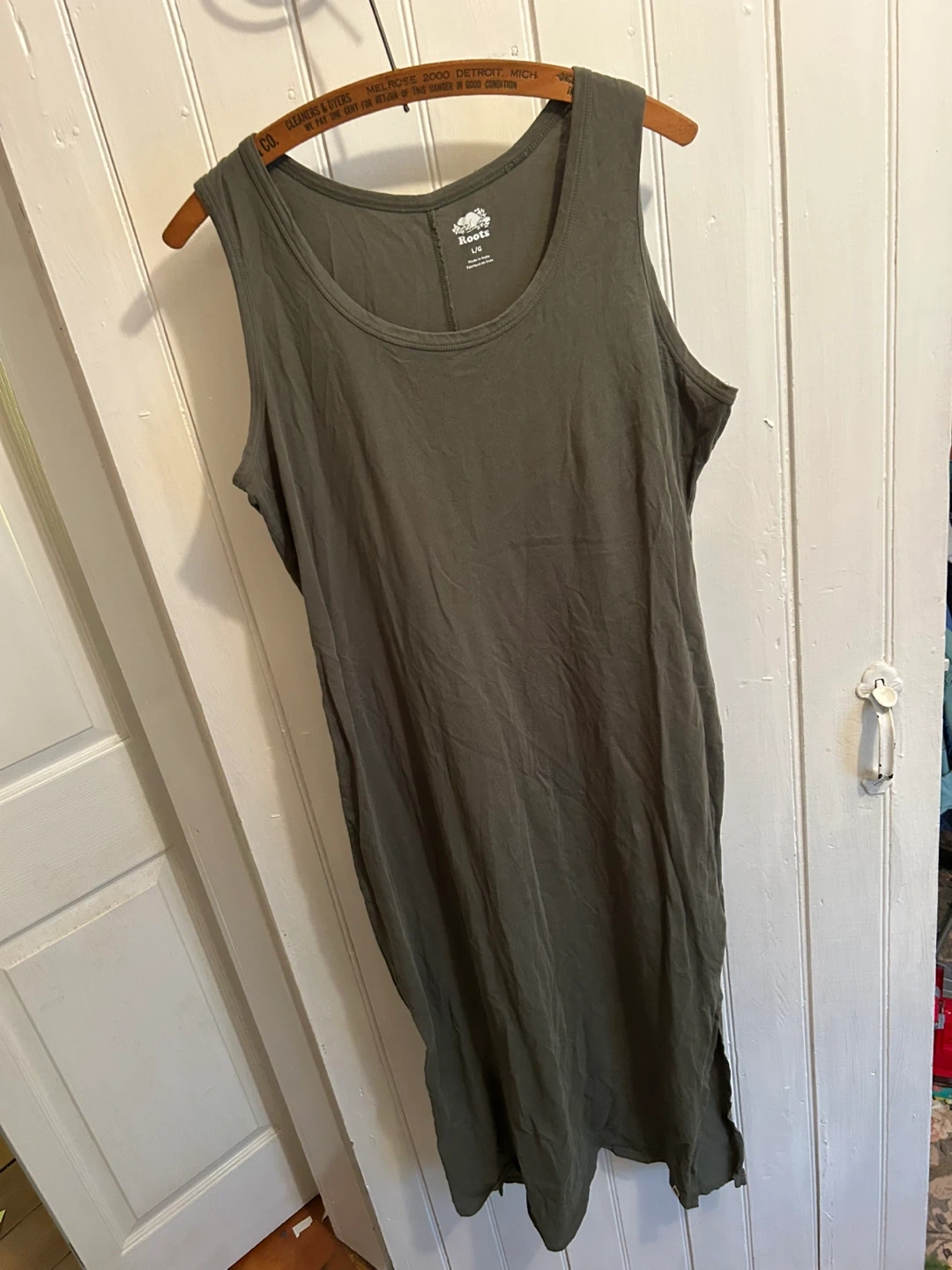 Roots brand. Sleeveless midi length shift dress with slits on both sides. Olive green in colour. Size large. Brand new condition $30 Pickup between kincardine & ripley or I can arrange delivery in port Elgin-Owen sound, walkerton-Durham, wingham-listowel-kw/cambridge, goderich-bayfield, Woodstock & Arthur-Orangeville-Newmarket-Lindsay-Peterborough AREAS.