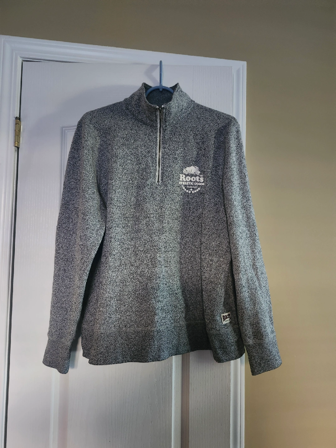 Cozy Roots half-zip sweater in a salt and pepper colour! Perfect for layering or just lounging around the house. It's in great condition and ready for a new home