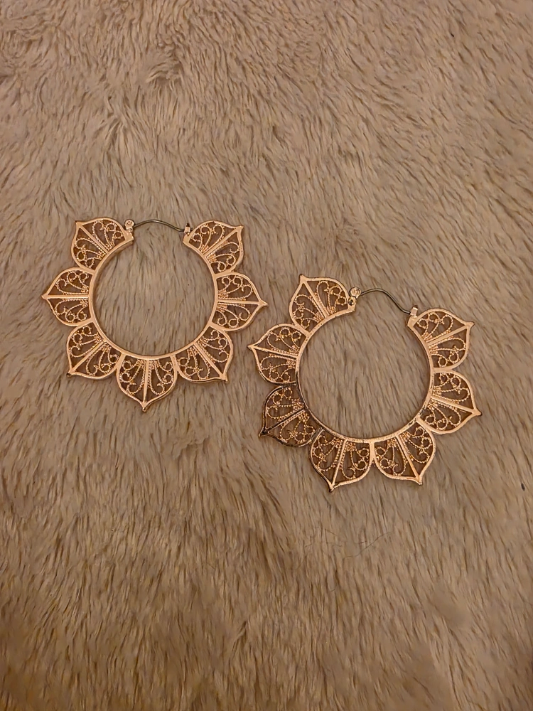 Howdy! 💕 Selling a pair of beautiful floral hoop earrings. They feature an intricate, filigree-like design. Perfect for adding a touch of elegance to any outfit Cash Only! We'll meet at the Eaton Centre!