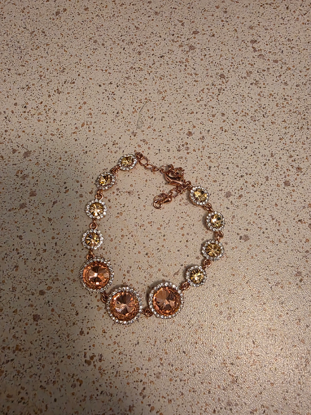 Selling a beautiful rose gold tone bracelet! It features alternating peach and yellow stones surrounded by clear crystals. It's in great condition and would make a lovely addition to any outfit