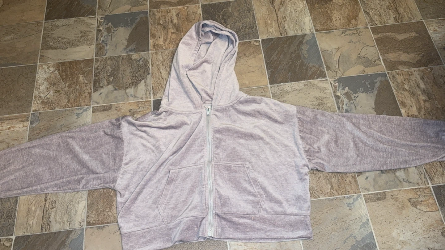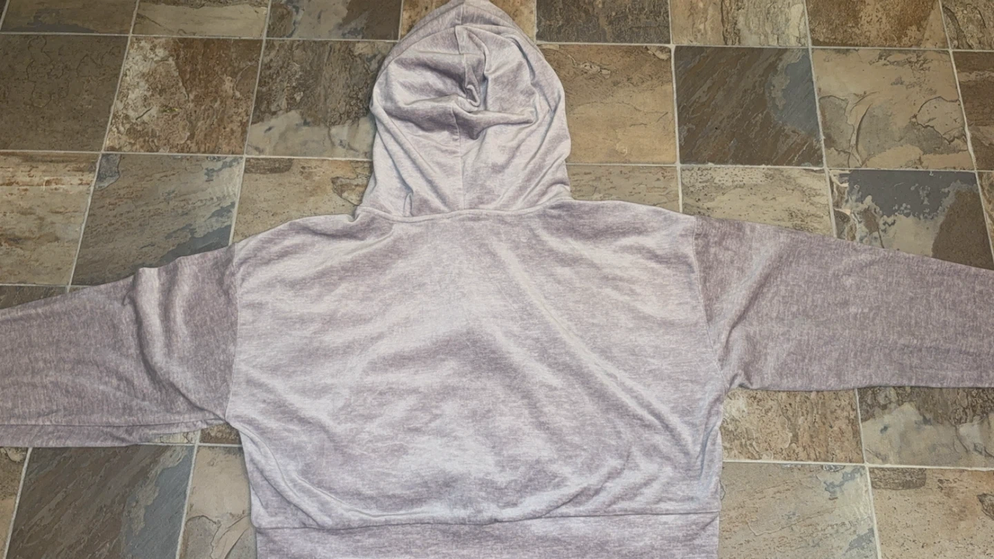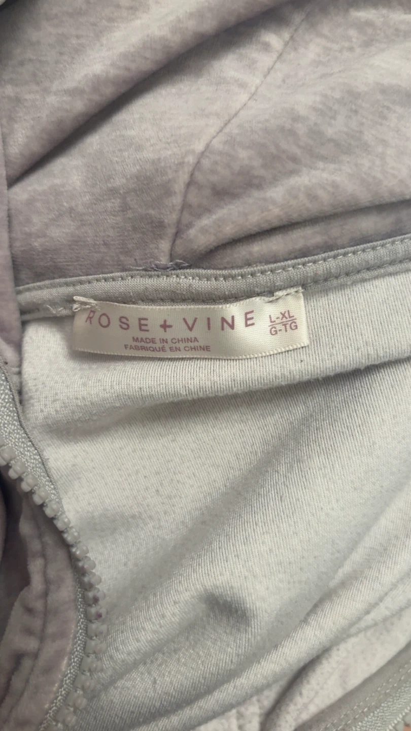 Selling a comfy Rose & Vine crop top hoodie! It's a light grey colour and a size L-XL. The material is 97% polyester and 3% elastane, making it soft and stretchy. Perfect for those cozy days!