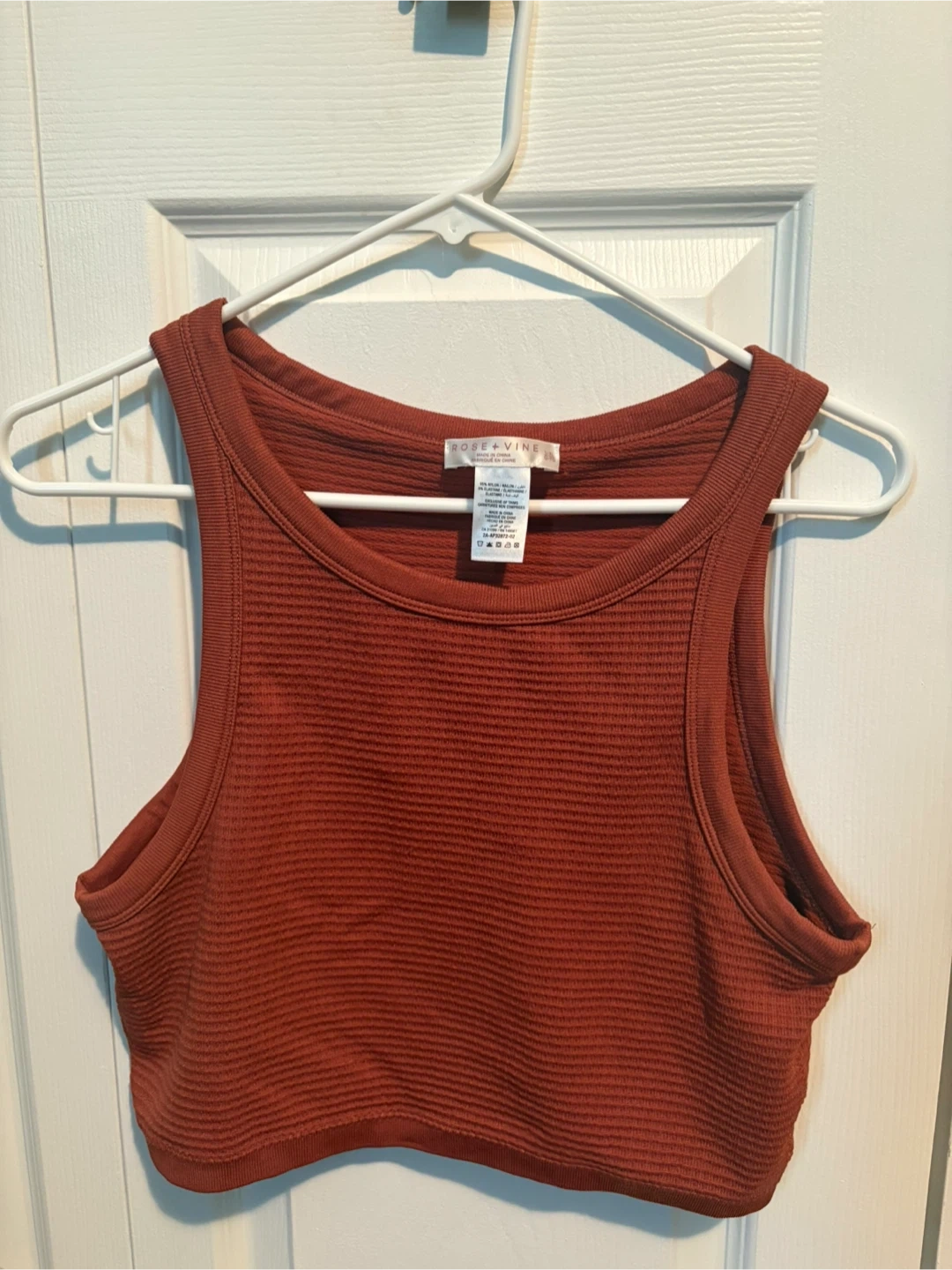 Rose & Vine tank top in a lovely rust colour! It's a size large-xl and in great condition. The material has a subtle ribbed texture, making it a comfortable and stylish choice for everyday wear