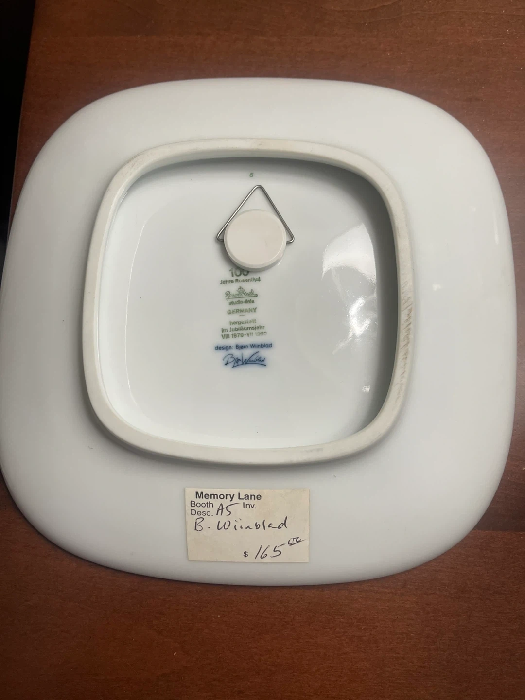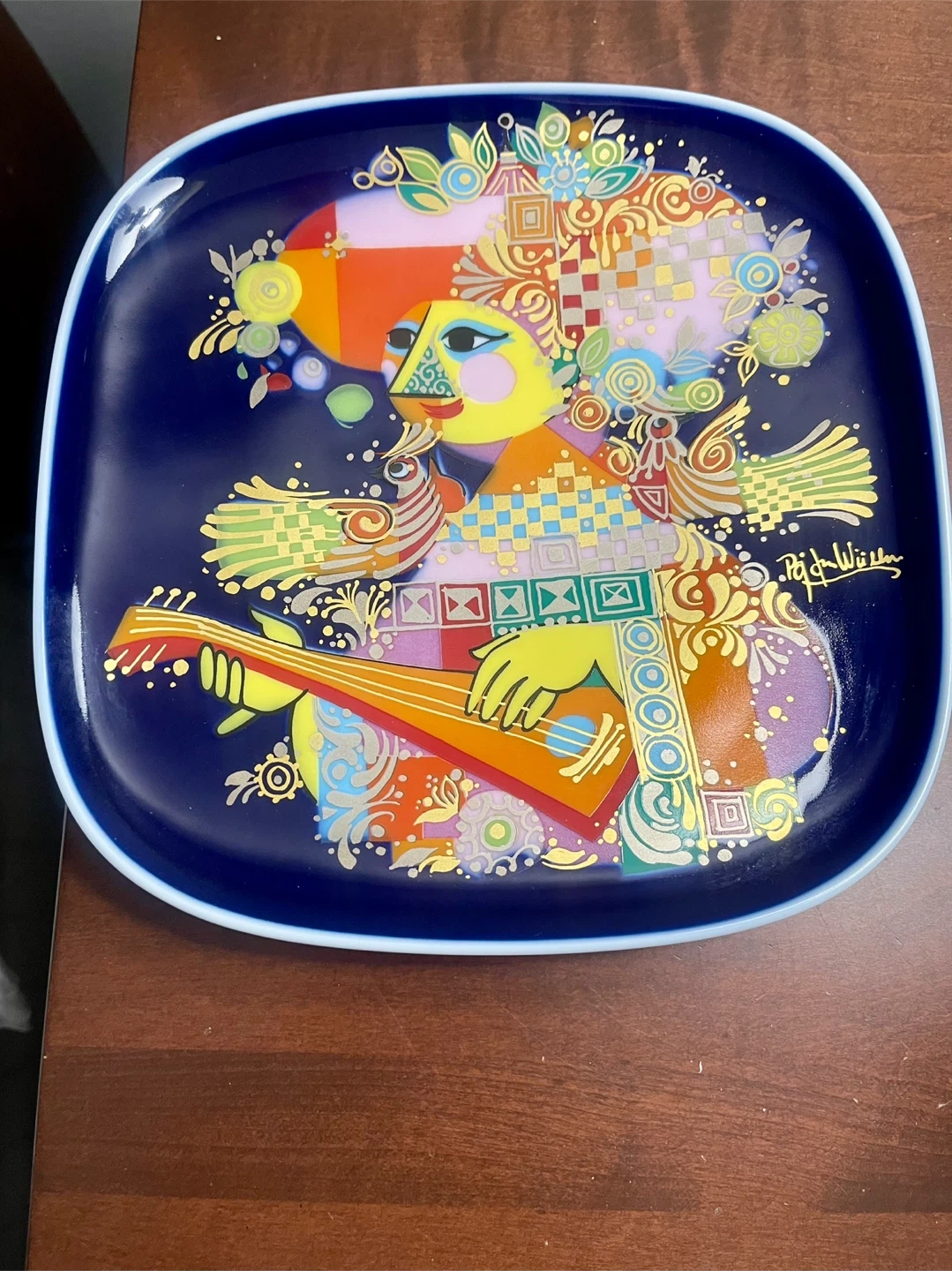 Selling a beautiful Rosenthal Studio-Linie plate and vase designed by Bjorn Wiinblad! Both pieces feature intricate and colourful designs. The vase and plate are in great condition and would make a lovely addition to any home. The plate has a square shape with rounded corners.