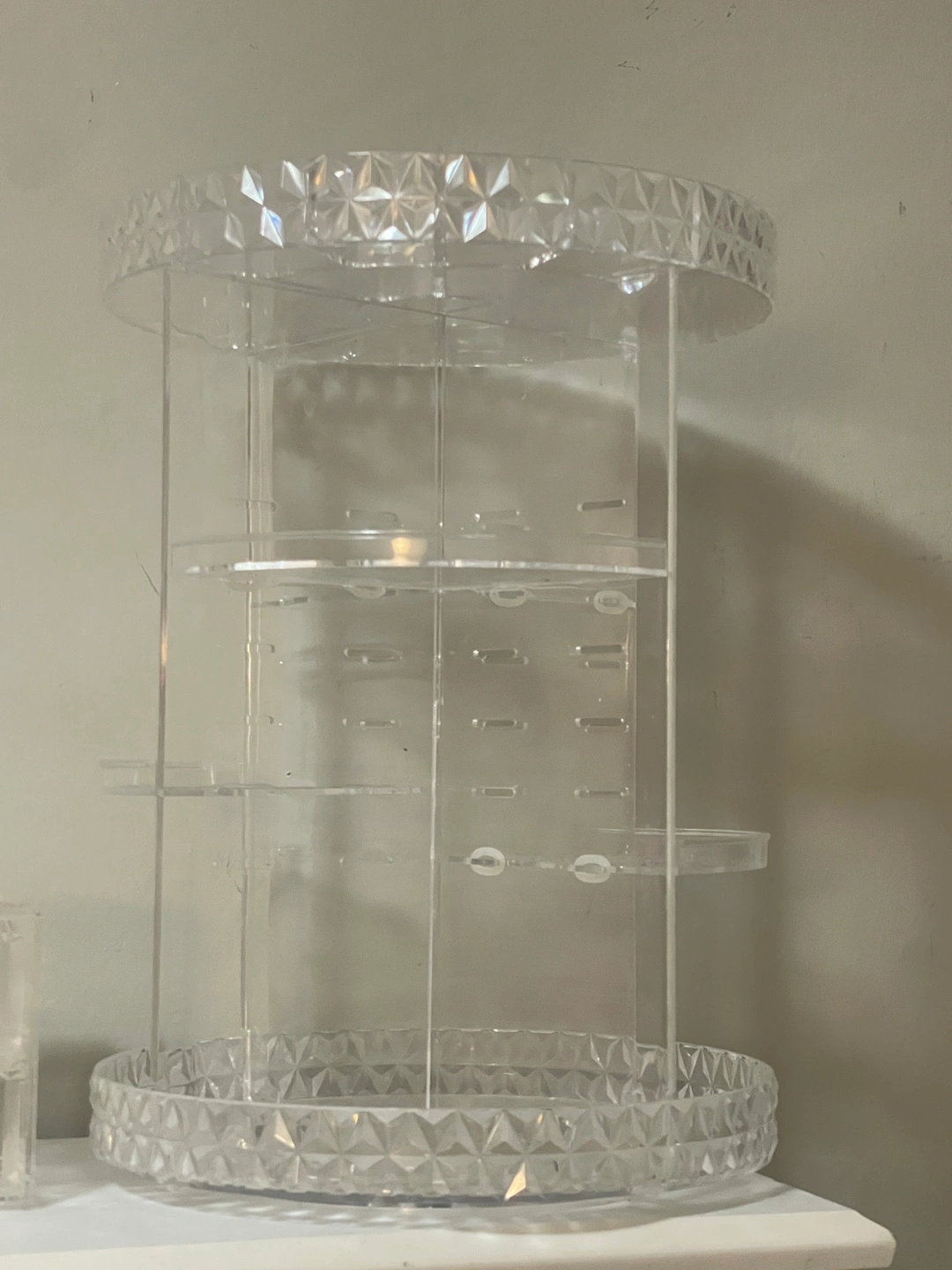 Selling a clear, rotating makeup organizer! It's perfect for keeping all your cosmetics and accessories neatly displayed and easily accessible. Great for vanities or smaller spaces