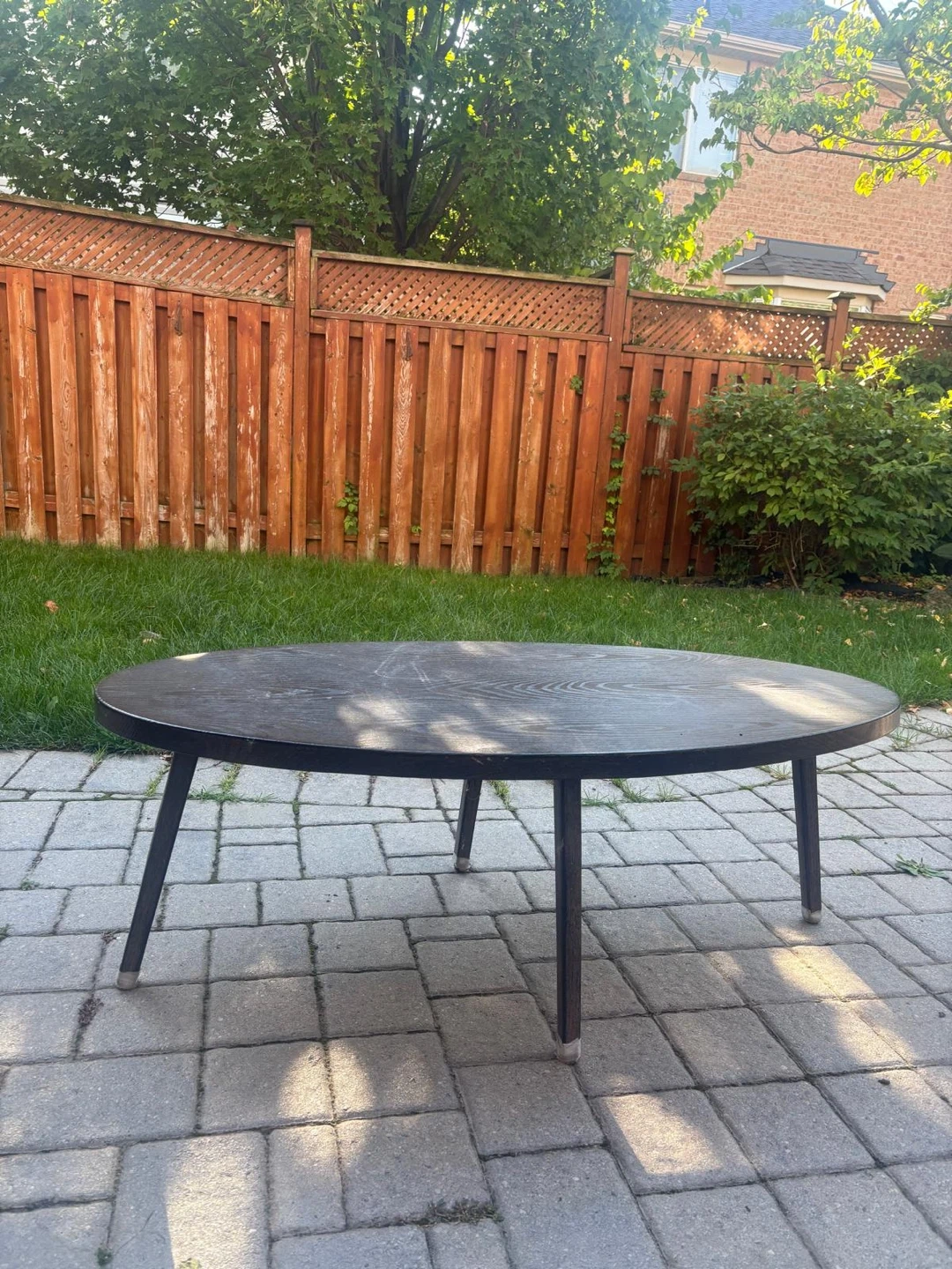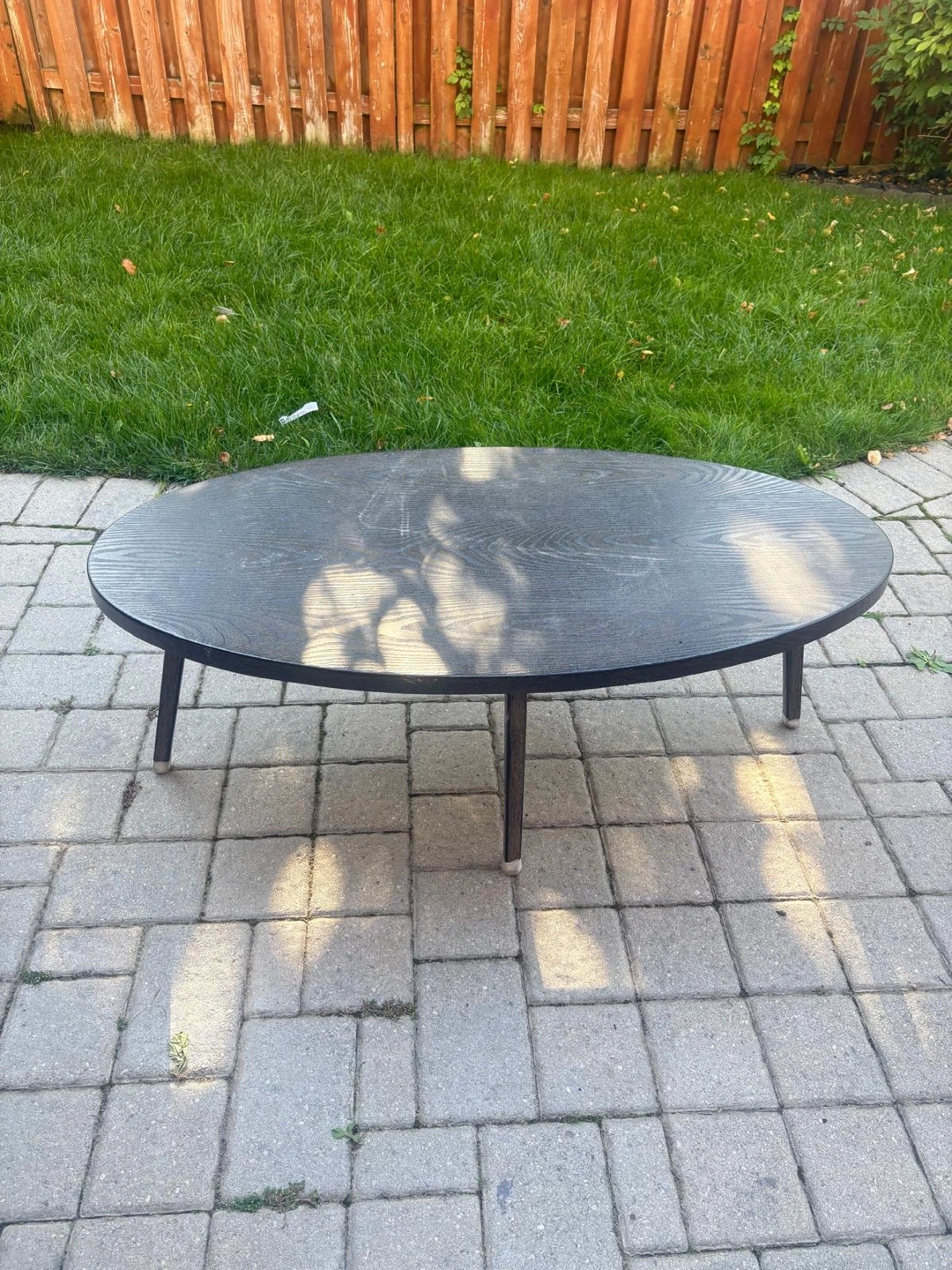Selling a round coffee table with a sleek black wood finish. It's in great condition and would be a stylish addition to any living room. The table has a unique wood grain pattern on the surface. Sturdy legs provide stability. Perfect for placing drinks, books, or decor