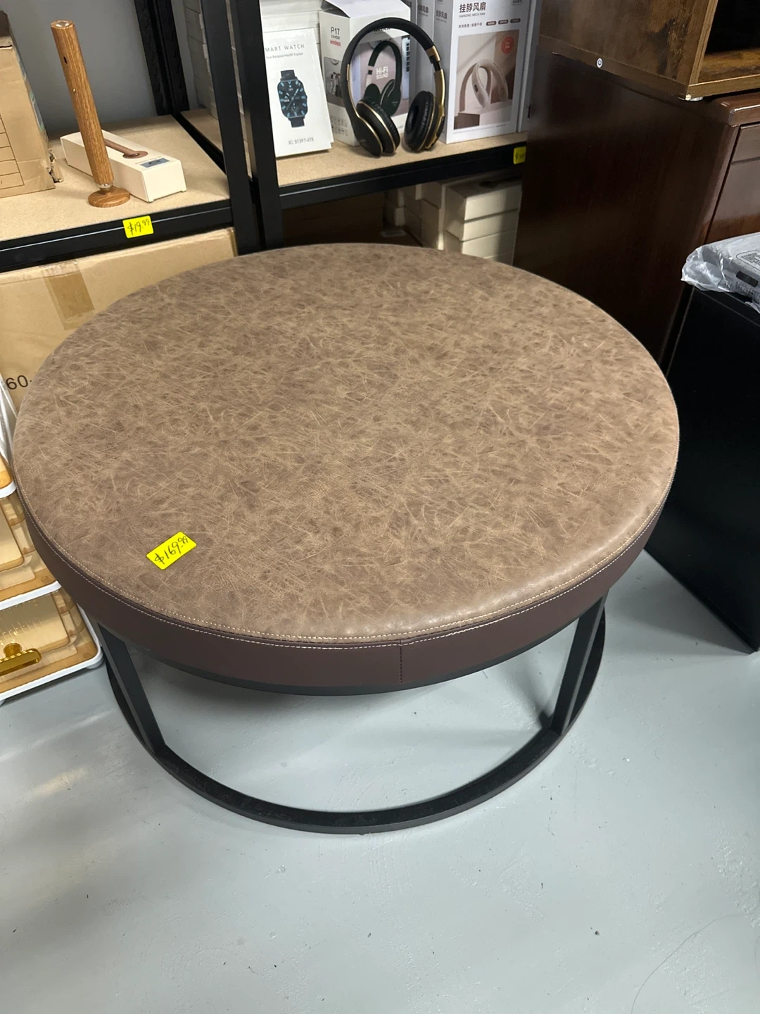 Selling a round ottoman stool with a brown leather top and a black metal base. It's in great shape and would be a nice addition to any living room or bedroom. Originally bought for $169!