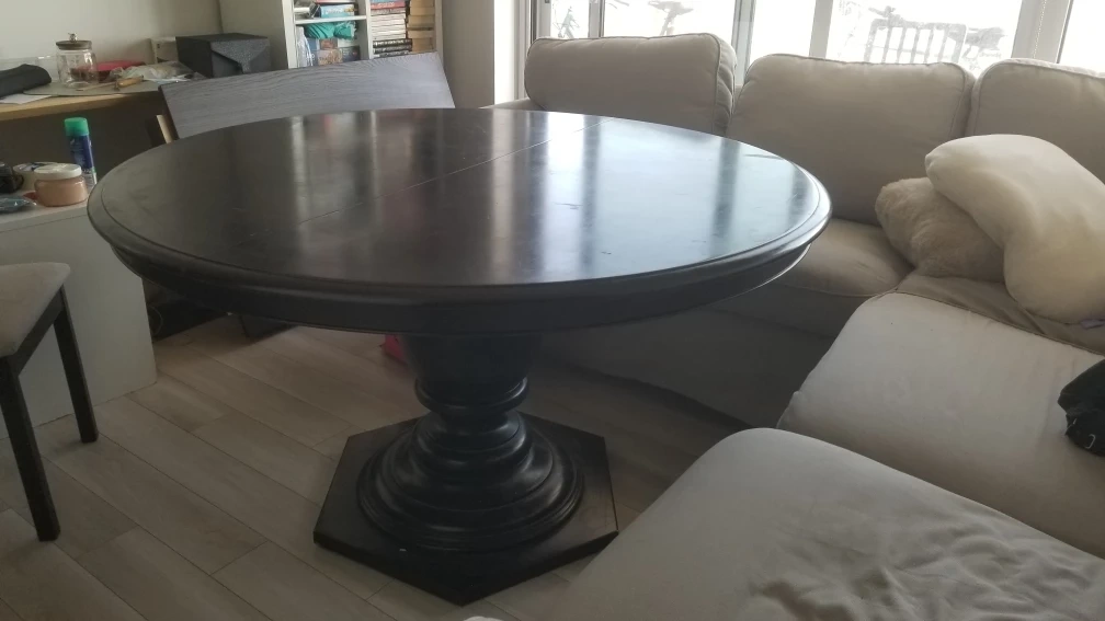 Selling a round dining table with a dark wood finish. It features a pedestal base and a classic design. Its slightly used and scratched but solid otherwise. It's about 1.3m in diameter and can be enlarged. You will probably need a truck/a lot of space to collect it!
