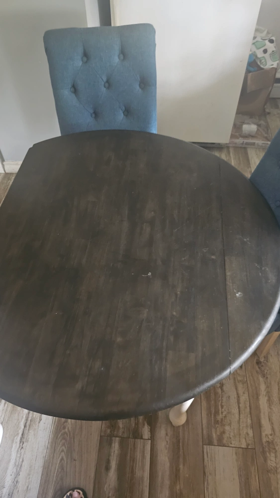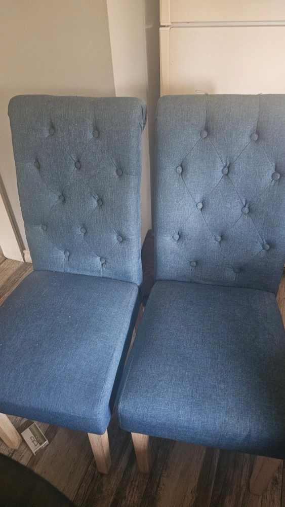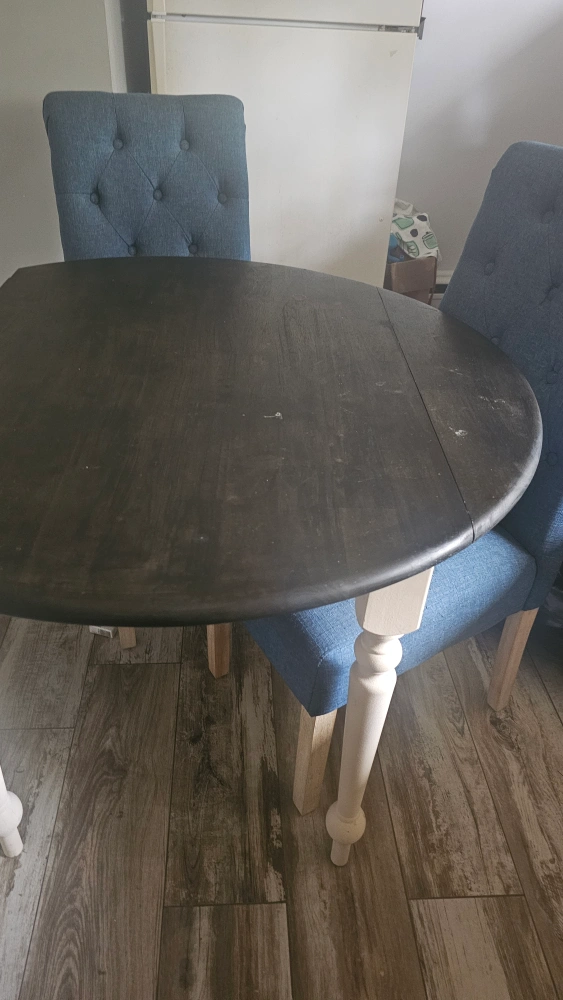 Selling a round dining table with two matching blue upholstered chairs. The table has a dark wood top and white legs. The chairs are a lovely blue fabric with button detailing on the back. Perfect for a small dining area or kitchen!