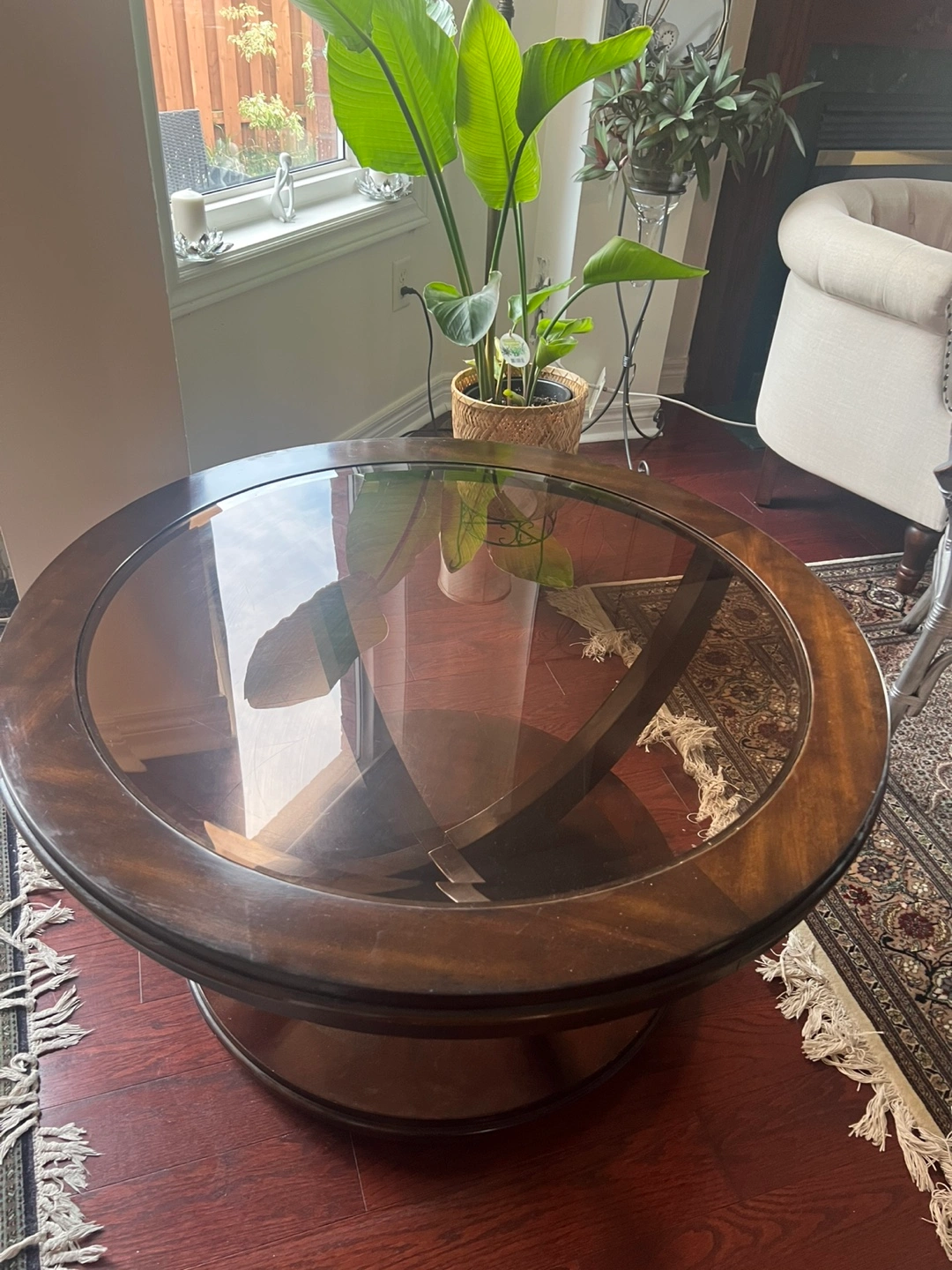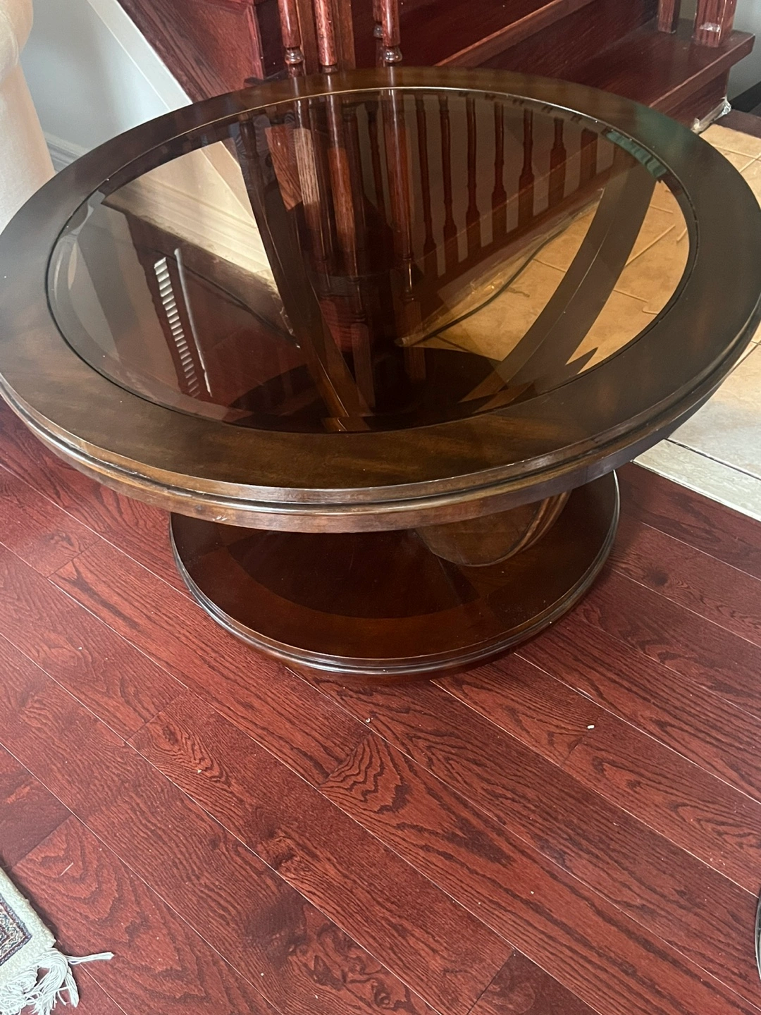 A lovely round coffee table with a glass top and a dark wood finish. It's in great shape and would be a nice addition to any living room!