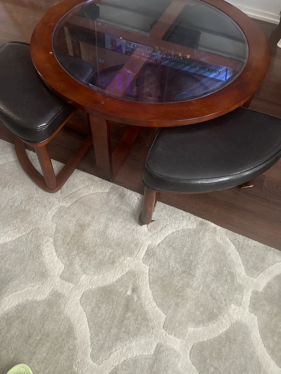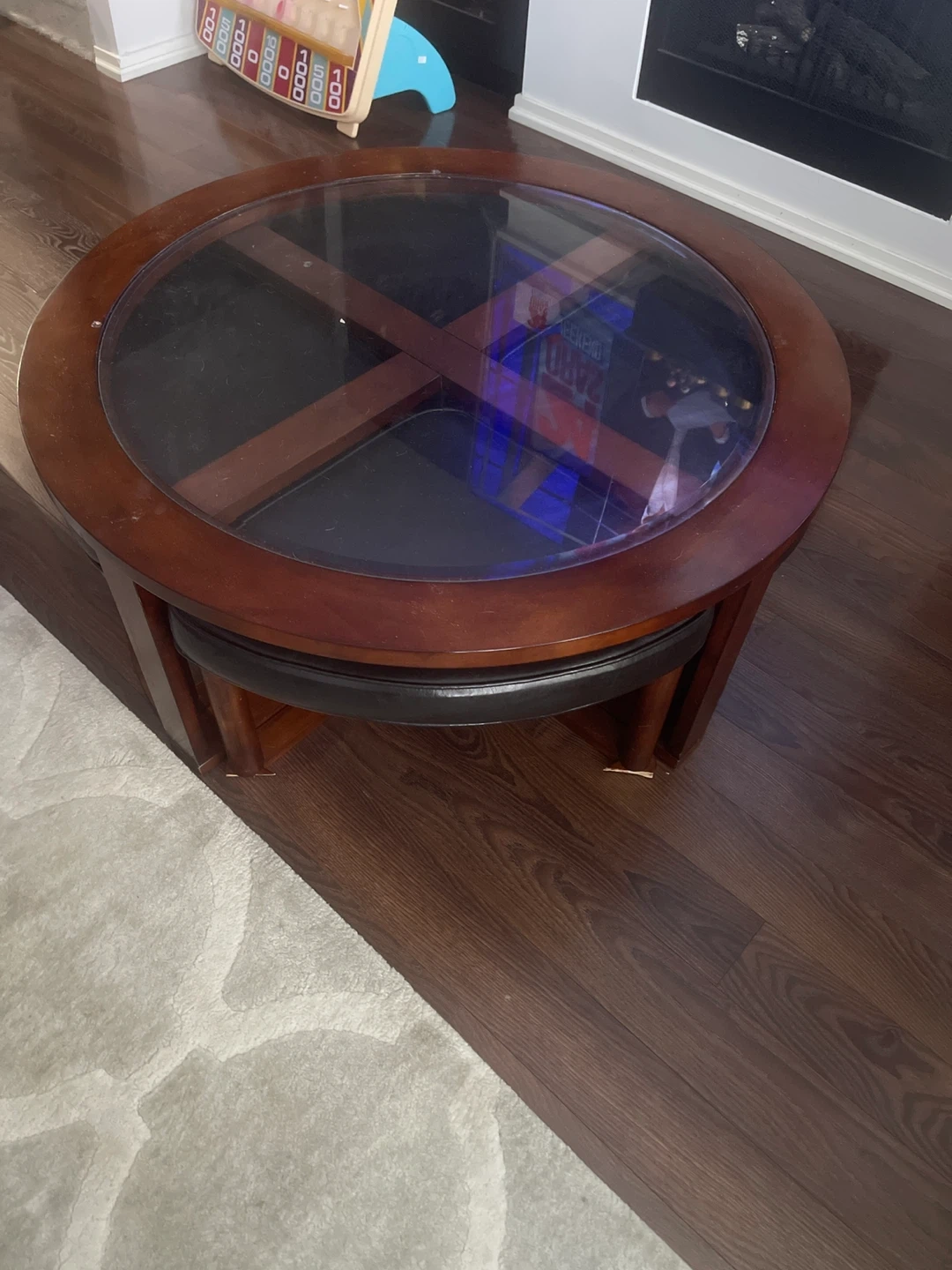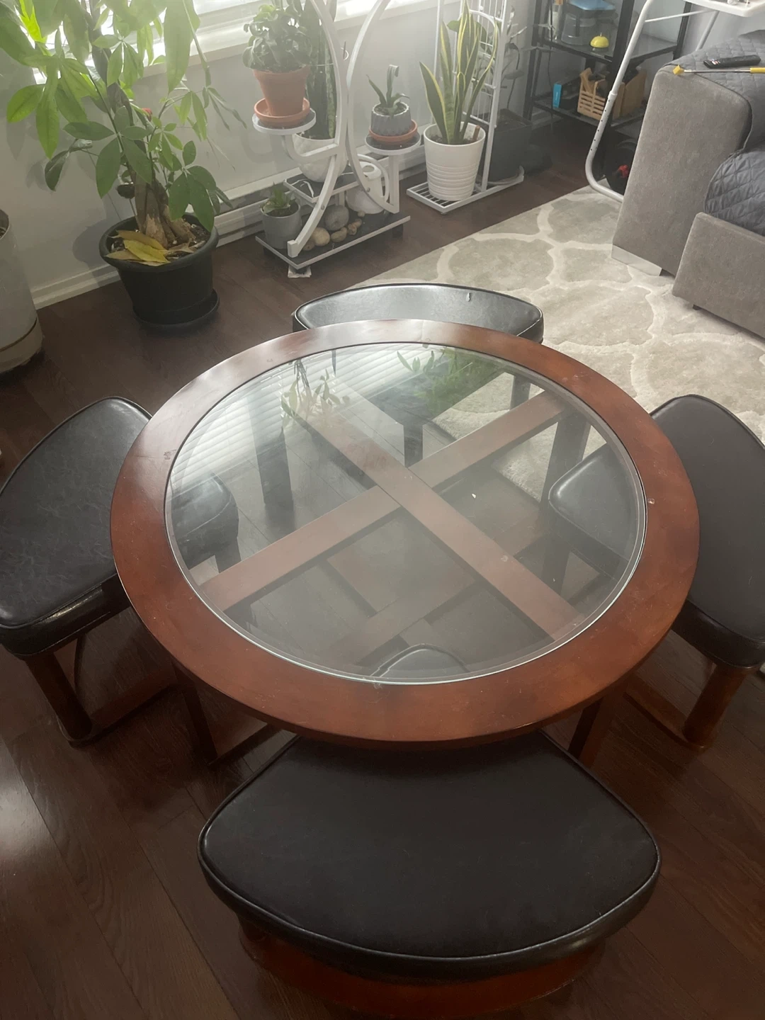 Selling a round coffee table with a glass top and four matching ottomans that fit neatly underneath. It's a great space-saving design and perfect for a living room or den. The wood frame has a warm tone, and the ottomans are upholstered in a dark material. It's in good condition and ready for a new home! One ottoman chair got damage but still useful to sit on please see pictures.
