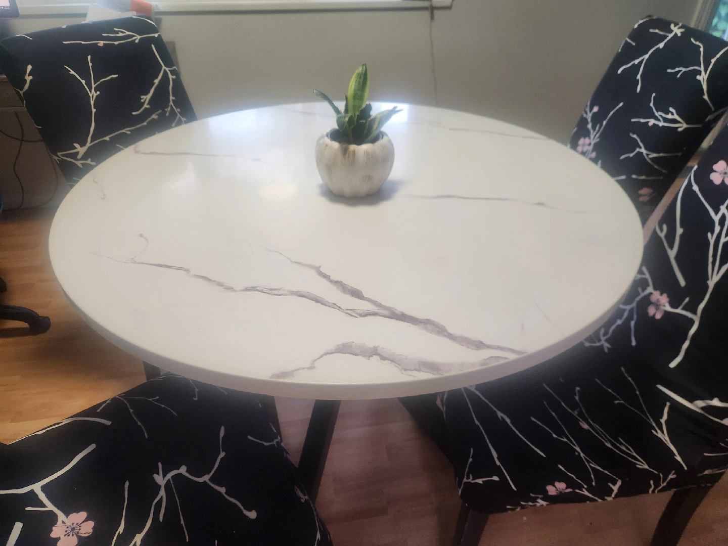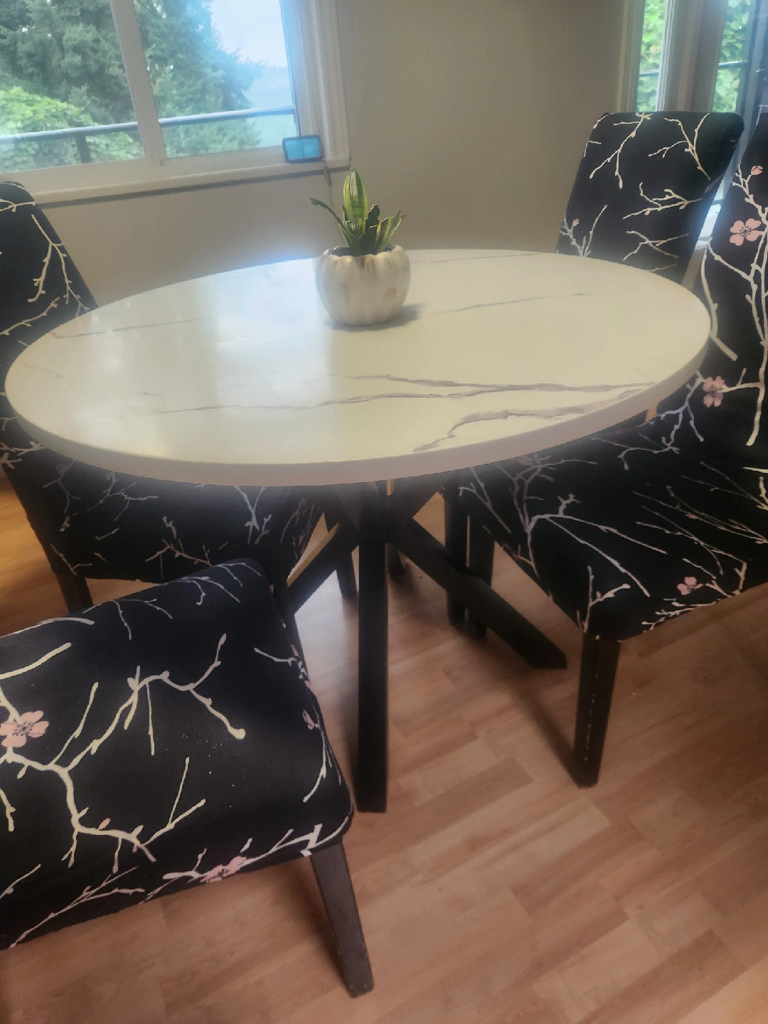 Selling a round dining table with culture marble top. It's in great shape and would be perfect for a smaller dining space or kitchen nook. The base is a black metal finish. It's a stylish and practical piece! does shace some water stains that I don't know how to remove