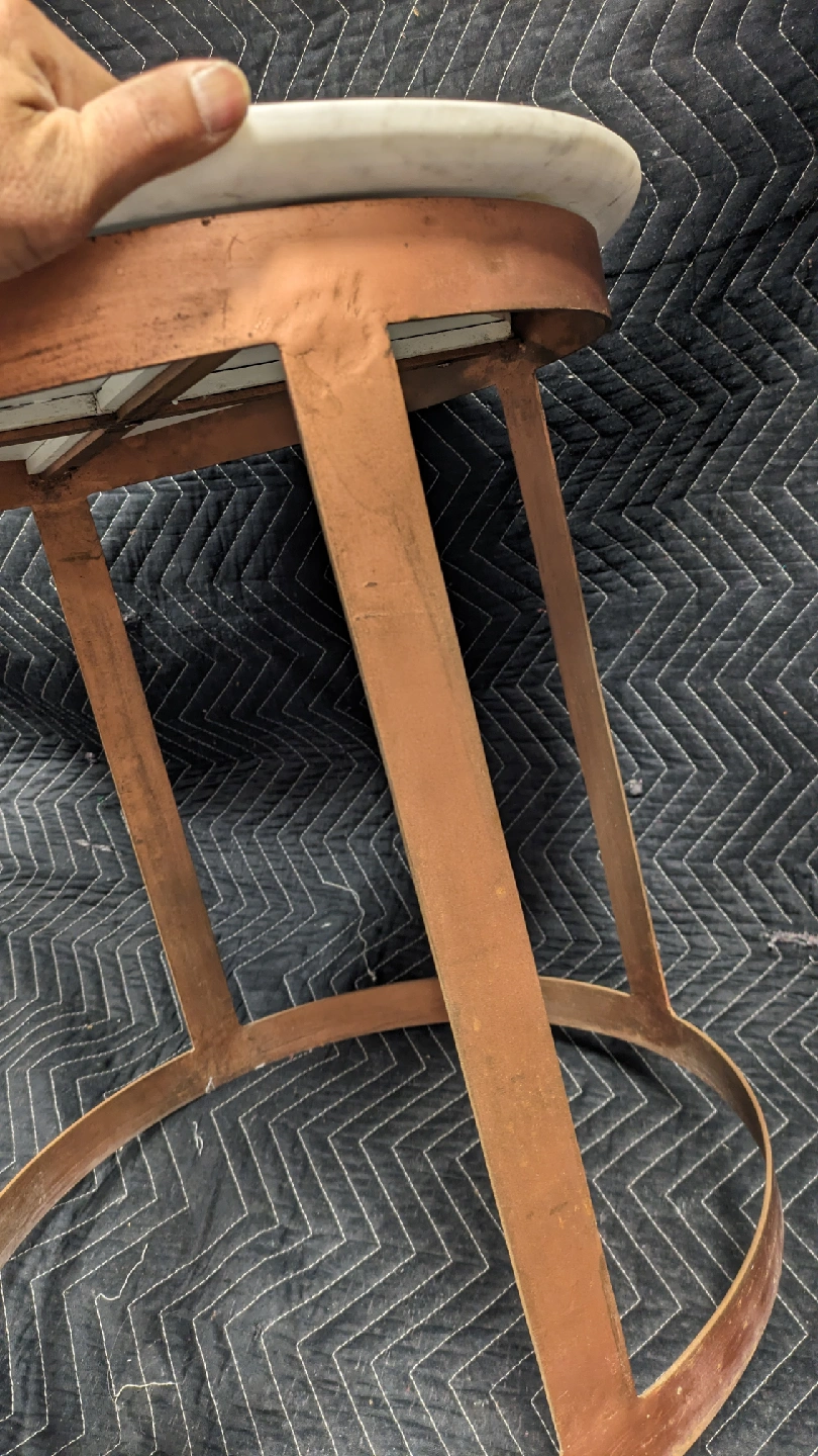 A charming round side table featuring a beautiful marble top and copper colored metal base. Sturdy and hefty, this table is perfect for adding a touch of elegance to any room!