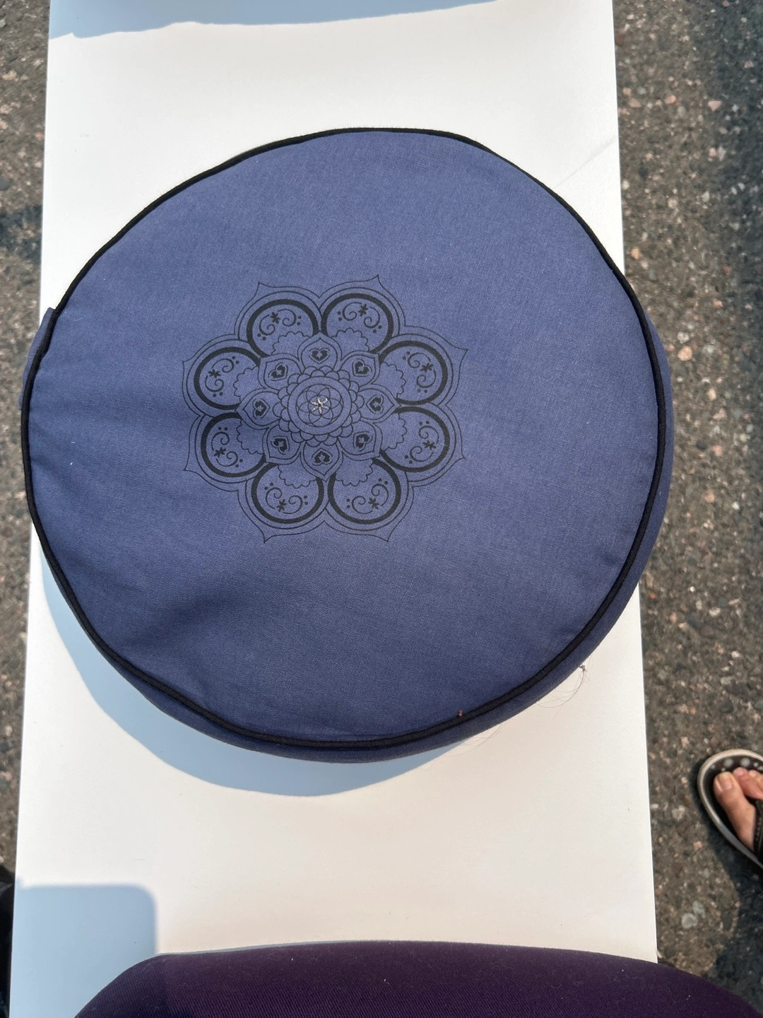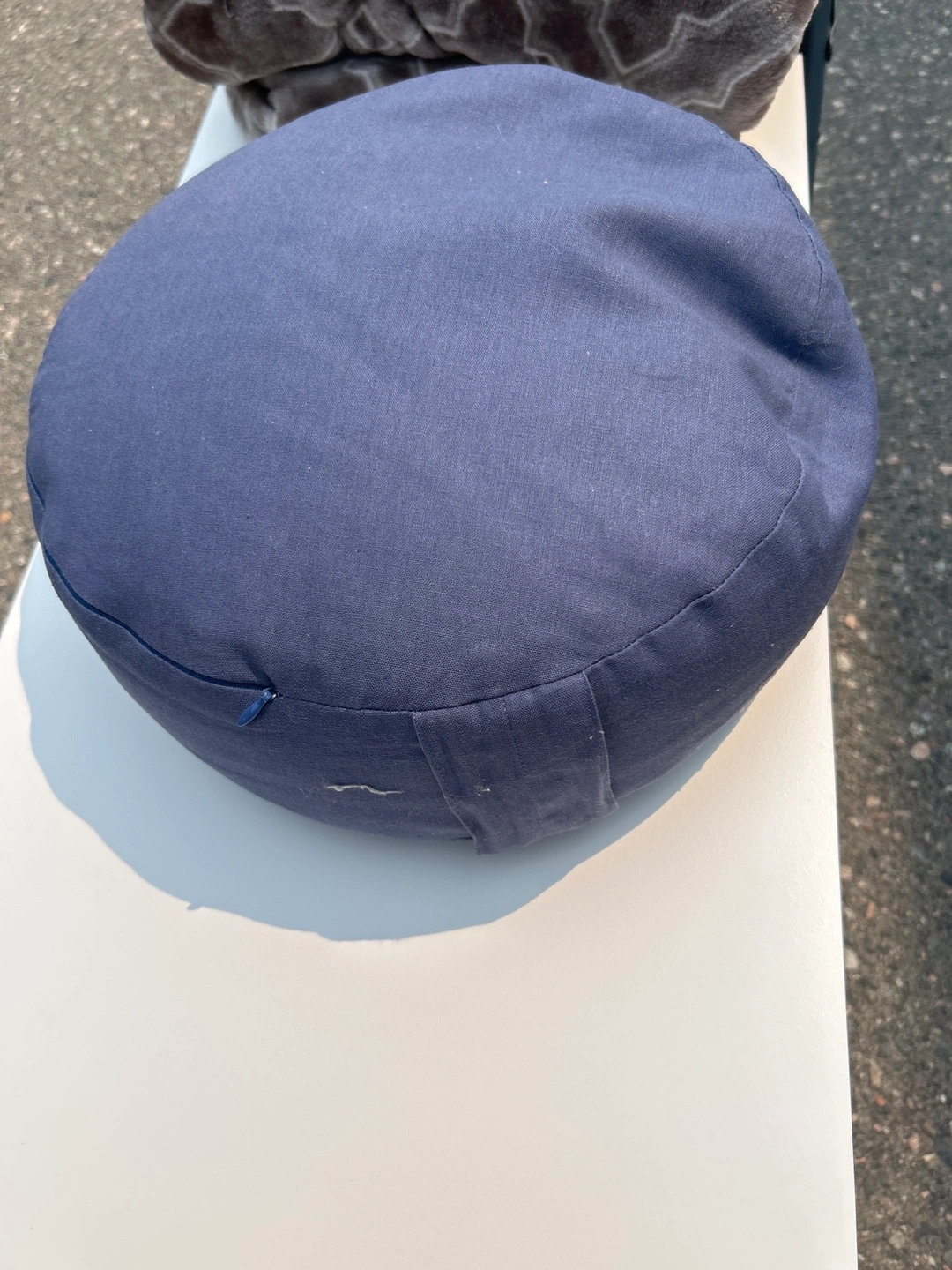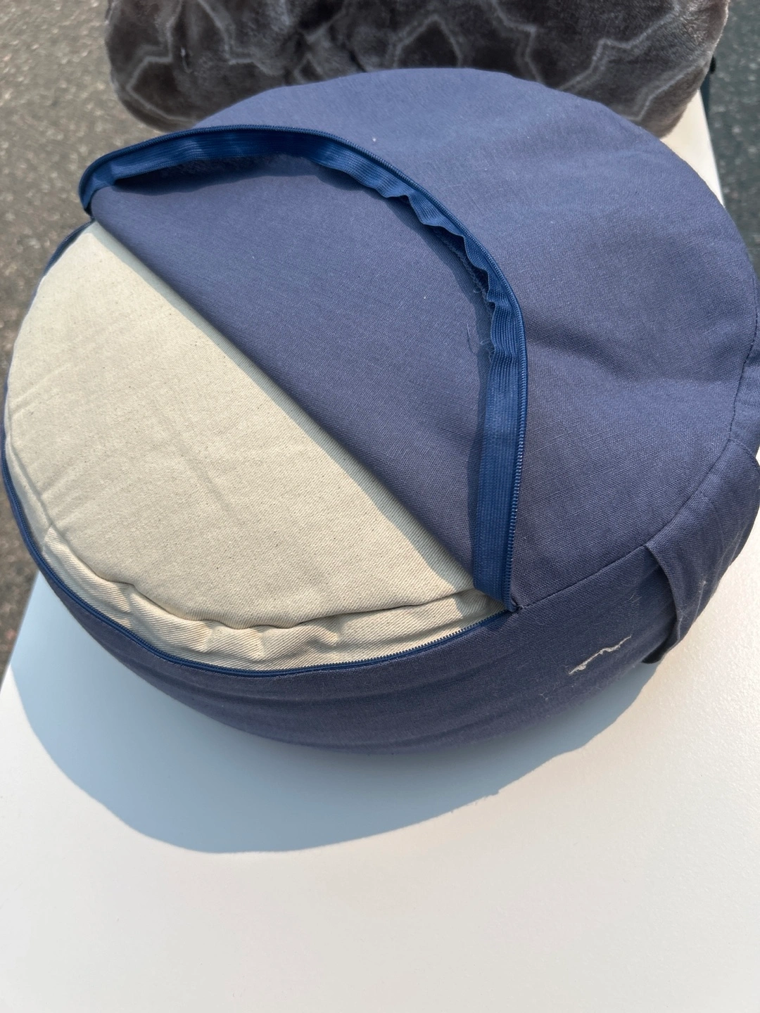 A beautiful round cushion, perfect for meditation. Dark blue colour, with a mandala design on top. Features a zipper. This cushion is perfect for cultivating mindfulness.
